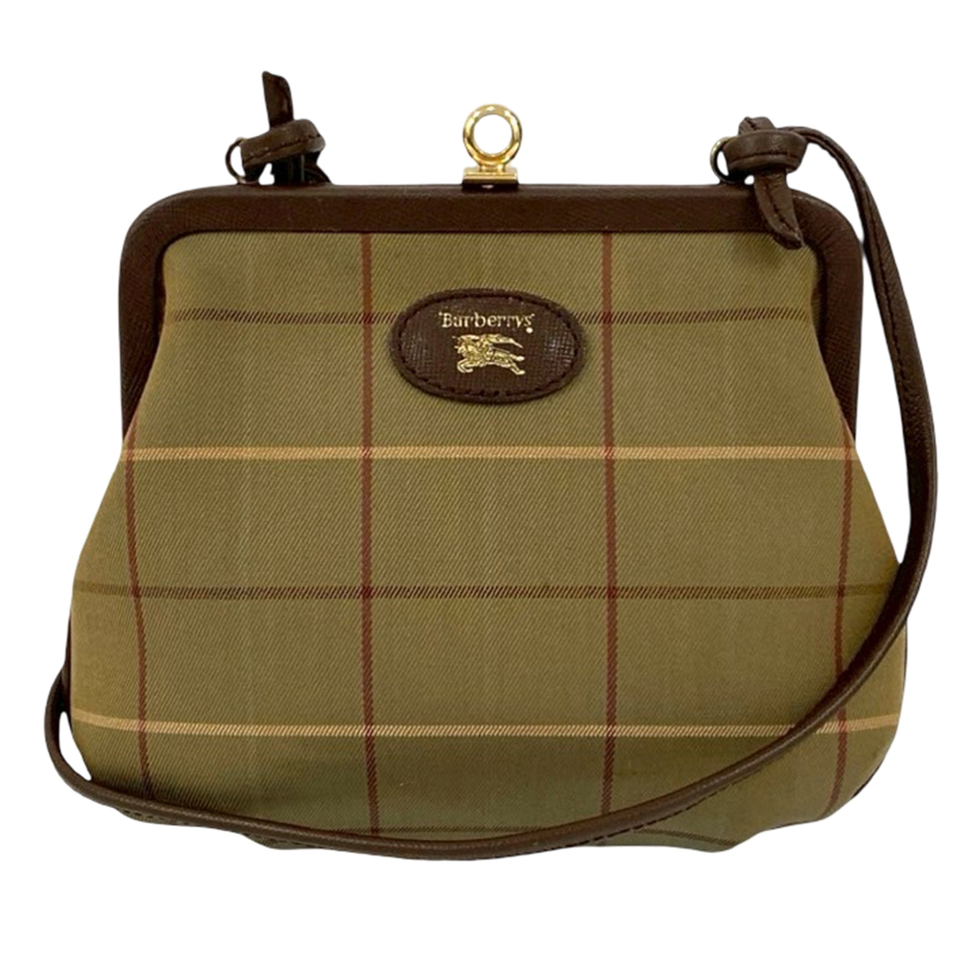 Product Details: Brown Burberry Vintage Check Canvas Crossbody. This crossbody bag features a canvas body with leather trim, a flat leather strap, a kiss lock closure, and an interior slip pocket. 5.7" L x 7.9" W x 2.2" D.