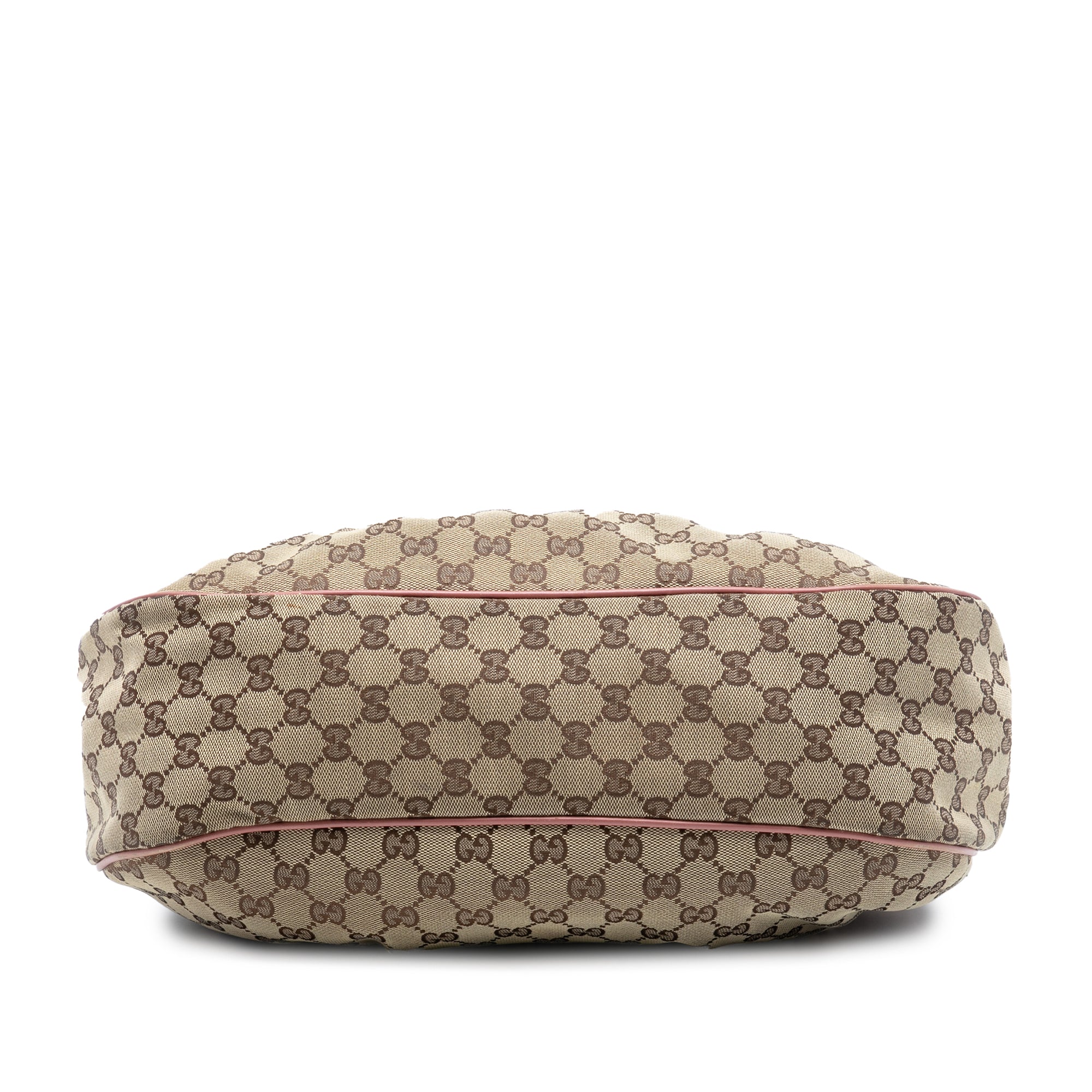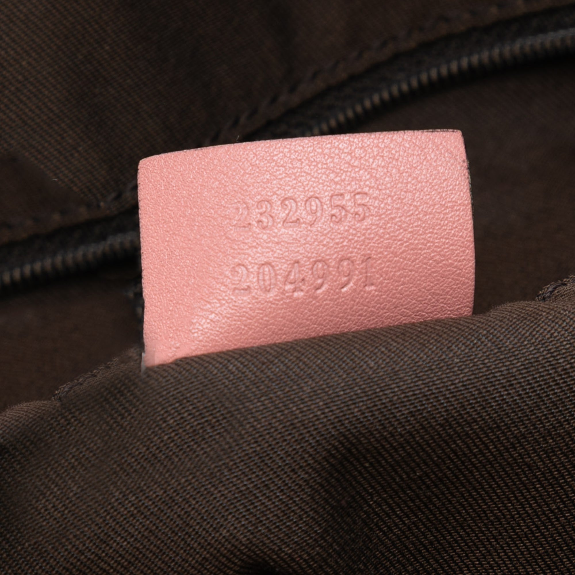 Product Details: Brown Gucci GG Canvas Sukey Shoulder Bag. The Sukey shoulder bag features a canvas body with leather trim, a flat leather strap, a top zip closure, and interior zip and slip pockets. 11.4" L x 13.2" W x 3.9" D. Serial number 232955 204991.