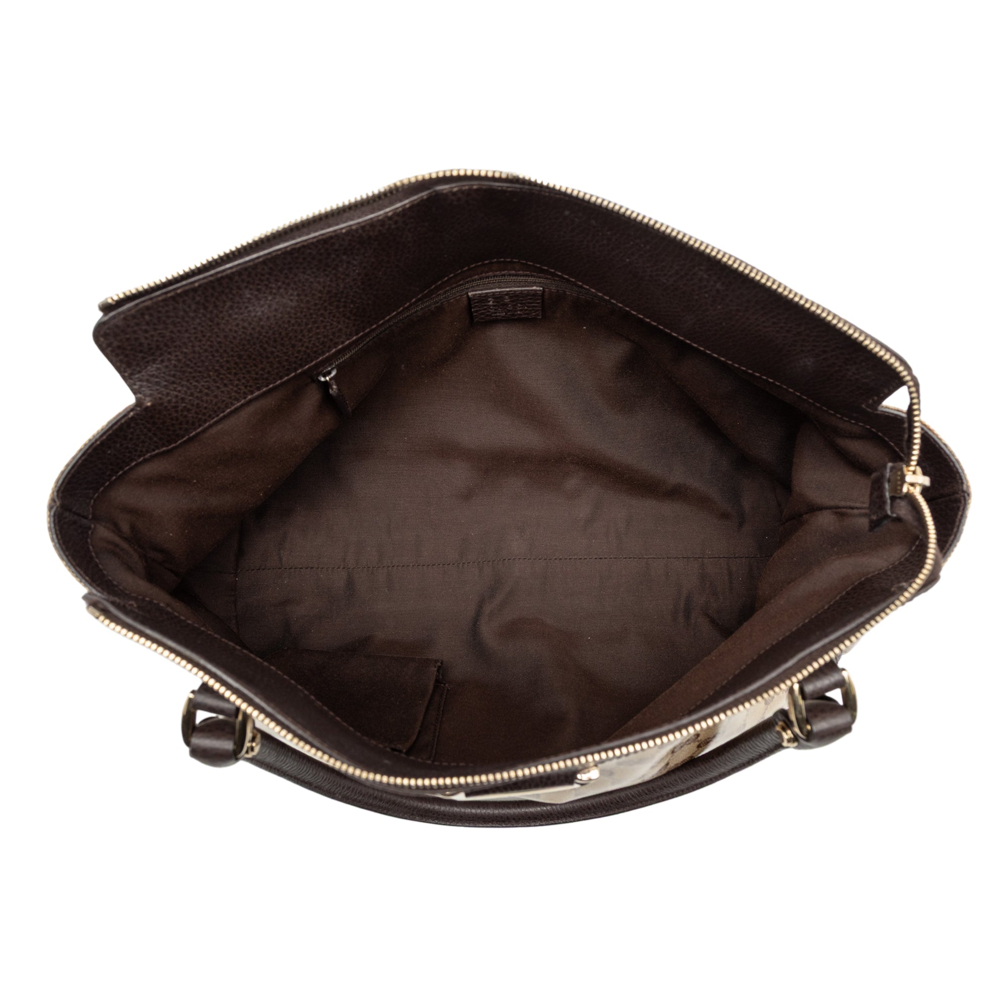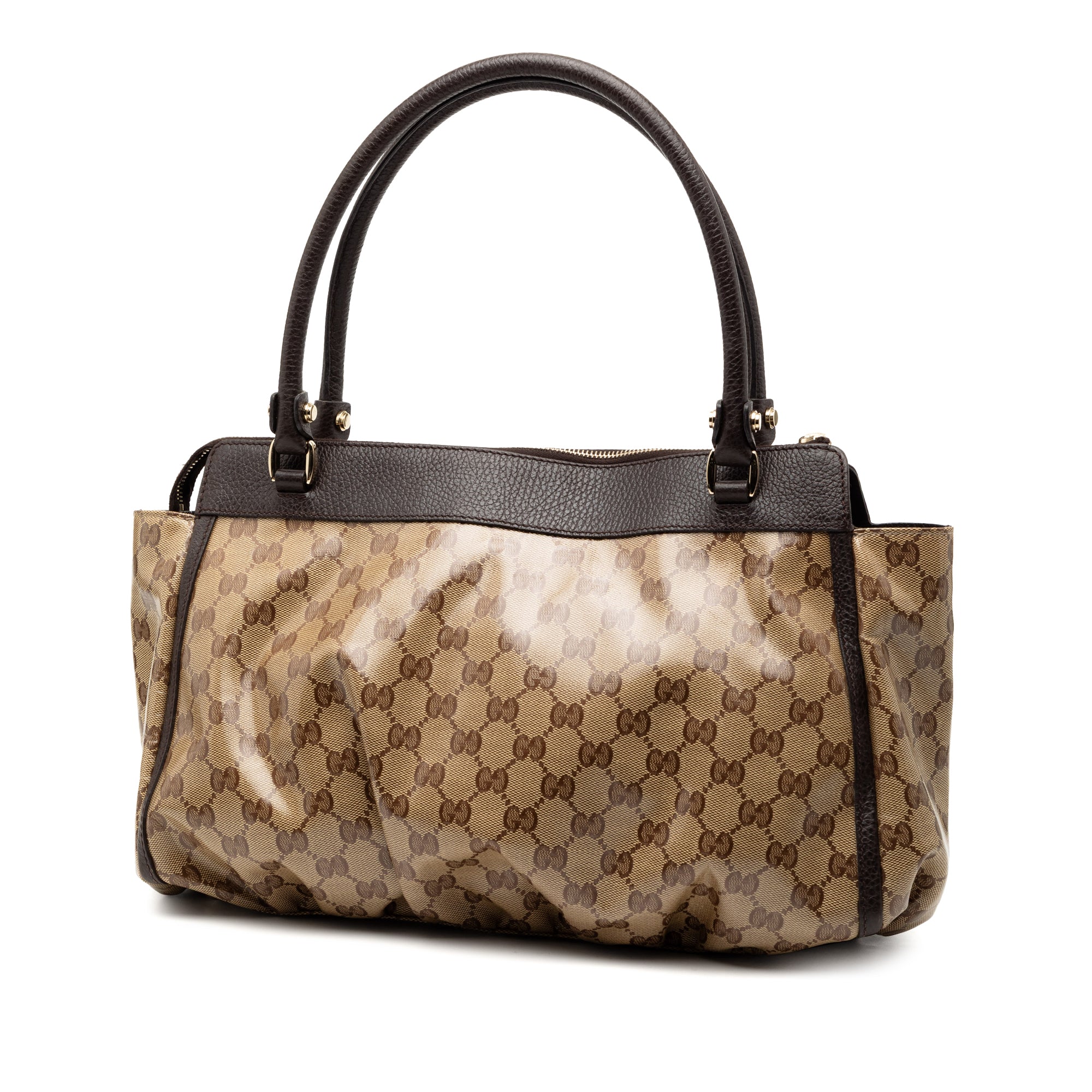 Product Details: Brown Gucci GG Crystal Abbey D Ring Tote. This tote bag features a coated canvas body with leather trim, rolled leather straps, a top zip closure, and an interior zip and slip pockets. 9.1" L x 13.4" W x 5.1" D, 6.7" drop. Serial number 327787.520981.