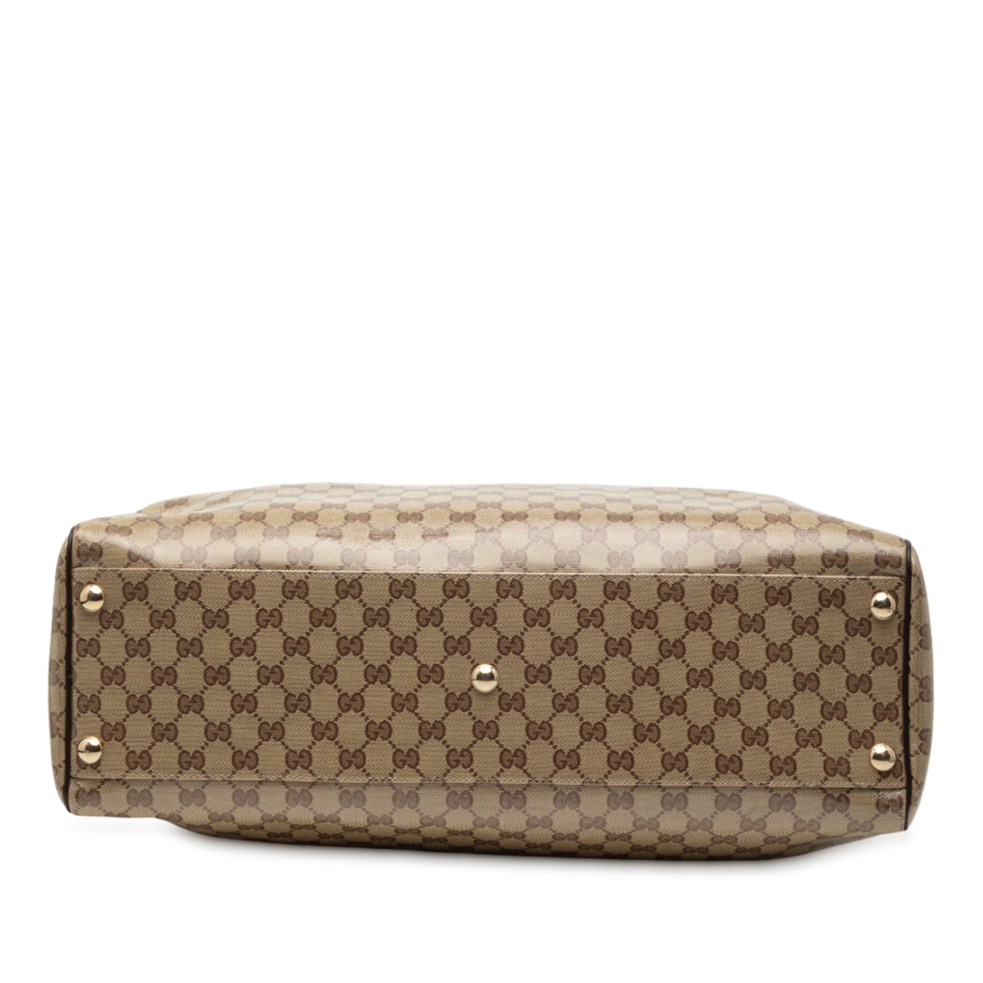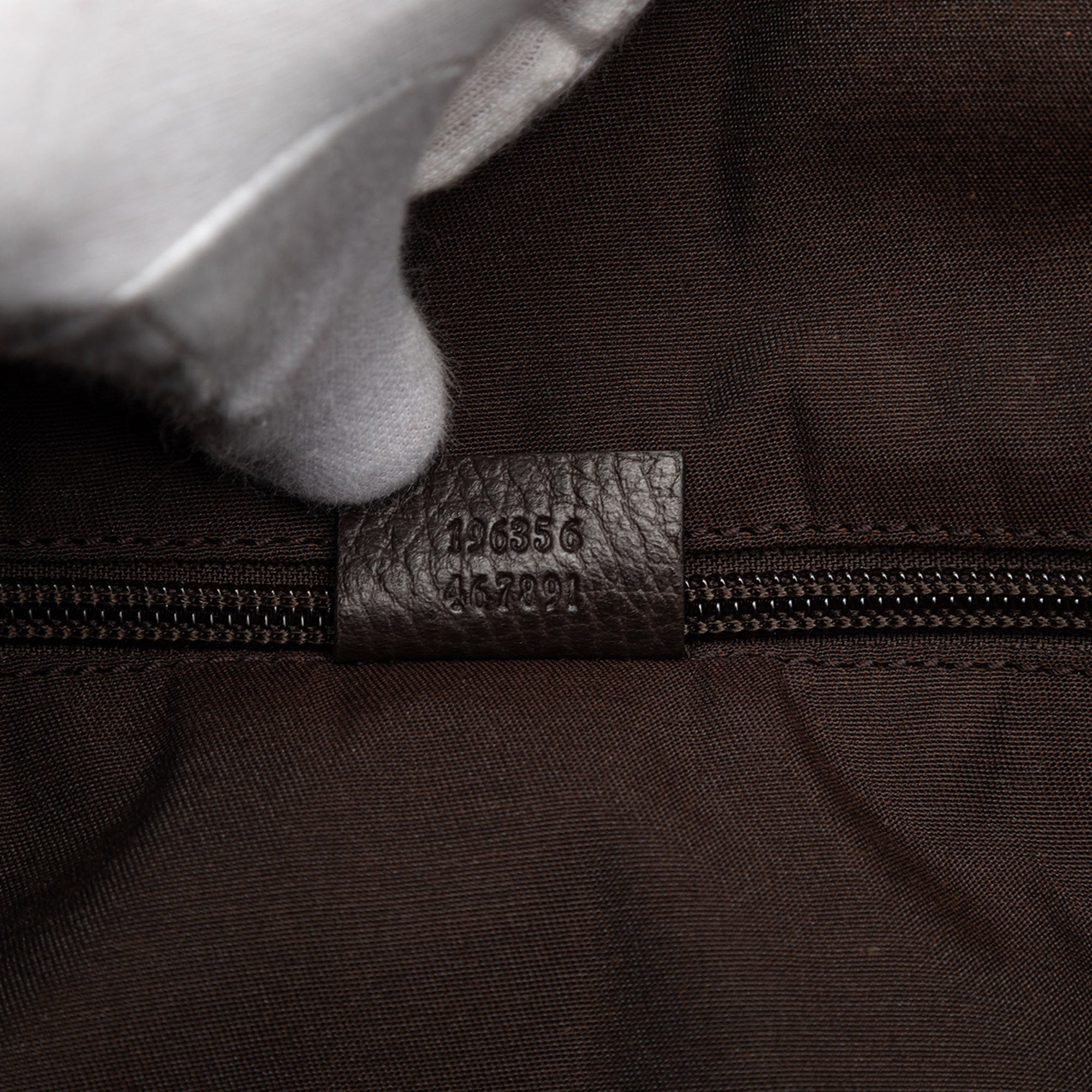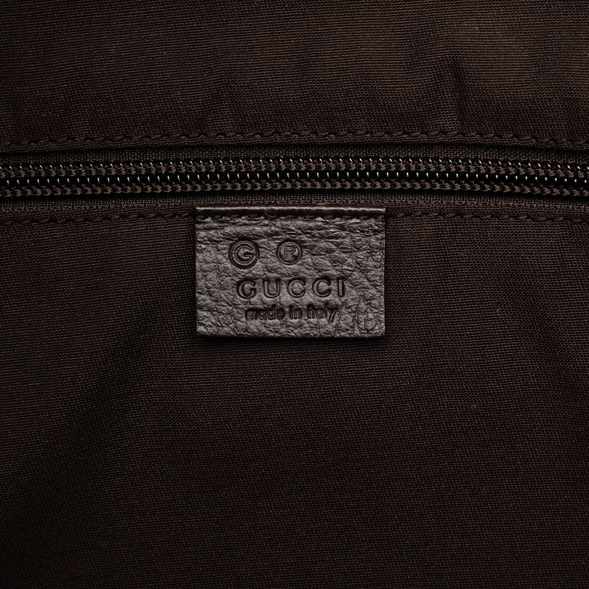 Product Details: Brown Gucci GG Crystal Duffle Bag. This travel bag features a coated canvas body, rolled leather handles, a detachable flat strap, a top zip closure, and an interior zip pocket. 11.8" L x 18.9" W x 5.9" D, 3.1" drop. Serial number 196356 467891.