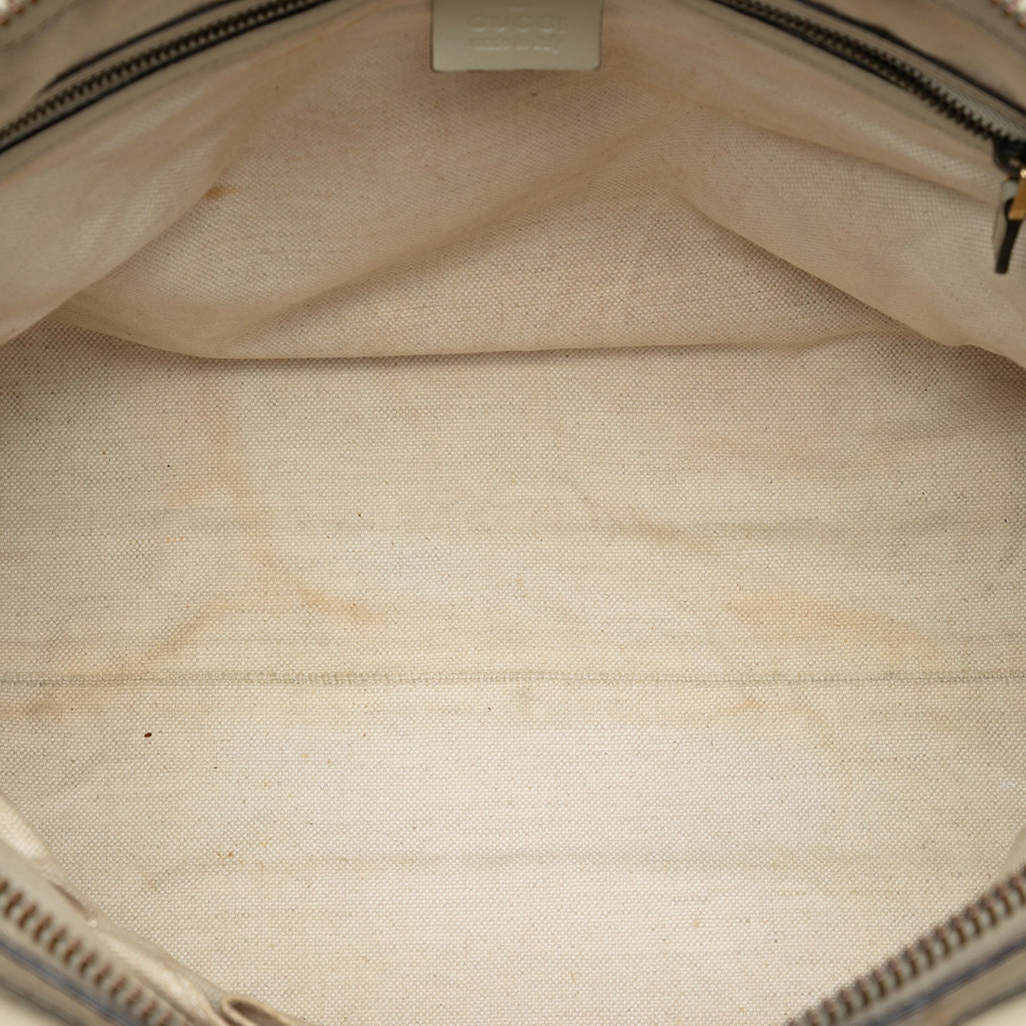 Product Details: Brown Gucci Medium Guccissima Scarlett Satchel. This satchel features an embossed leather body, rolled leather handles, a detachable flat strap, a top zip closure, and interior zip and slip pockets. 11.4" L x 12.6" W x 6.3" D, 5.9" drop. Serial number 282299 486628.