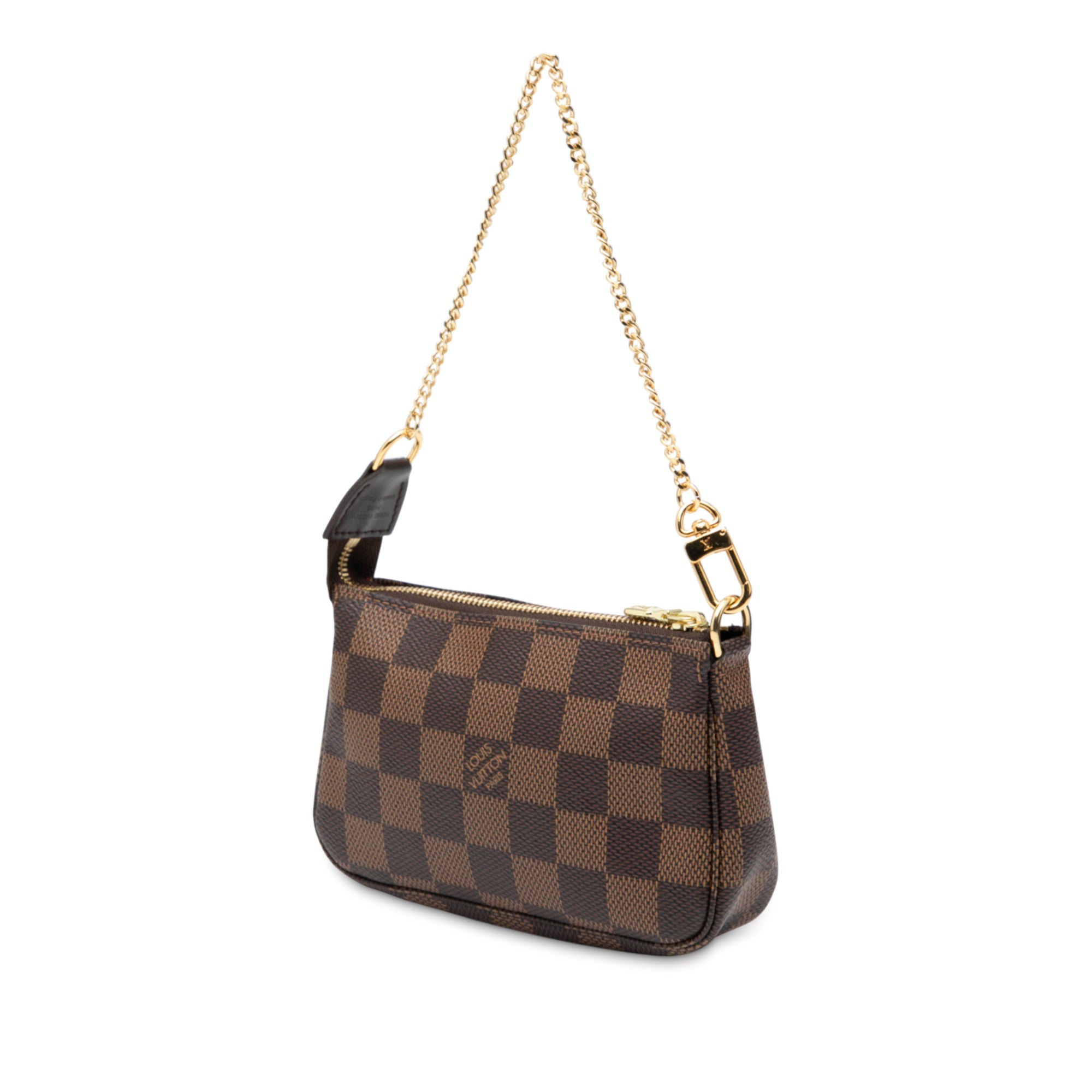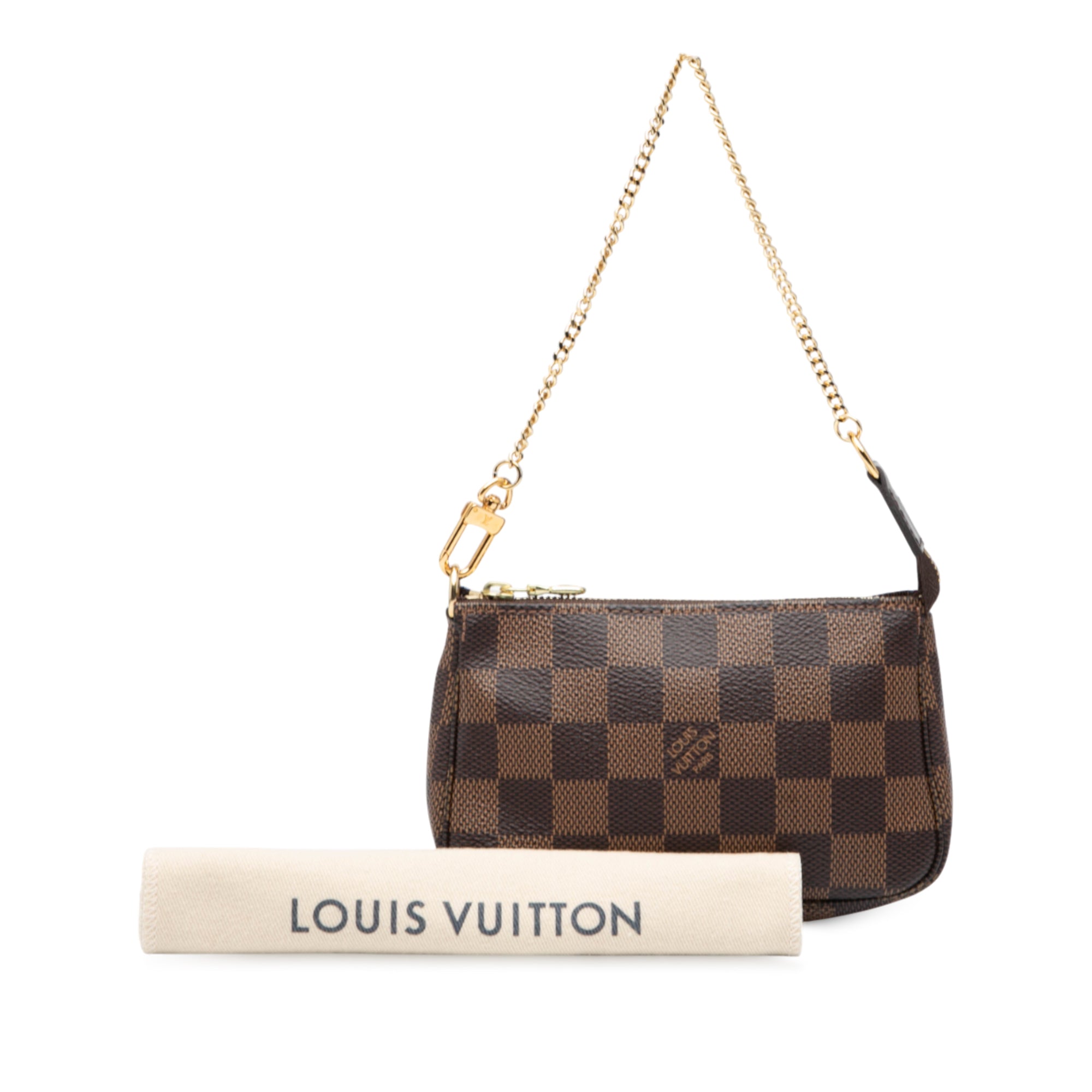 Product Details: Brown Louis Vuitton Damier Ebene Mini Pochette Accessoires Handbag. The Mini Pochette Accessoires features a damier canvas body, a gold-tone chain strap, and a top zip closure. 3.9" L x 5.7" W x 1.2" D. Serial number SF1201.