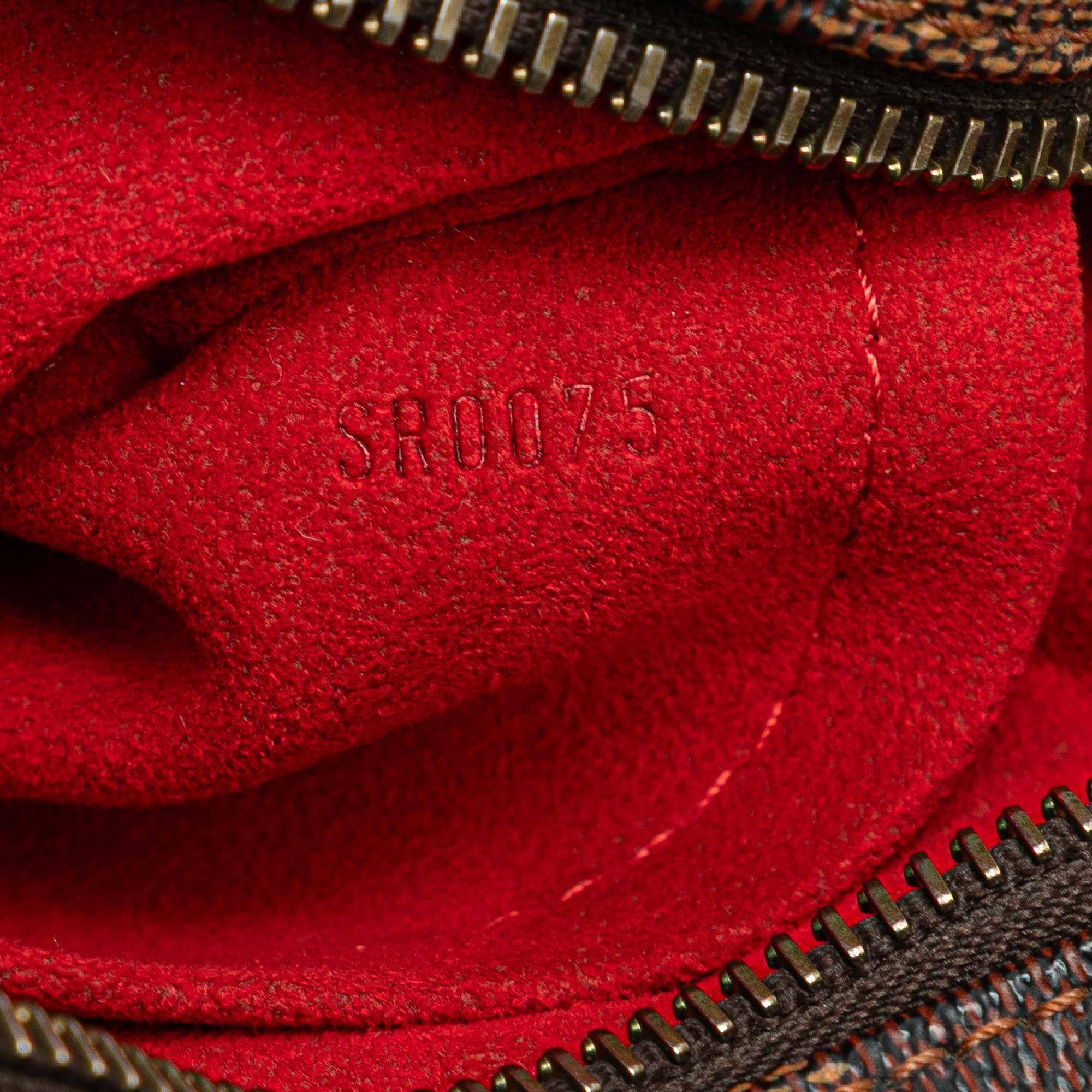 Product Details: Brown Louis Vuitton Damier Ebene Rift Crossbody Bag. The Rift features a damier ebene canvas body, an exterior front slip pocket with snap button closure, a flat leather strap, a top zip closure, and an interior slip pocket. 6.1" L x 5.3" W x 1.6" D. Serial number SR0075.