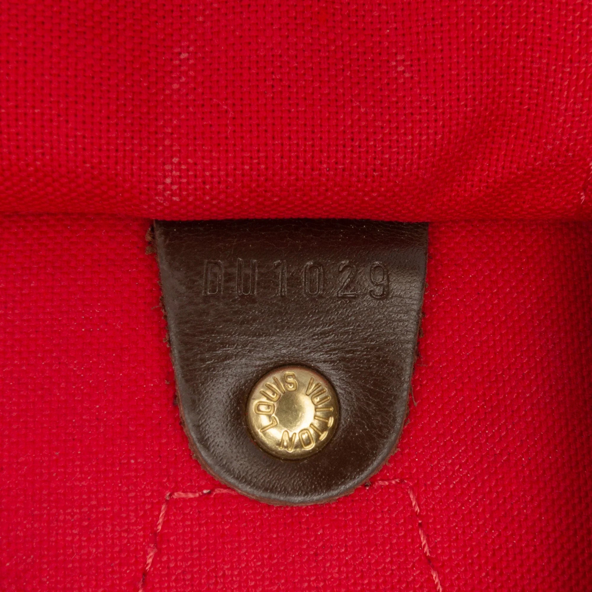 Product Details: Brown Louis Vuitton Damier Ebene Speedy 30 Boston Bag. The Speedy 30 features a damier ebene canvas body, rolled leather handles, a top zip closure, and an interior slip pocket. 9.4" L x 12.2" W x 6.7" D, 3.3" drop. Serial number DU1029.