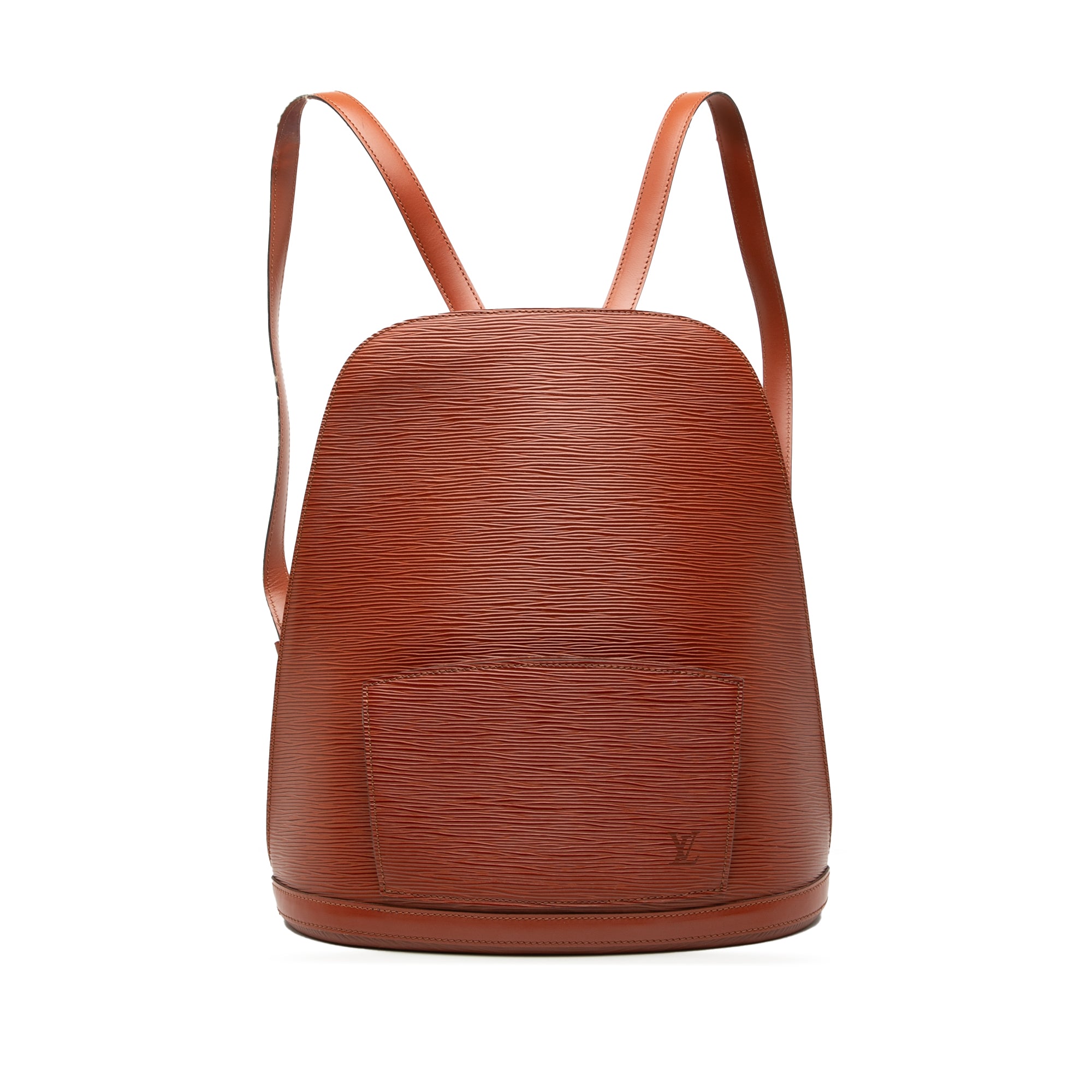 Product Details: Brown Louis Vuitton Epi Gobelins Backpack. The Gobelins features an epi leather body, adjustable flat back straps, a two-way zip around closure, an exterior zip pocket, and an interior slip pocket. 13.4" L x 12.2" W x 5.5" D, 1.4" drop. Serial number VI0936.