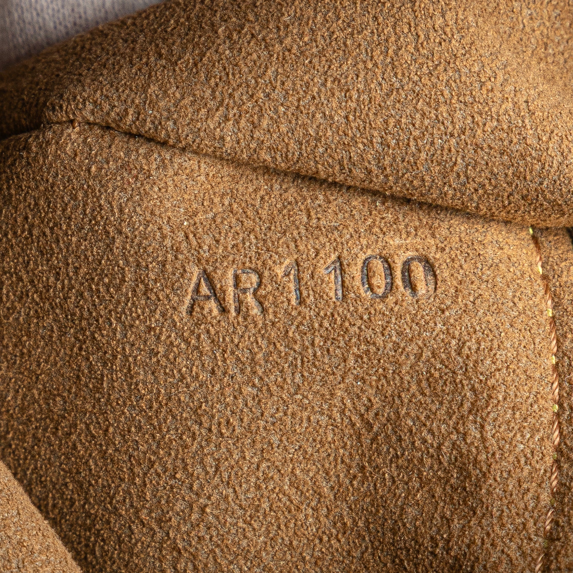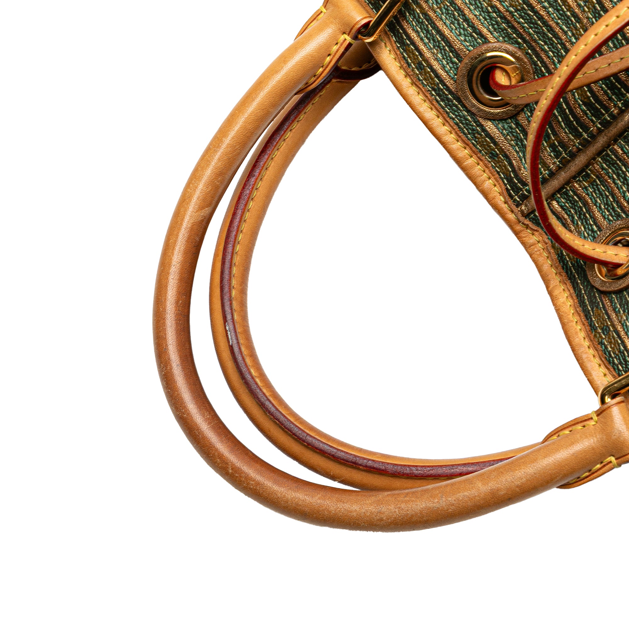 Product Details: Brown Louis Vuitton Monogram Eden Neo Bucket Bag. The Eden Neo features a striped metallic monogram canvas body with vachetta leather trim, rolled vachetta leather handles, a top drawstring closure, and an interior zip pocket. 11" L x 11.8" W x 9.1" D. Serial number AR1100.