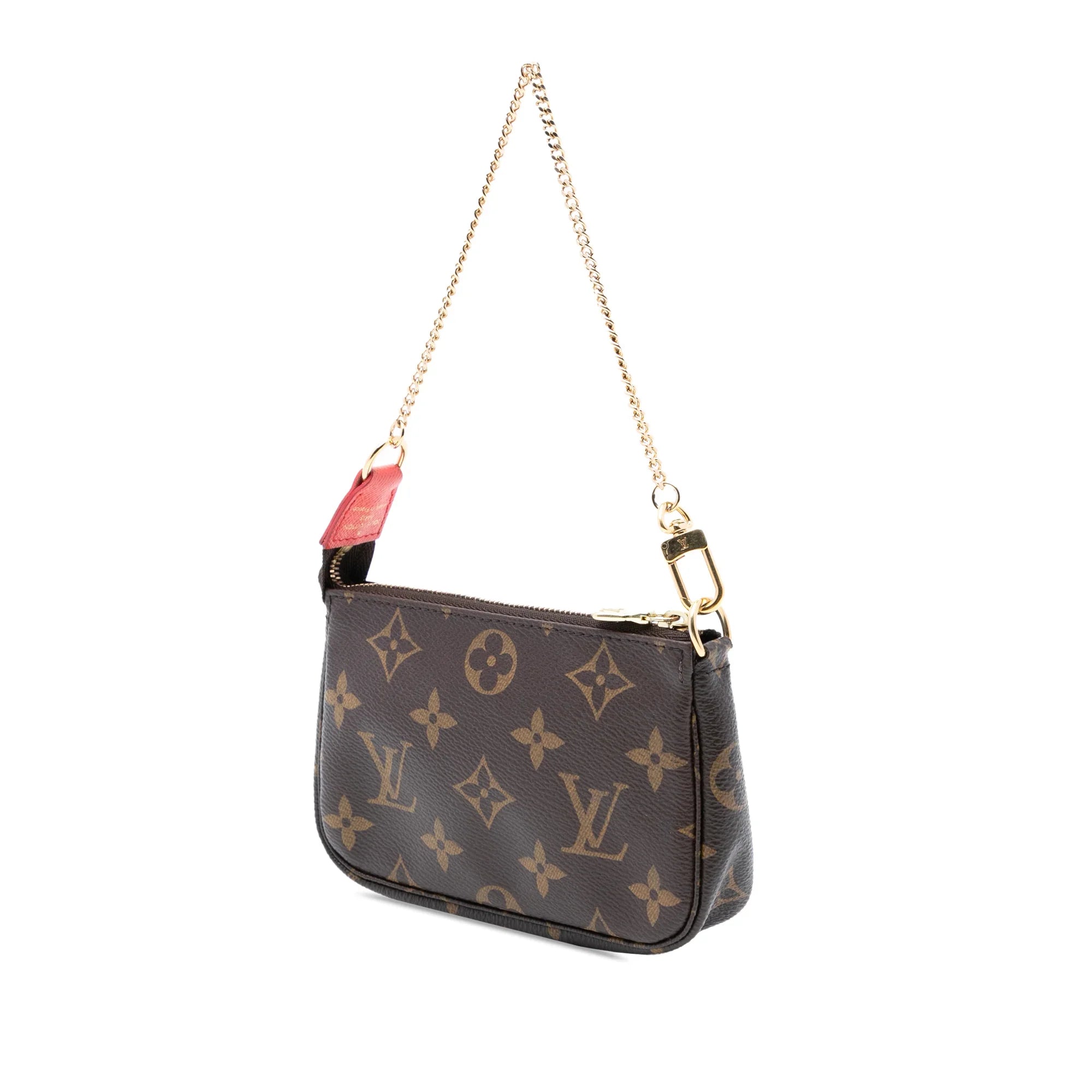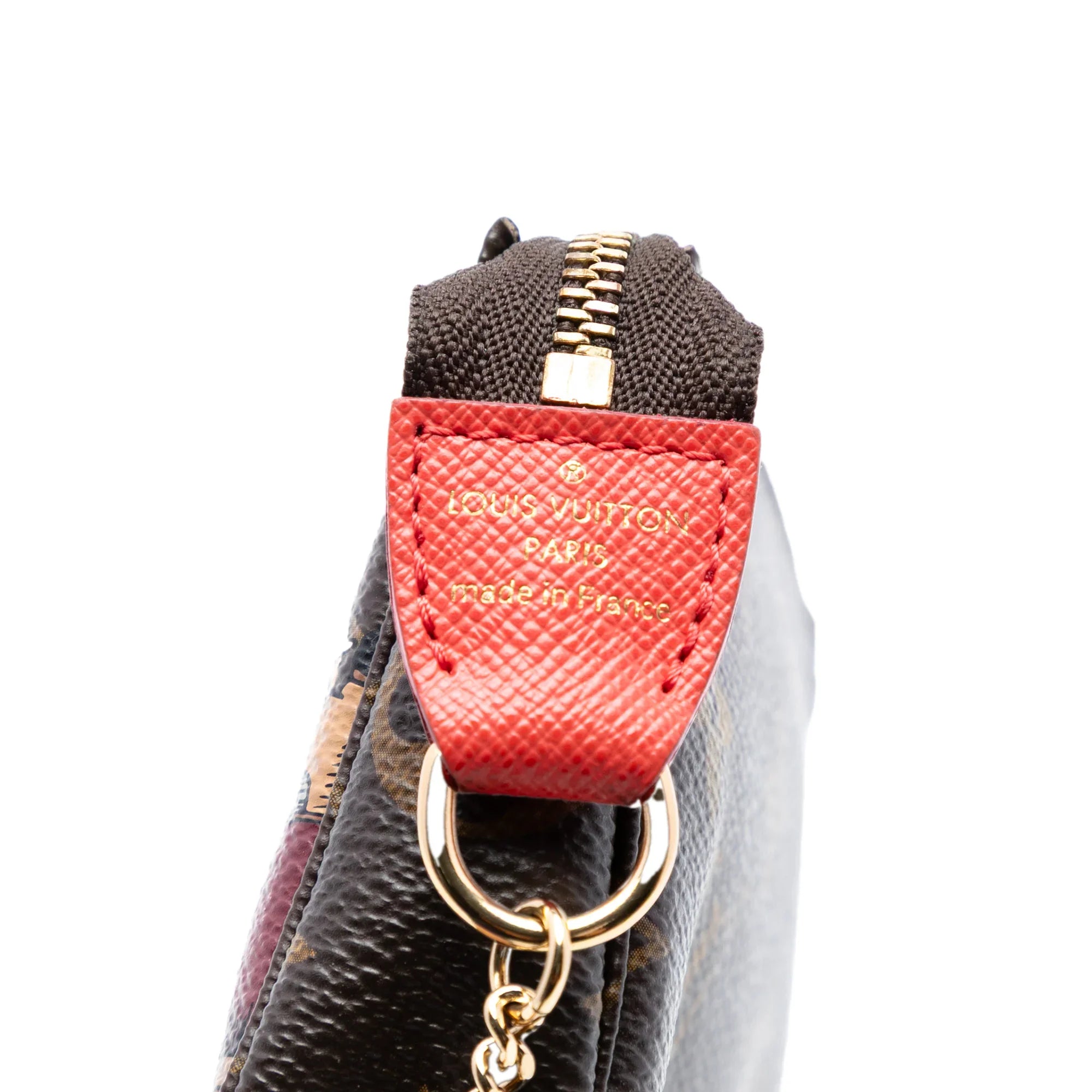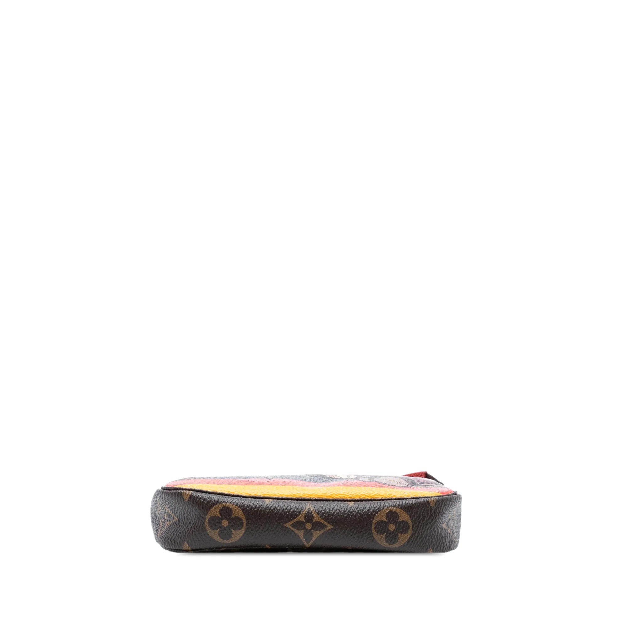 Product Details: Brown Louis Vuitton Monogram Evasion Illustre Mini Pochette Accessories Handbag. The Christmas Animation Mini Pochette Accessories features a printed monogram canvas body, a gold-tone chain link handle, and a top zip closure. 3.9" L x 5.5" W x 0.8" D, 5.5" drop. Serial number SF3175.