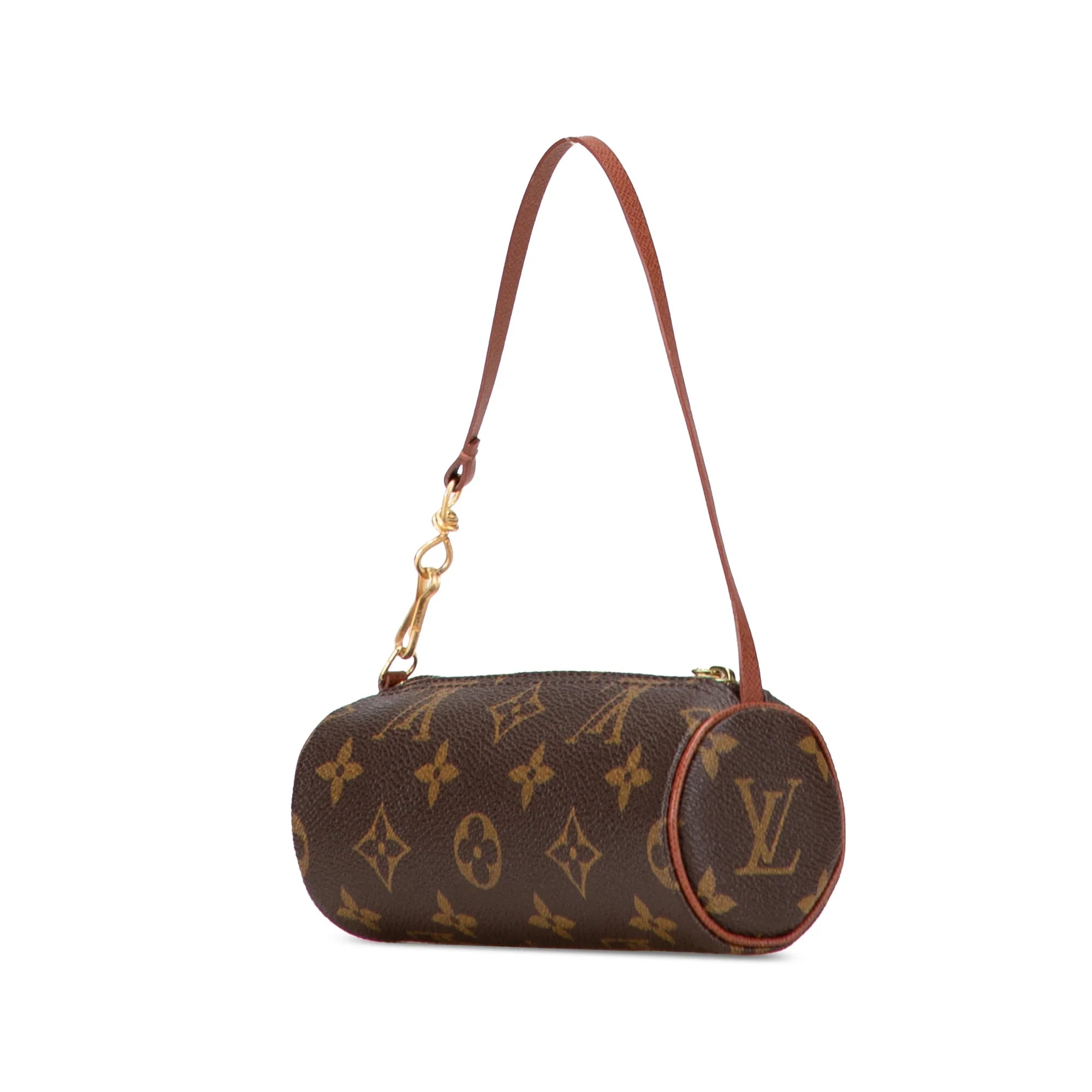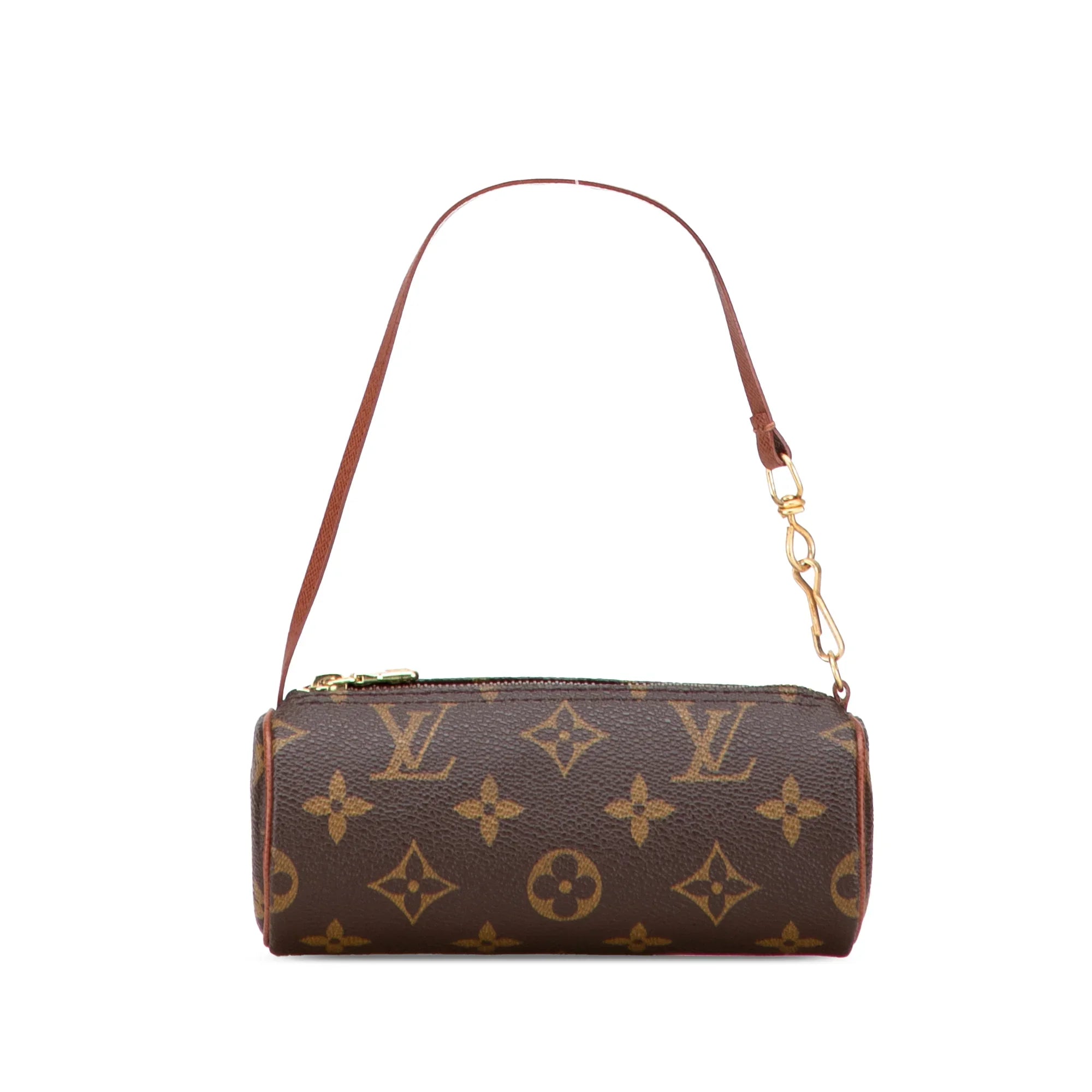 Product Details: Brown Louis Vuitton Monogram Papillon Pochette Handbag. The Papillon Pochette features a monogram canvas body with leather trim, a detachable leather strap, and a top zip closure. 2.4" L x 6.1" W x 2.4" D.