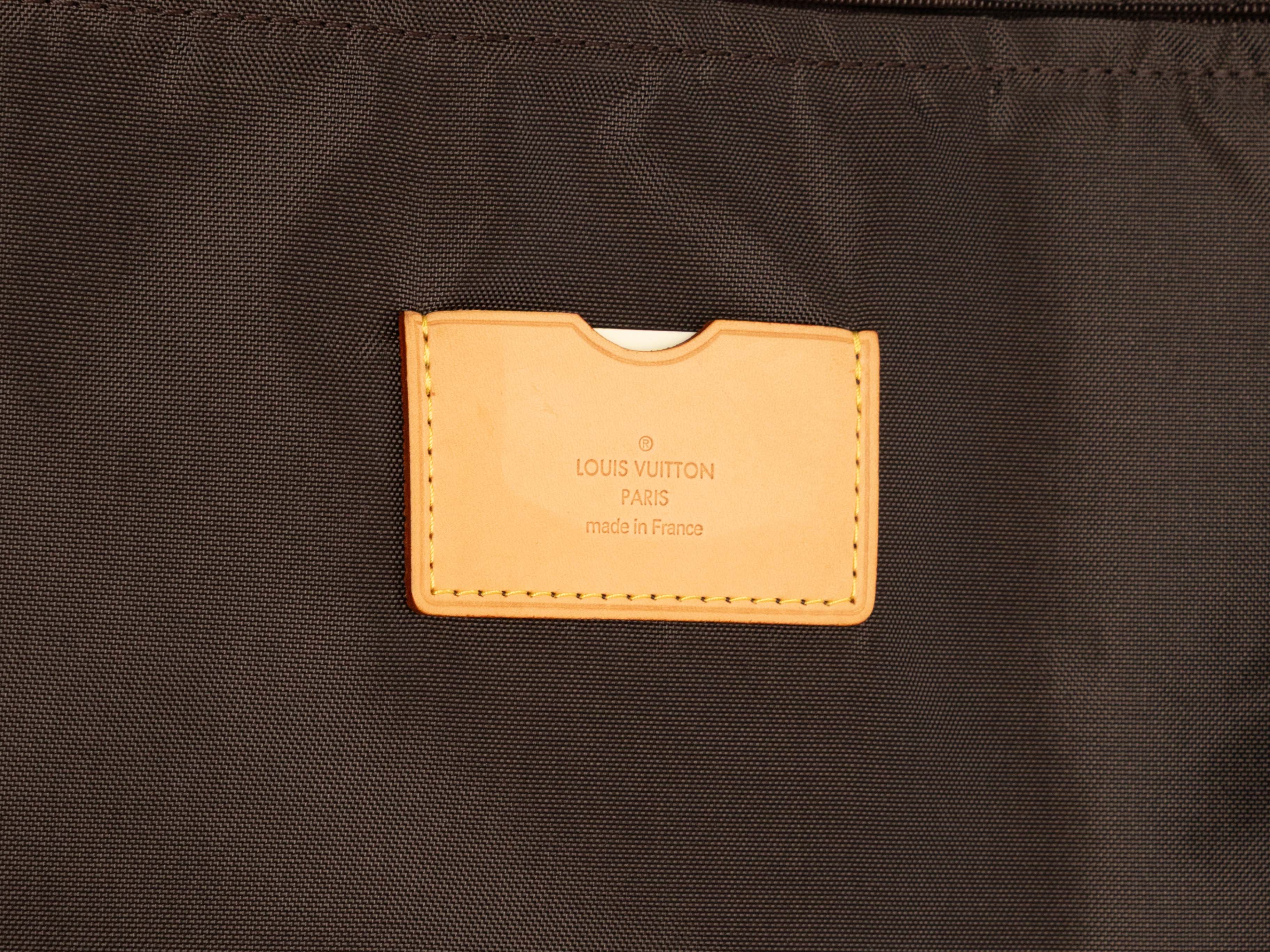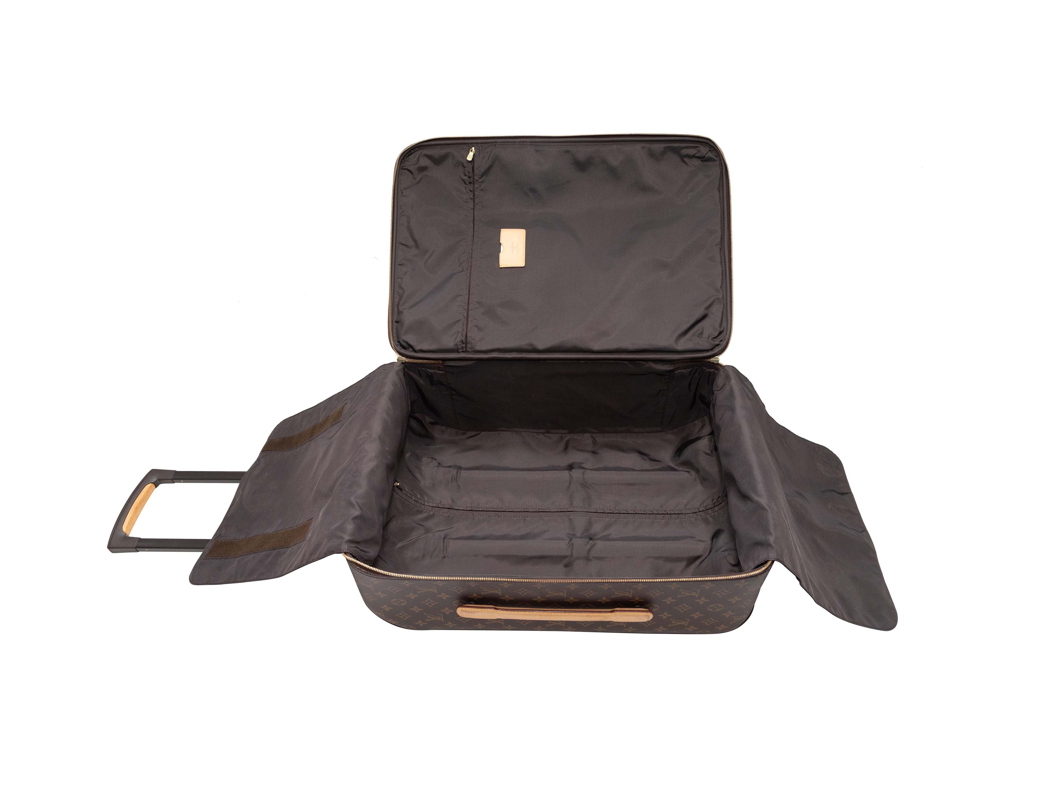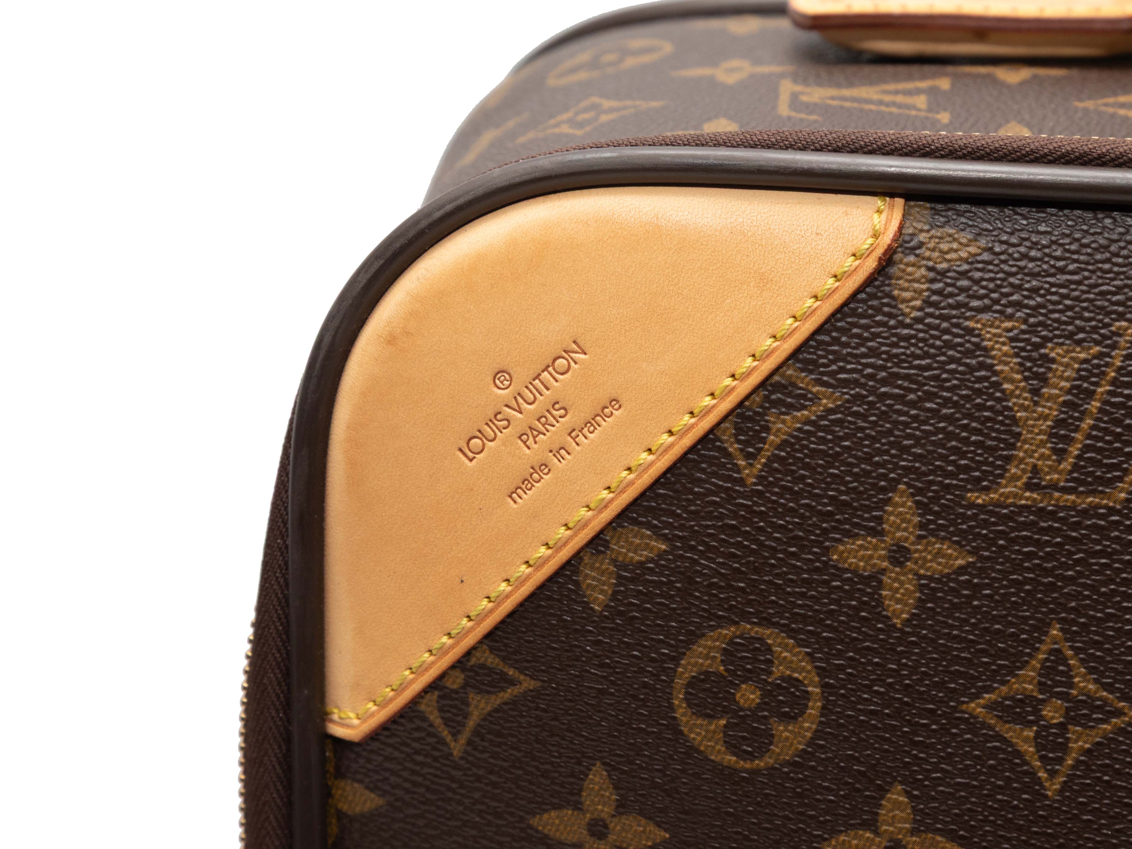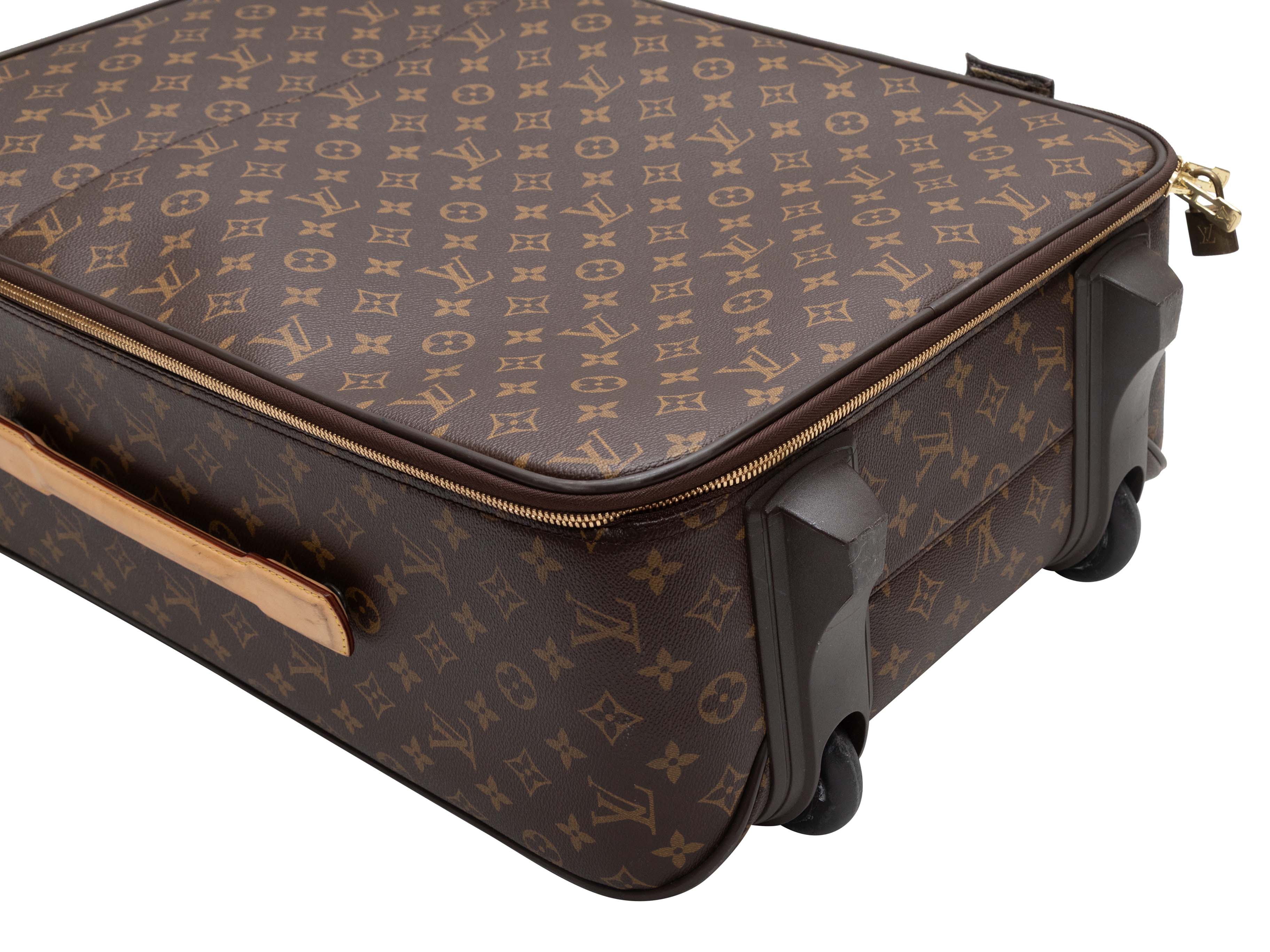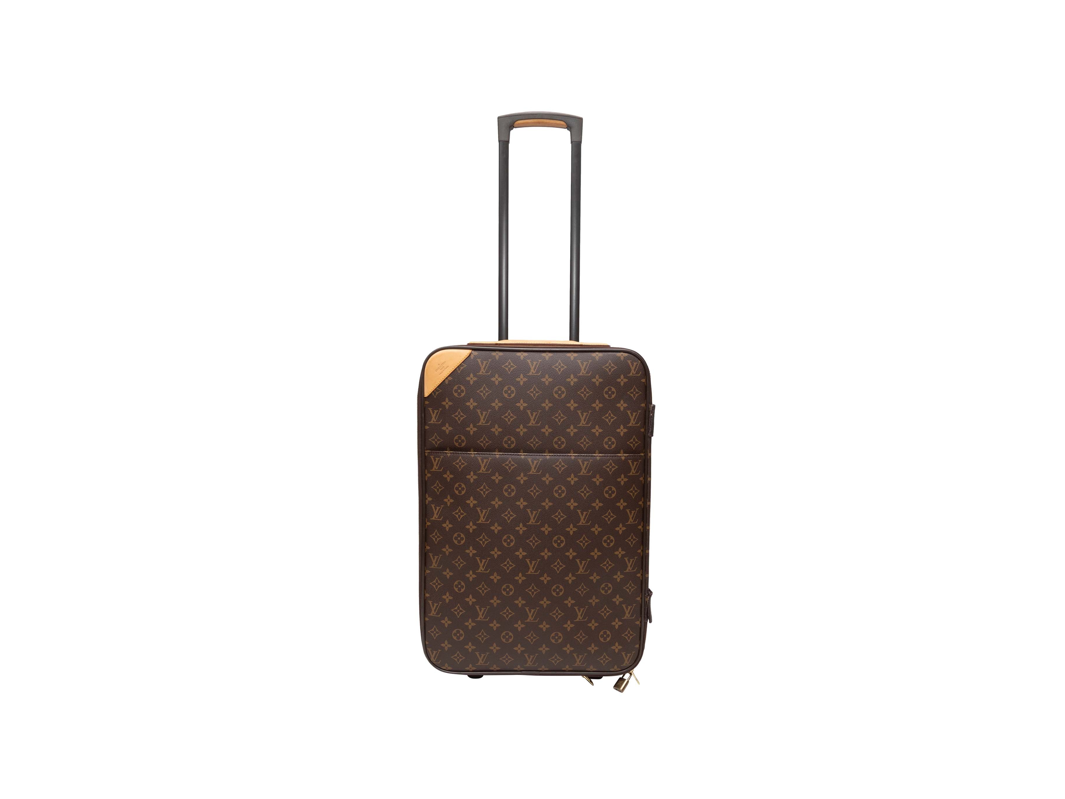 Product Details: Brown Louis Vuitton Monogram Pegase 55 Carry-On Suitcase. The Pegase 55 Carry-On Suitcase features a monogram coated canvas body, leather trim, gold-tone hardware, roller wheels at one end, an extendable handle, and a top zip closure. 14.5" L x 21" H x 7" D, 16" handle drop.