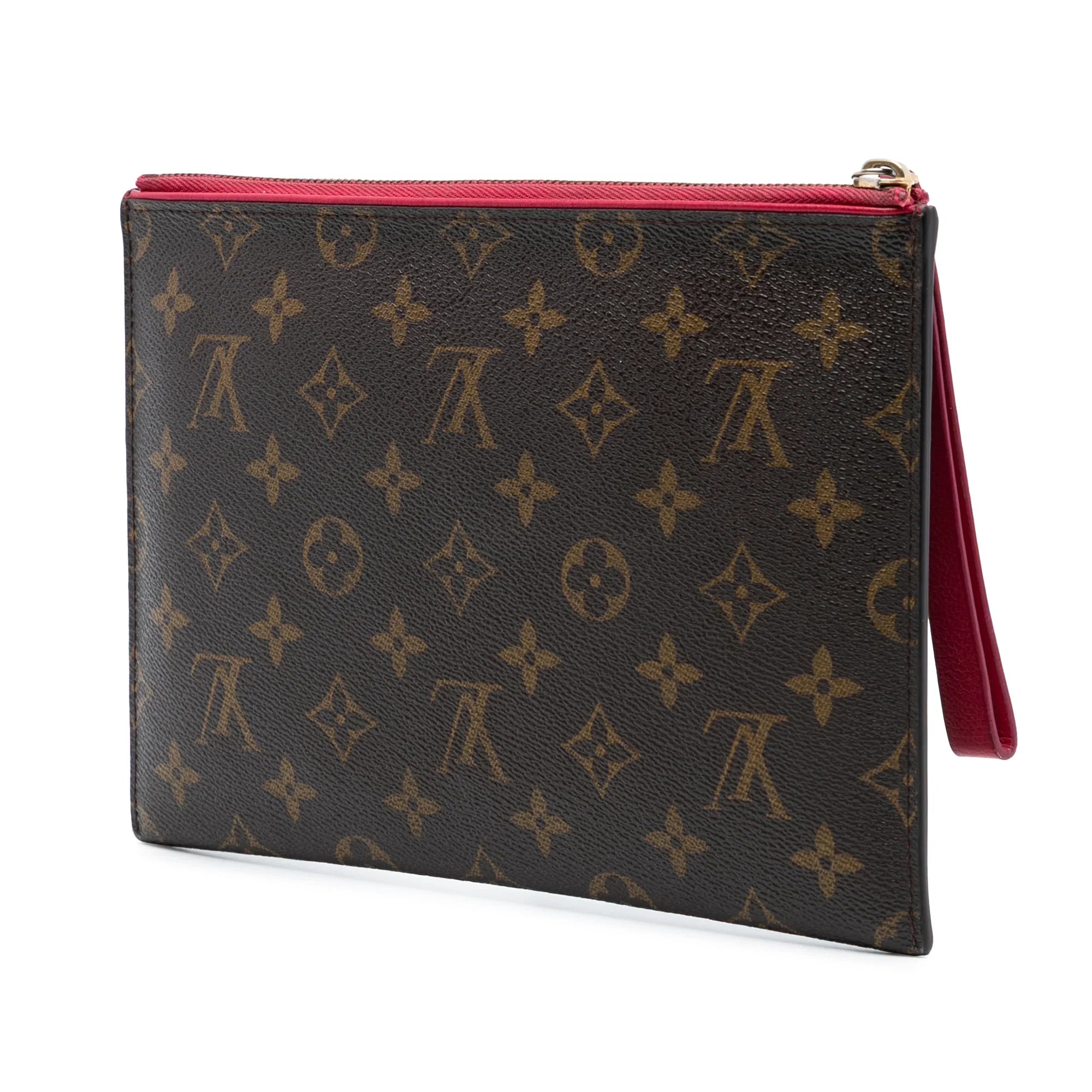 Product Details: Brown Louis Vuitton Monogram Pochette Pallas Clutch Bag. The Pochette Pallas features a monogram body, a flat leather wrist strap, a top zip closure, an interior front slip pocket, and interior card slots. 6.7" L x 9.6" W x 0.2" D. Serial number MI1114.