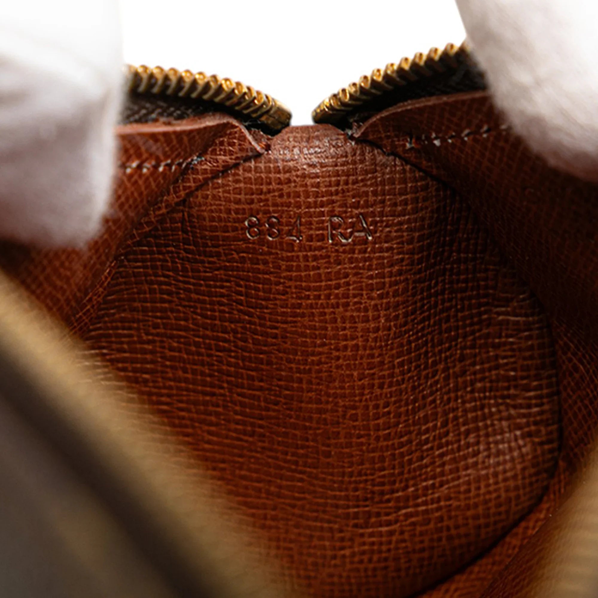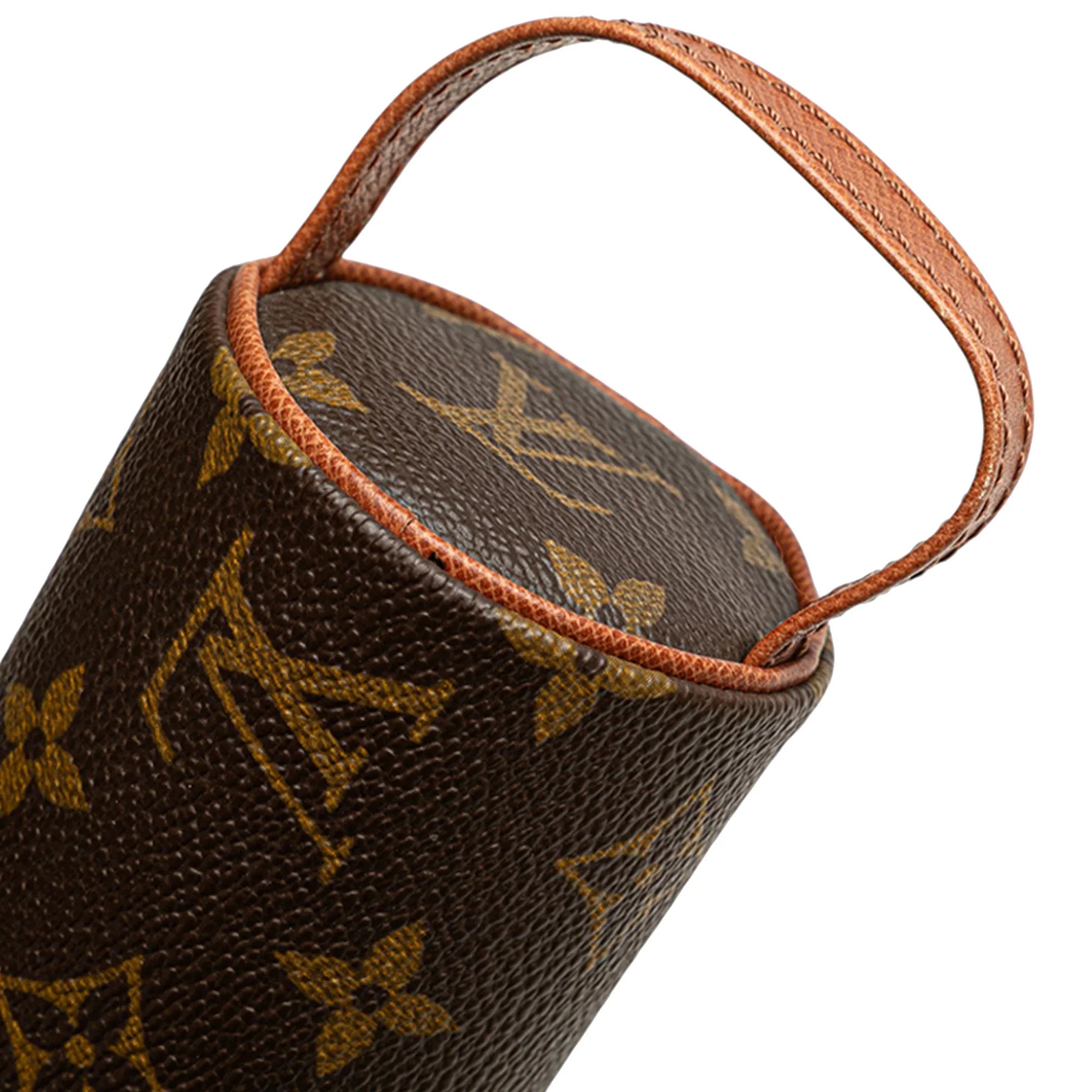 Product Details: Brown Louis Vuitton Monogram Trousse Ronde Pencil Case 20 Pouch. This pouch features a monogram canvas body with leather trim, a side leather handle, and a top zip closure. 2.6" L x 7.9" W x 2.6" D, 1.6" drop. Serial number 884 RA.