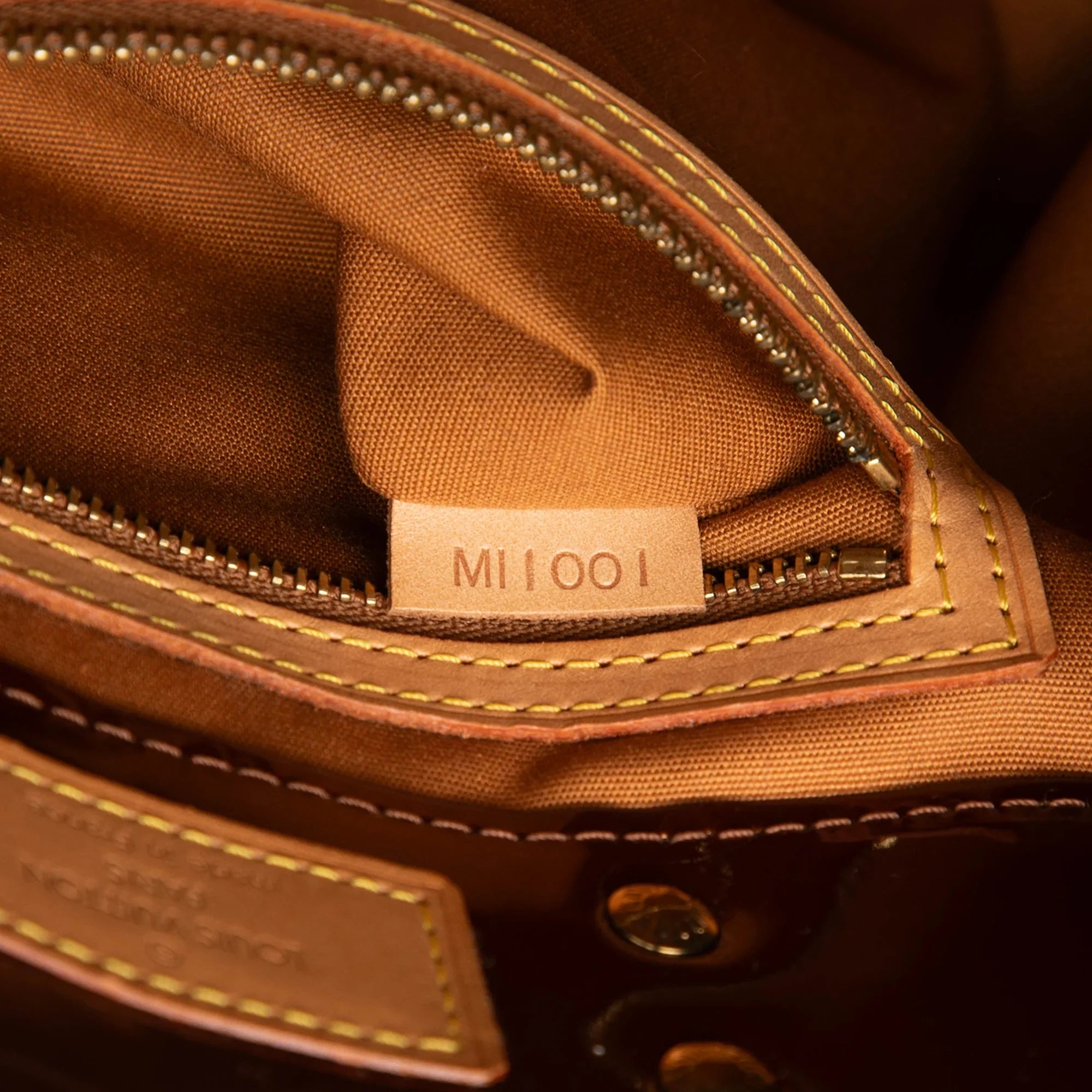 Product Details: Brown Louis Vuitton Monogram Vernis Reade PM Handbag. The Reade PM features a vernis leather body, flat vachetta leather handles, an open top, and an interior zip pocket. Handles have been re-glossed. 7.1" L x 8.7" W x 3.9" D, 3.9" drop. Serial number MI1001.