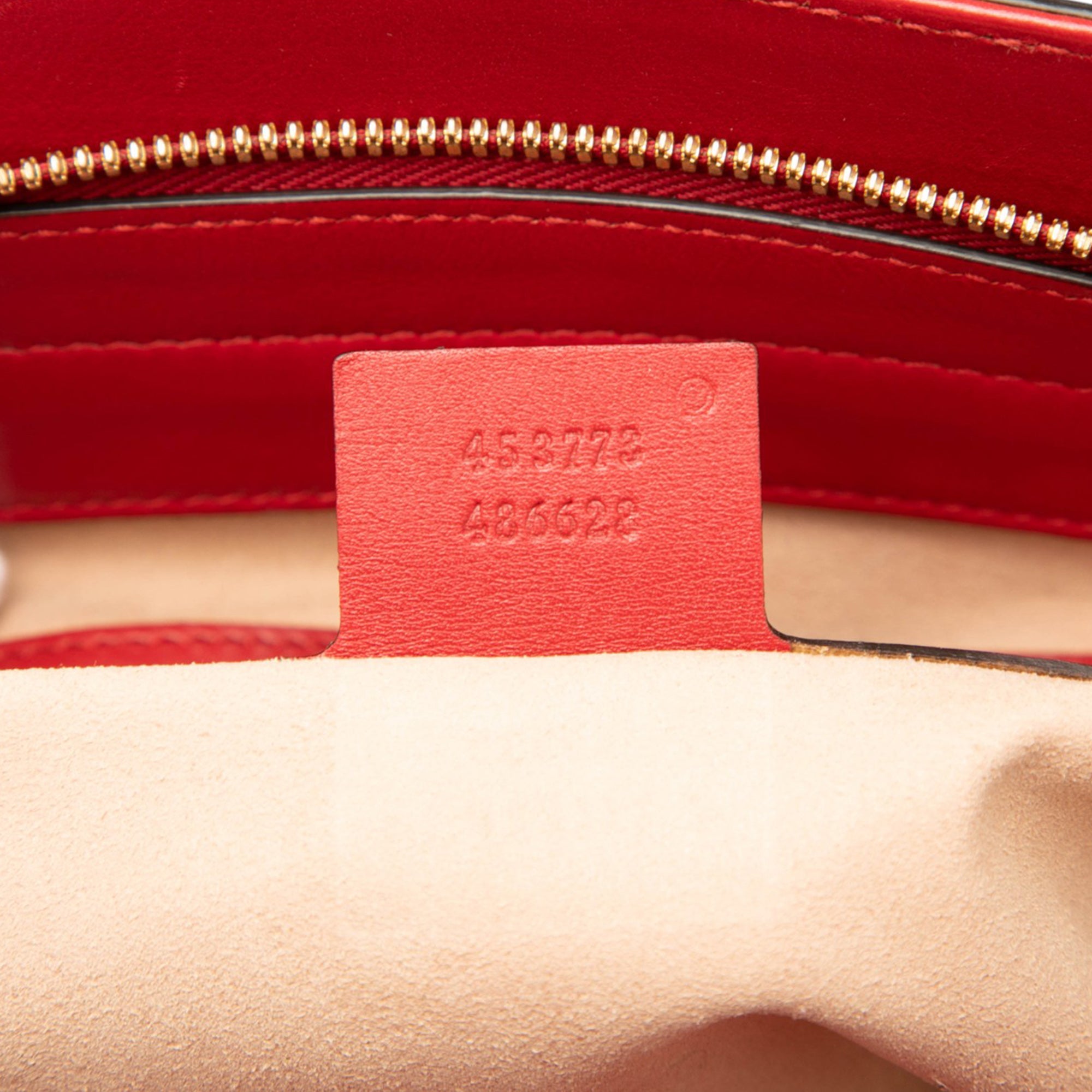 Product Details: Red Gucci Medium Guccissima Soft Shoulder Bag. This shoulder bag features an embossed leather body, chain and leather straps, a top zip closure, and interior zip and slip pockets. 8.7" L x 11.6" W x 4.7" D, 7.9" drop. Serial number 453773 486628.