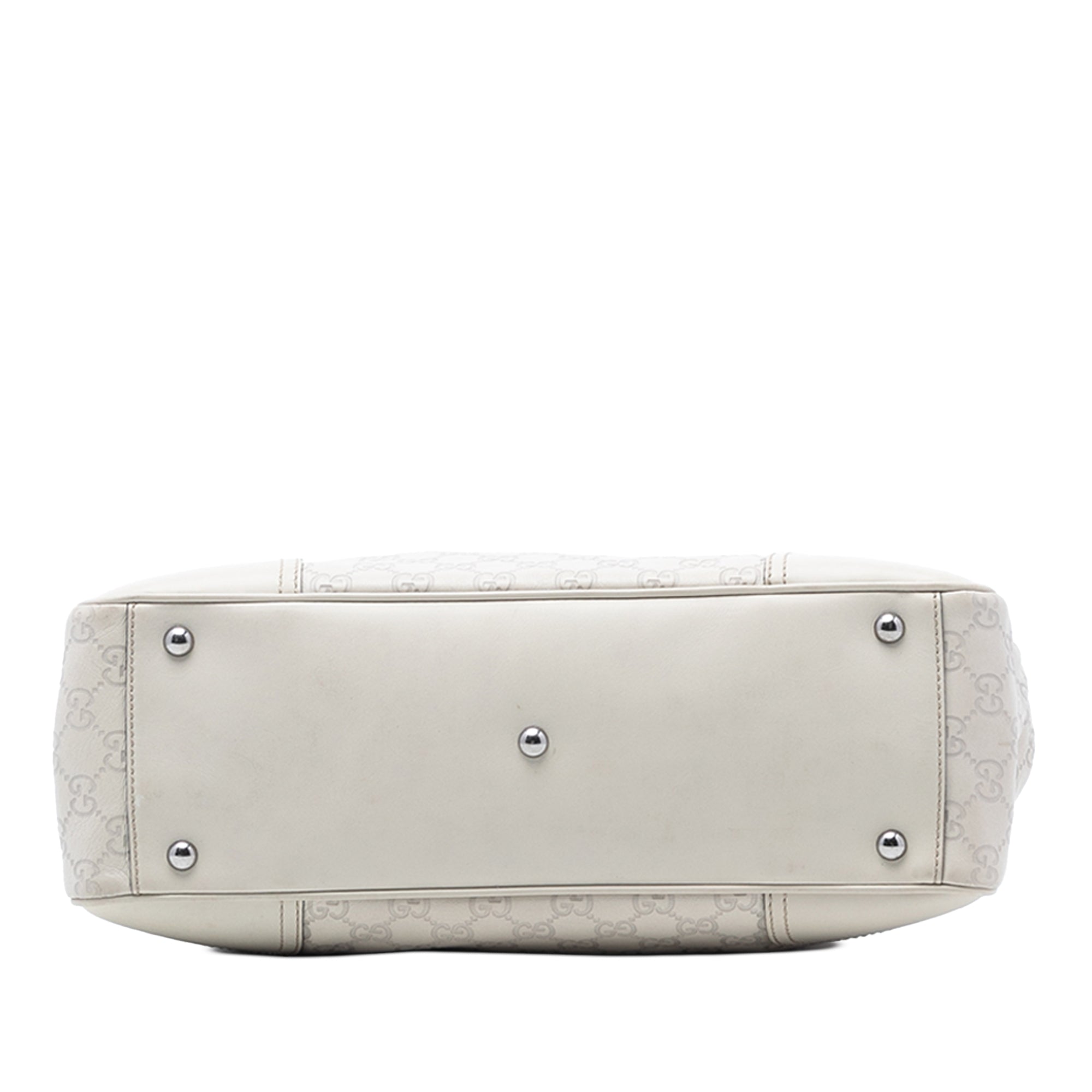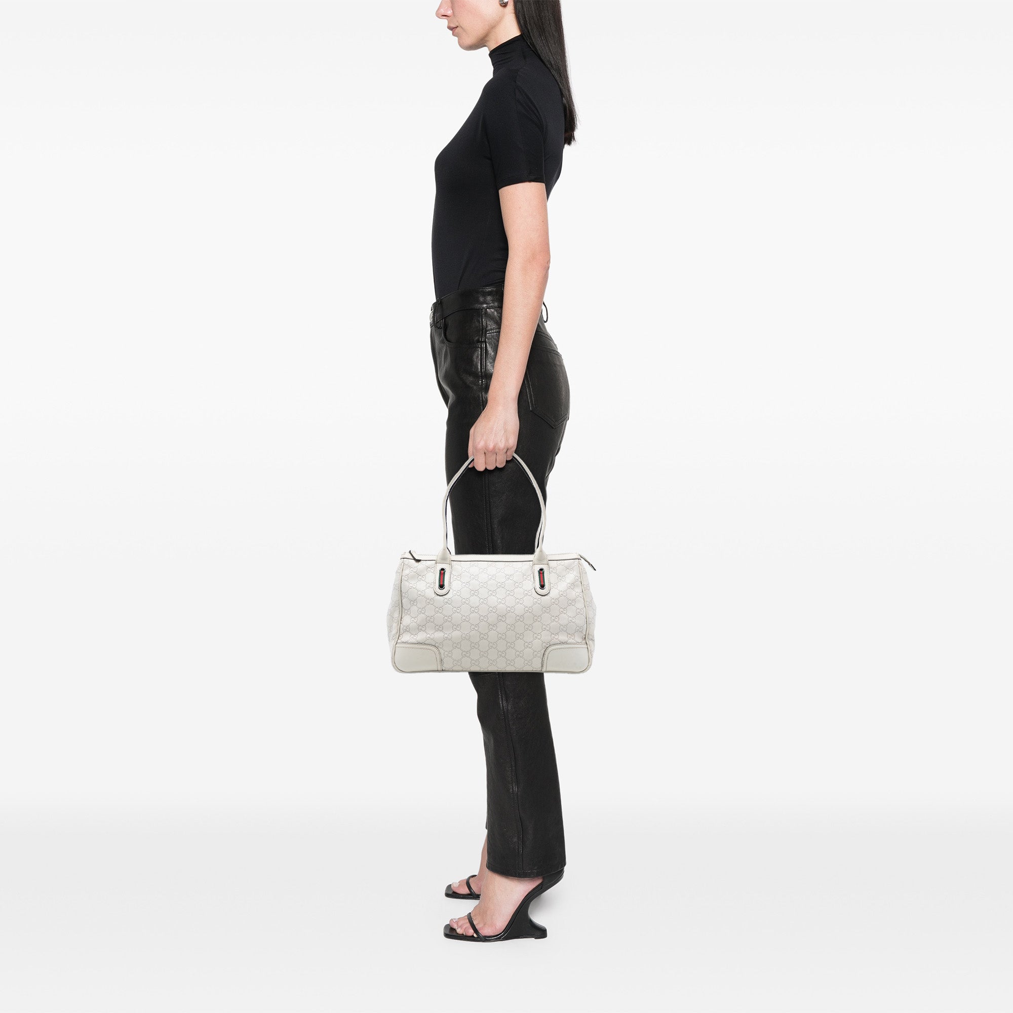 Product Details: White Gucci Guccissima Princy Tote. This Princy tote bag features a leather body, rolled leather handles, a top zip closure, and an interior zip pocket. 9.8" L x 14.6" W x 4.7" D. Serial number 293599 002123.