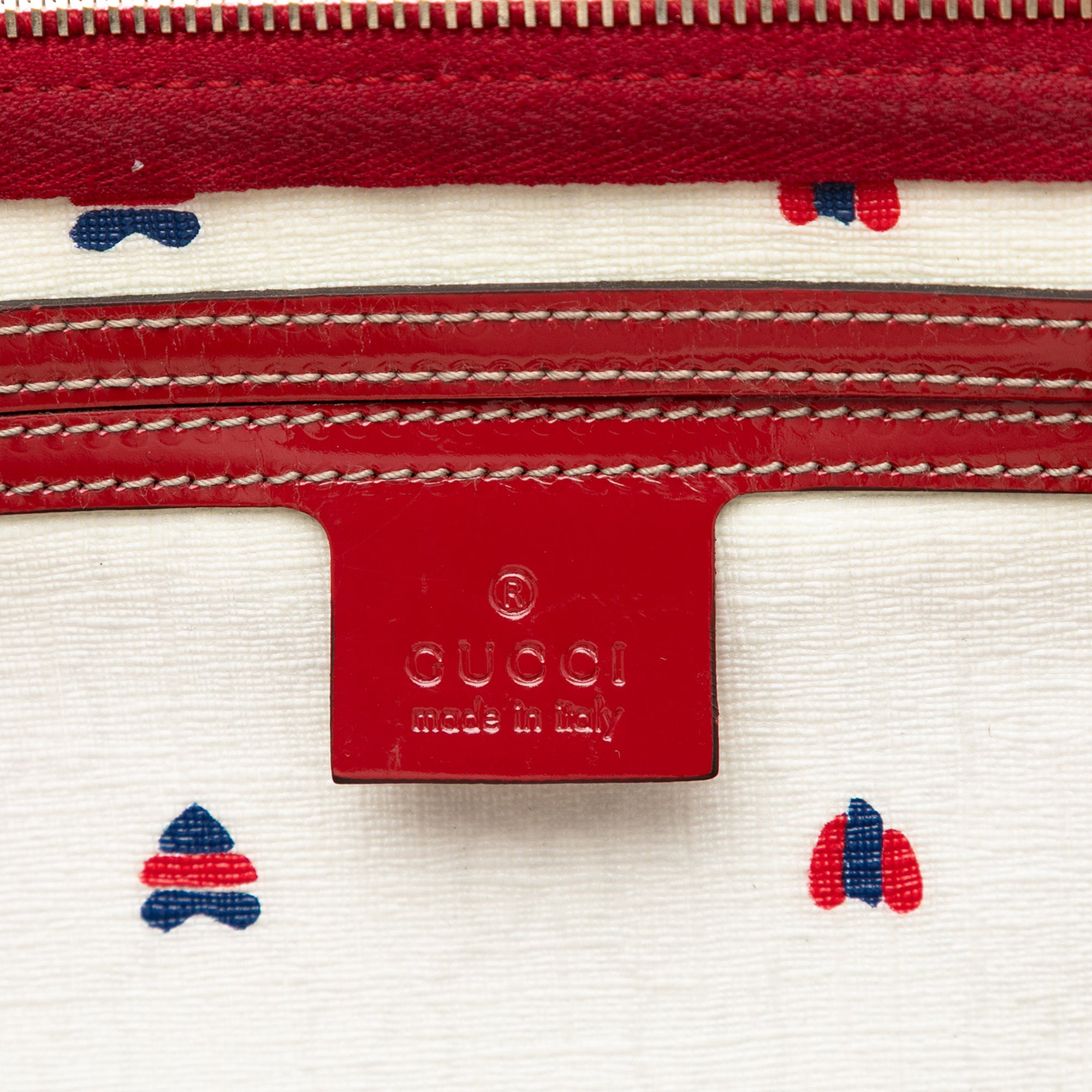 Product Details: White Gucci Medium GG Supreme Hearts Joy Boston Bag. This boston bag features a printed coated canvas body with leather trim, rolled leather handles, a top zip closure, and an interior slip pocket. 8.9" L x 12.8" W x 7.1" D, 3.7" drop. Serial number 193603 002404.