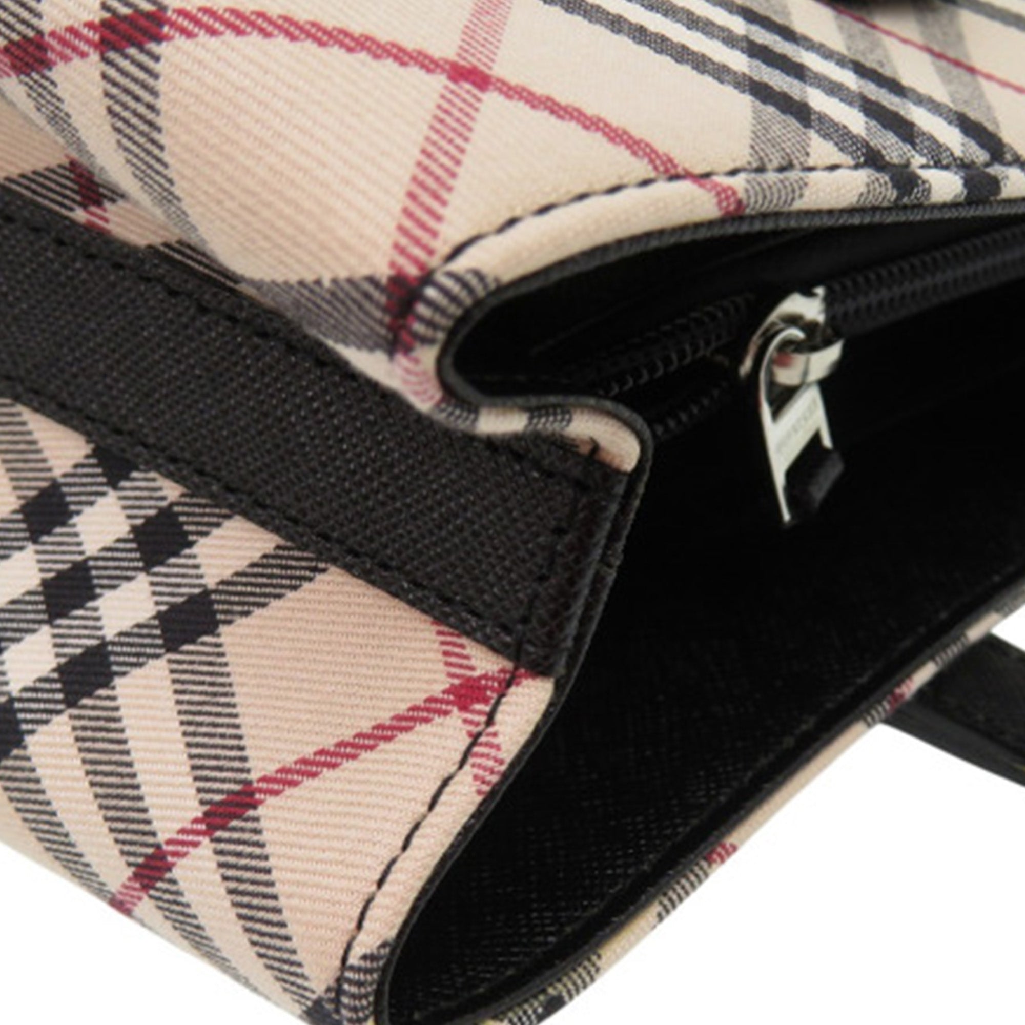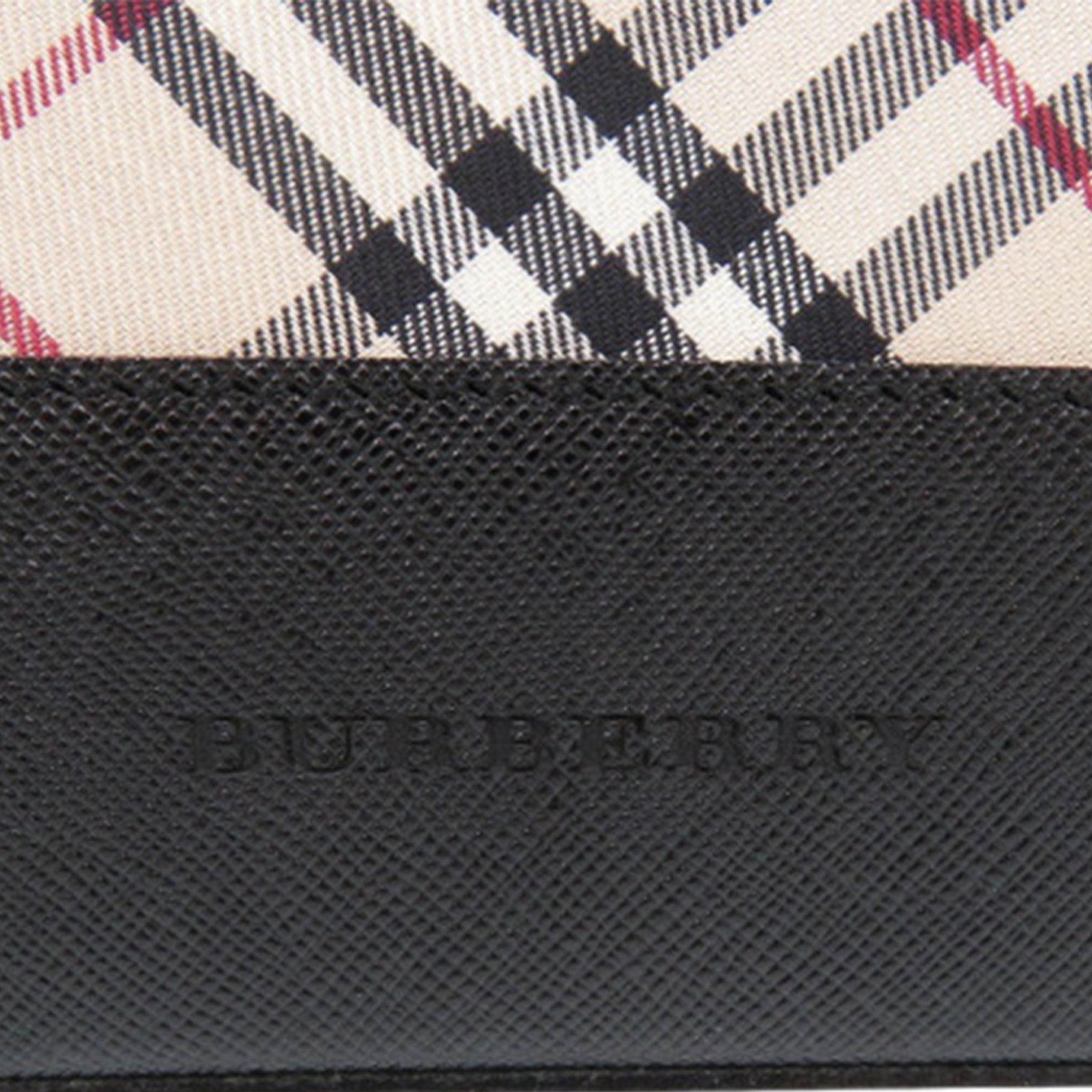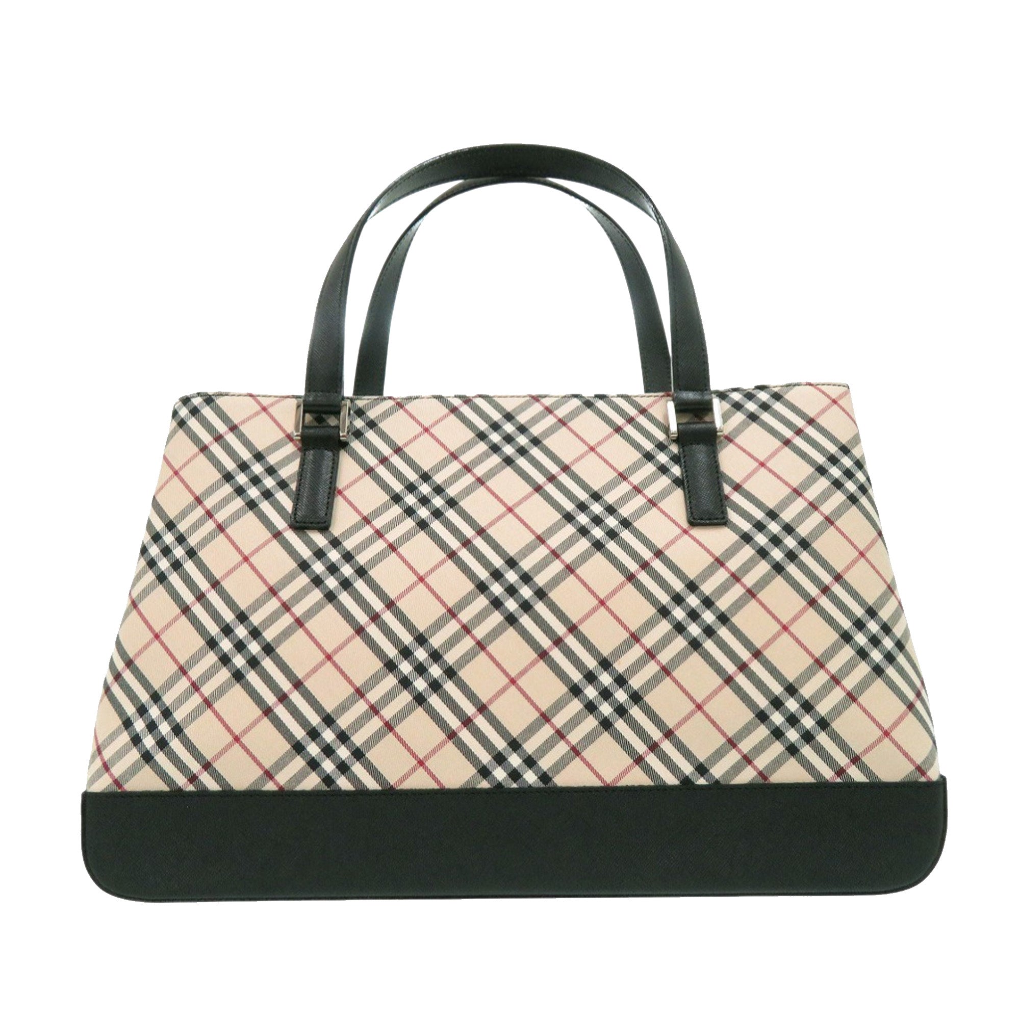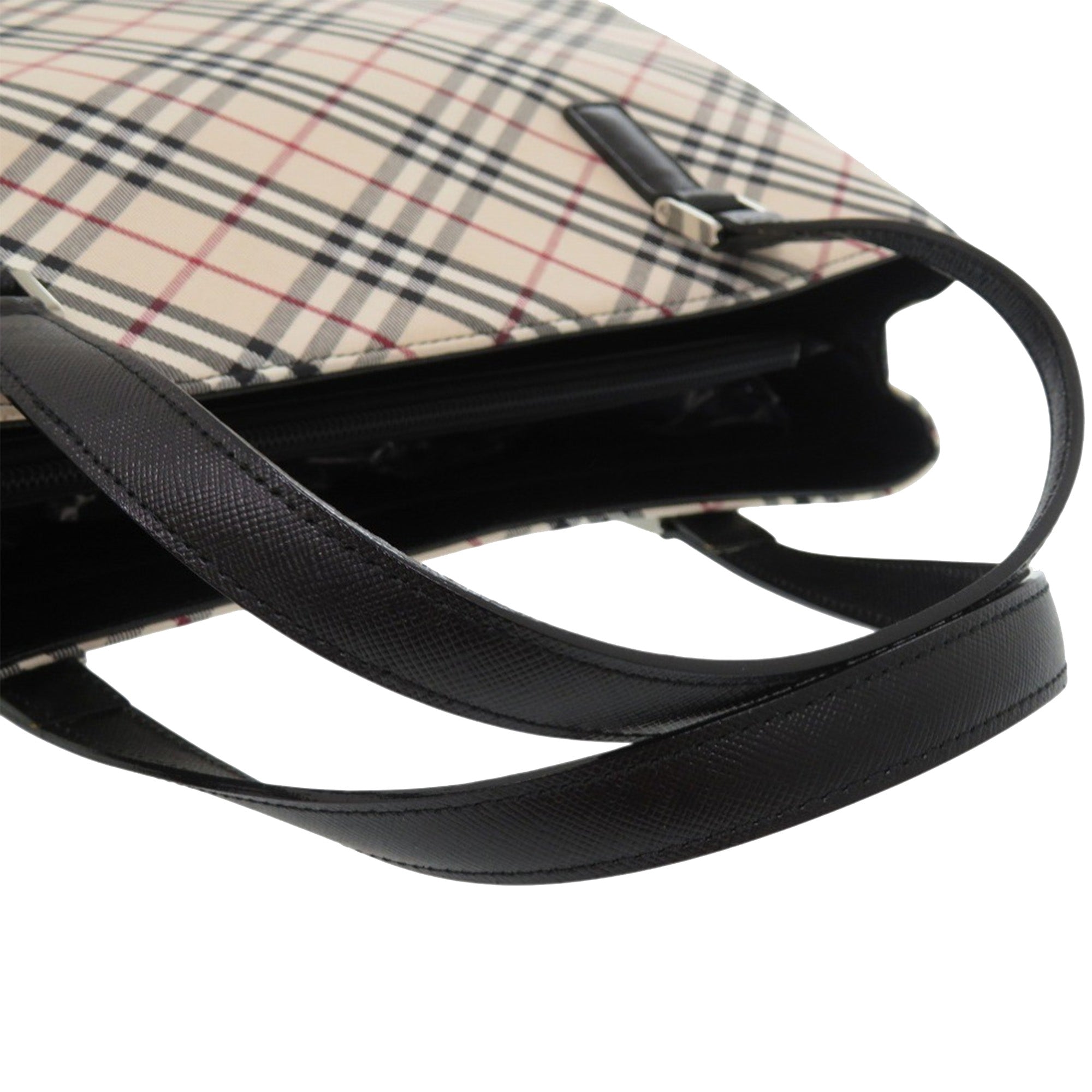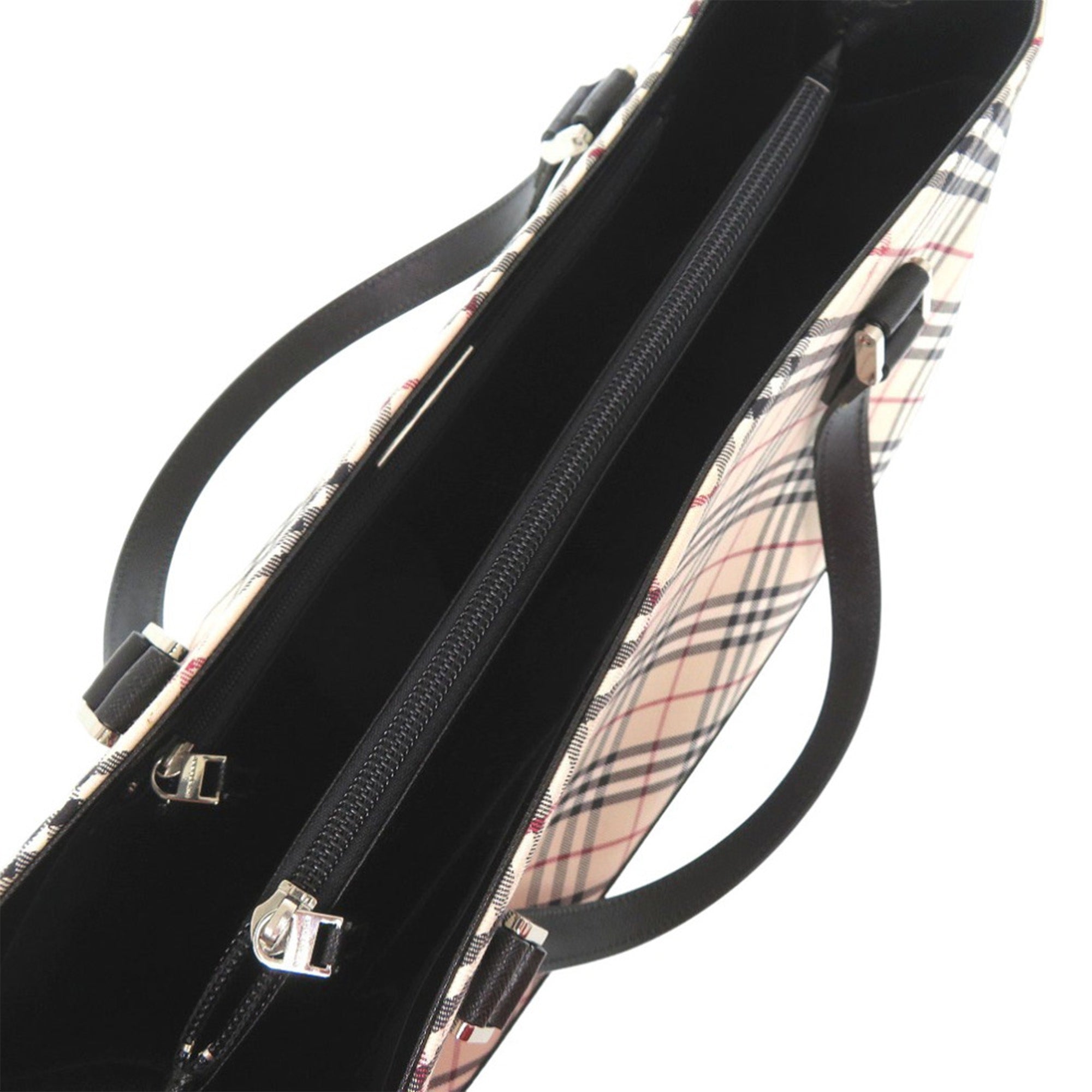 Product Details: Beige Burberry Nova Check Canvas Tote. This tote features a canvas body with leather trim, flat leather handles, an open top, an interior zip compartment, and an interior zip and slip pockets. 9.4" L x 14.6" W x 5.5" D, 8.1" drop.