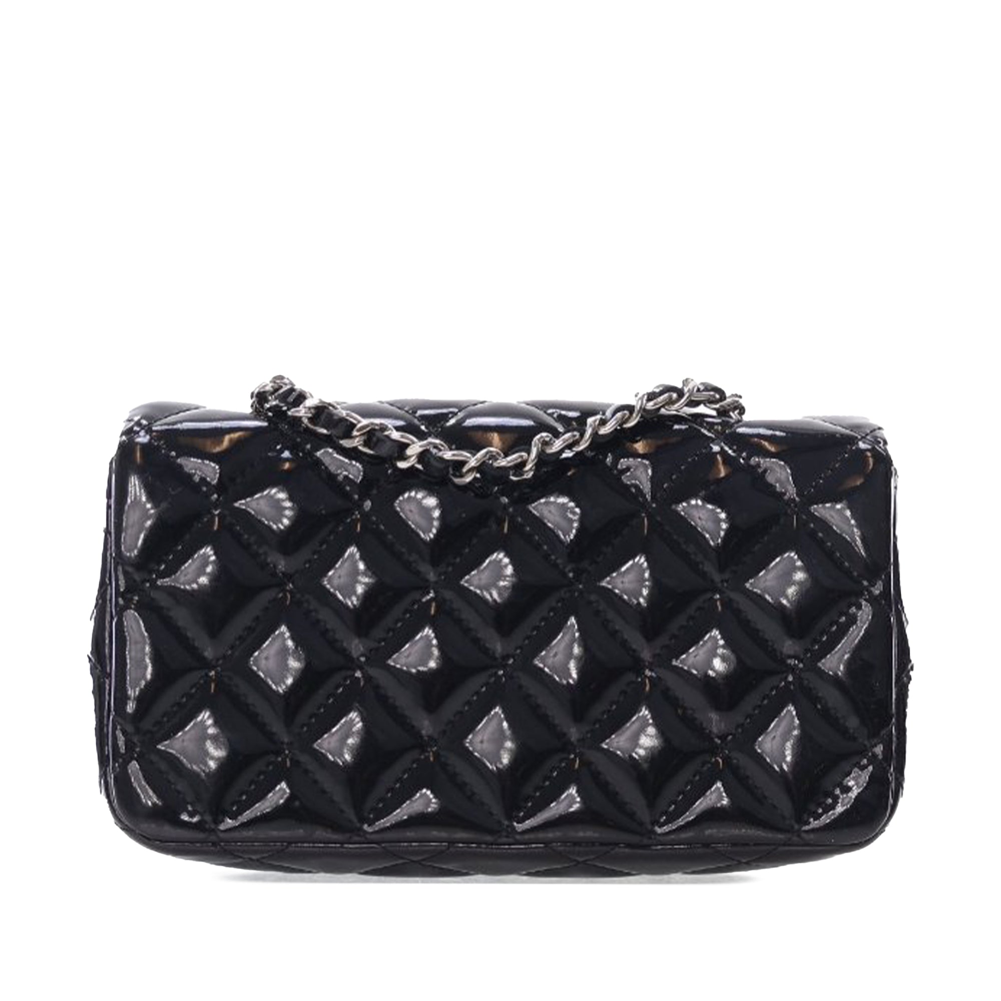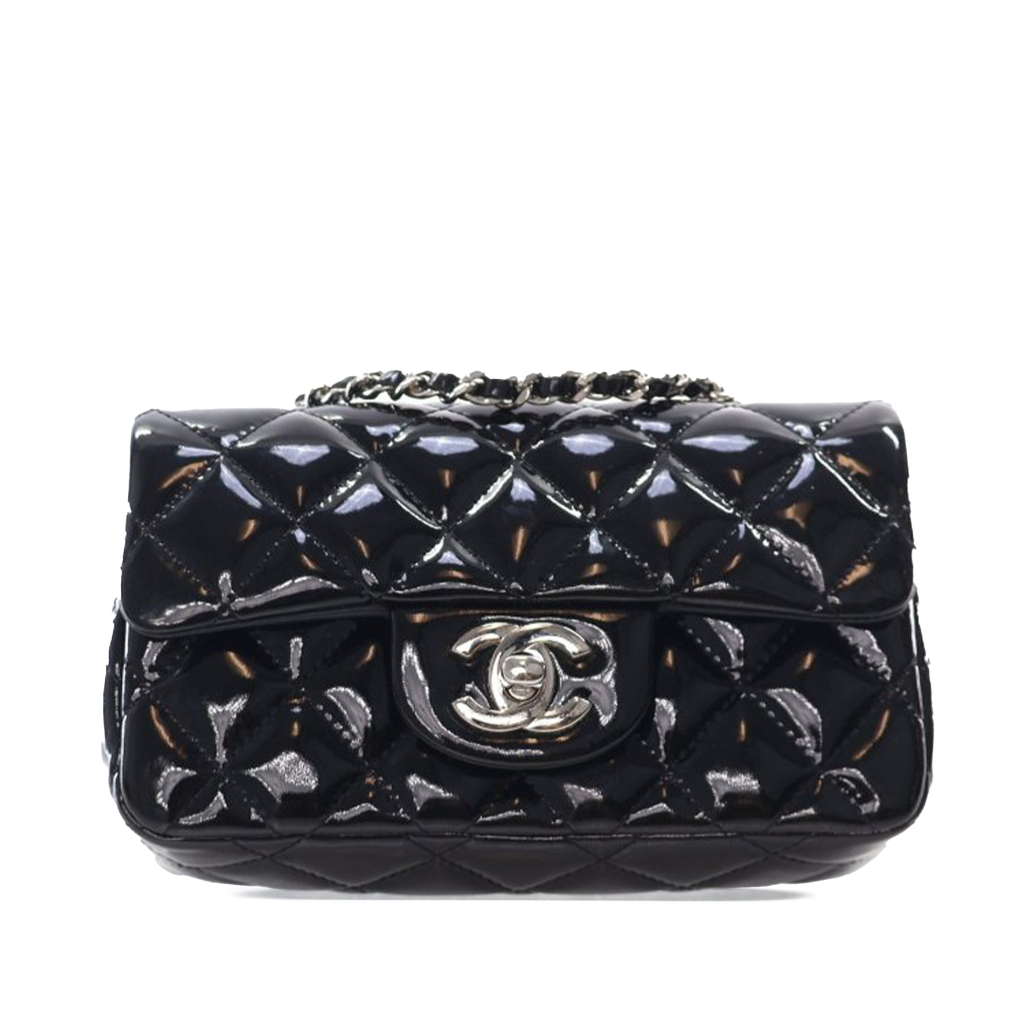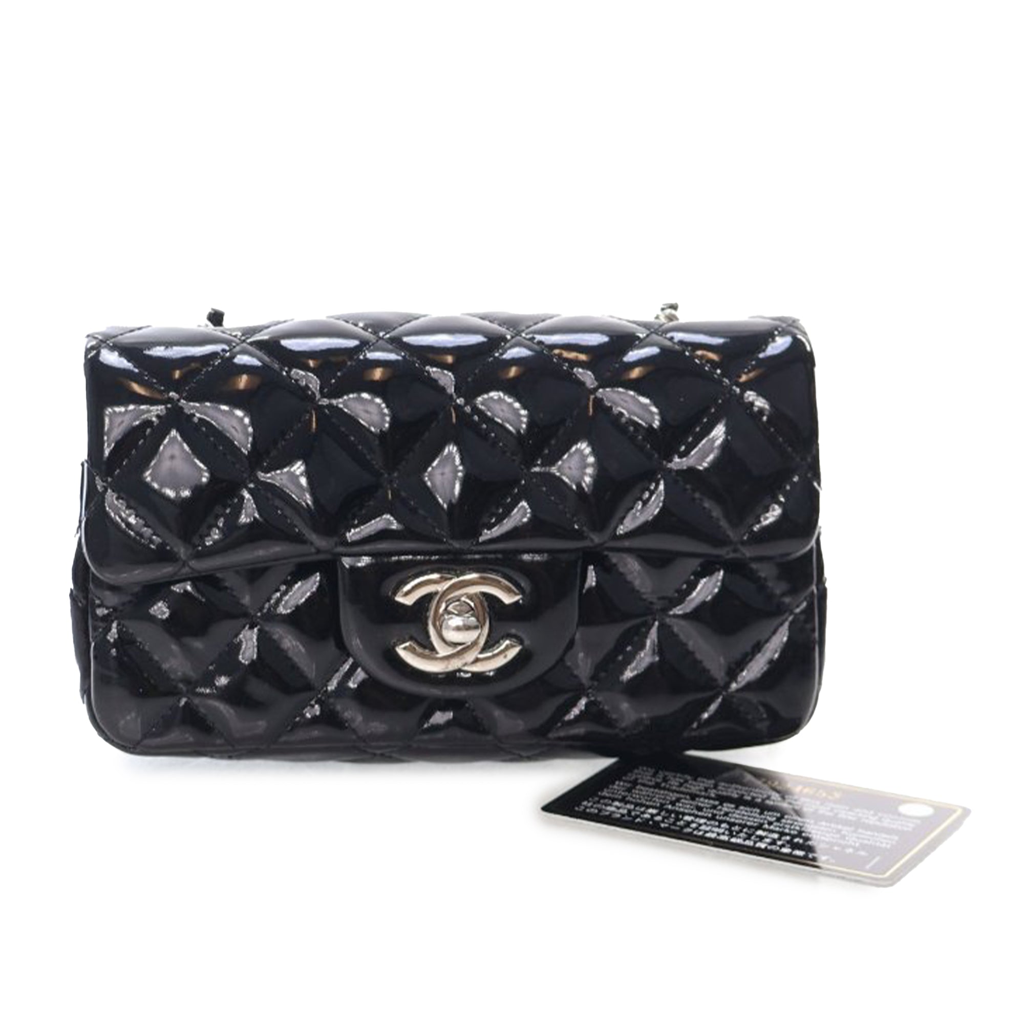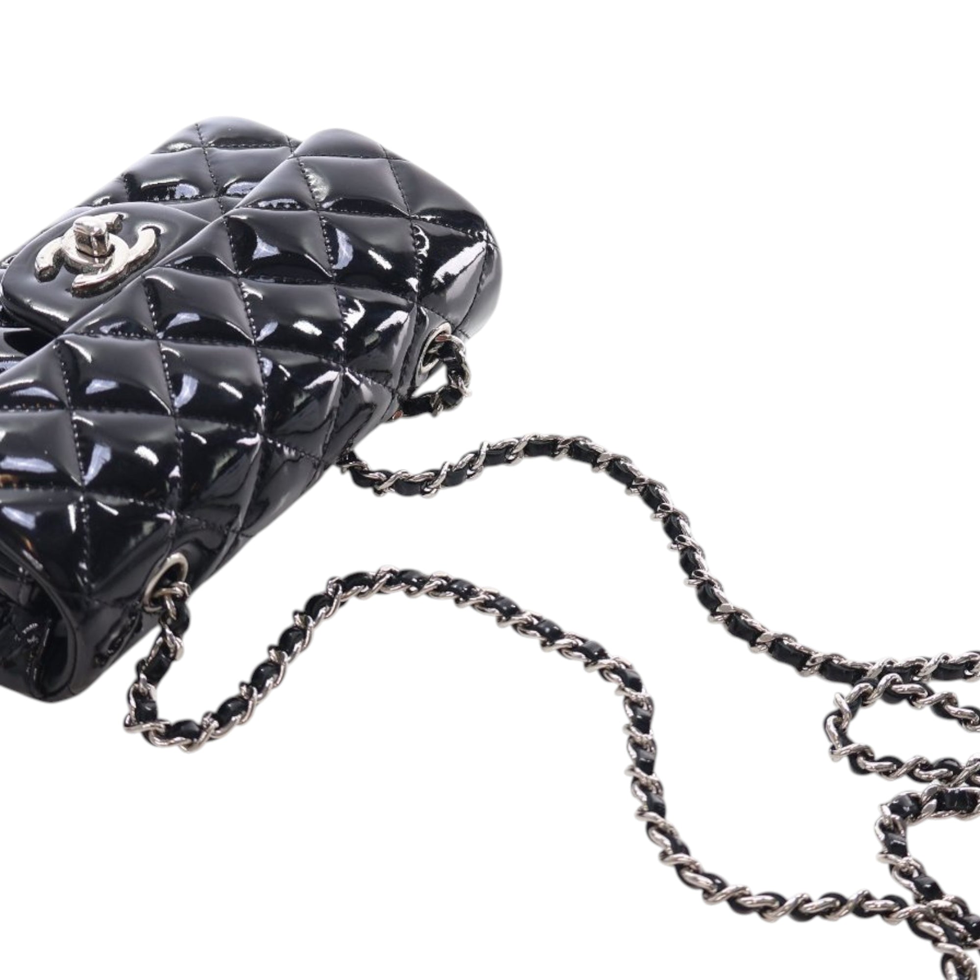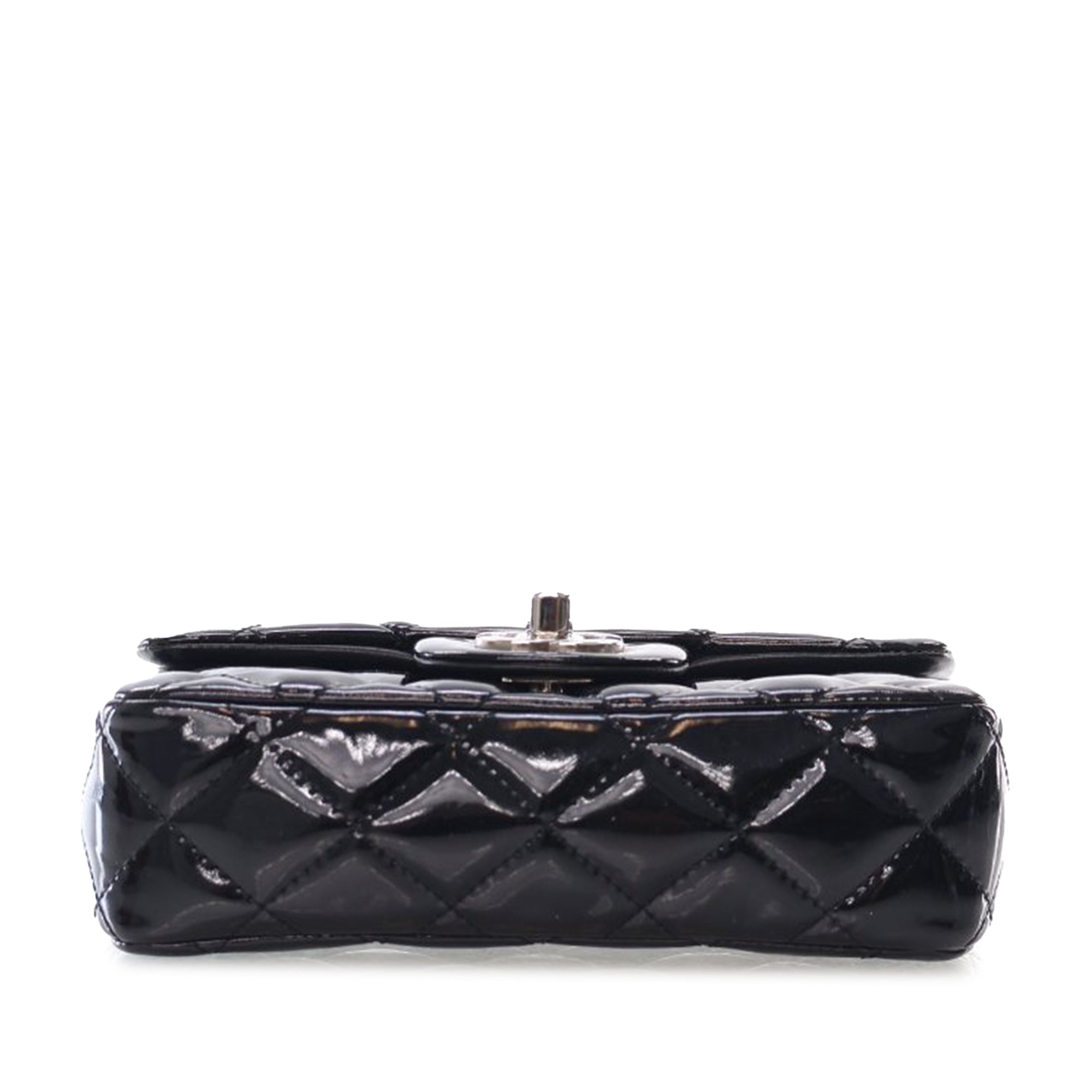 Product Details: Black Chanel Extra Mini Rectangular Classic Patent Single Flap Crossbody Bag. This crossbody bag features a quilted patent leather body with gold tone hardware, a leather woven chain shoulder strap, a front flap with turn lock closure, and interior slip pockets. 4" L x 6.5" W x 2" D.
