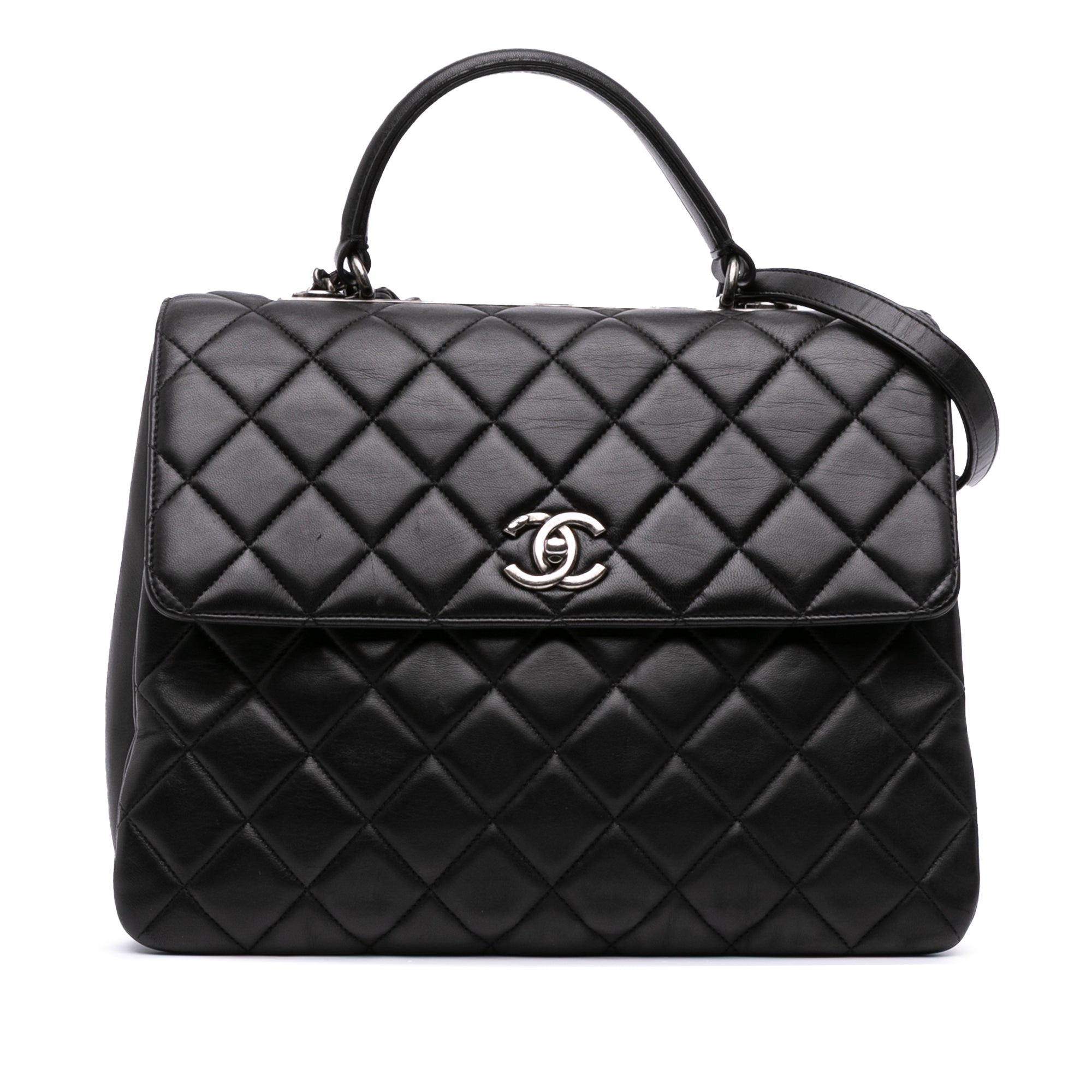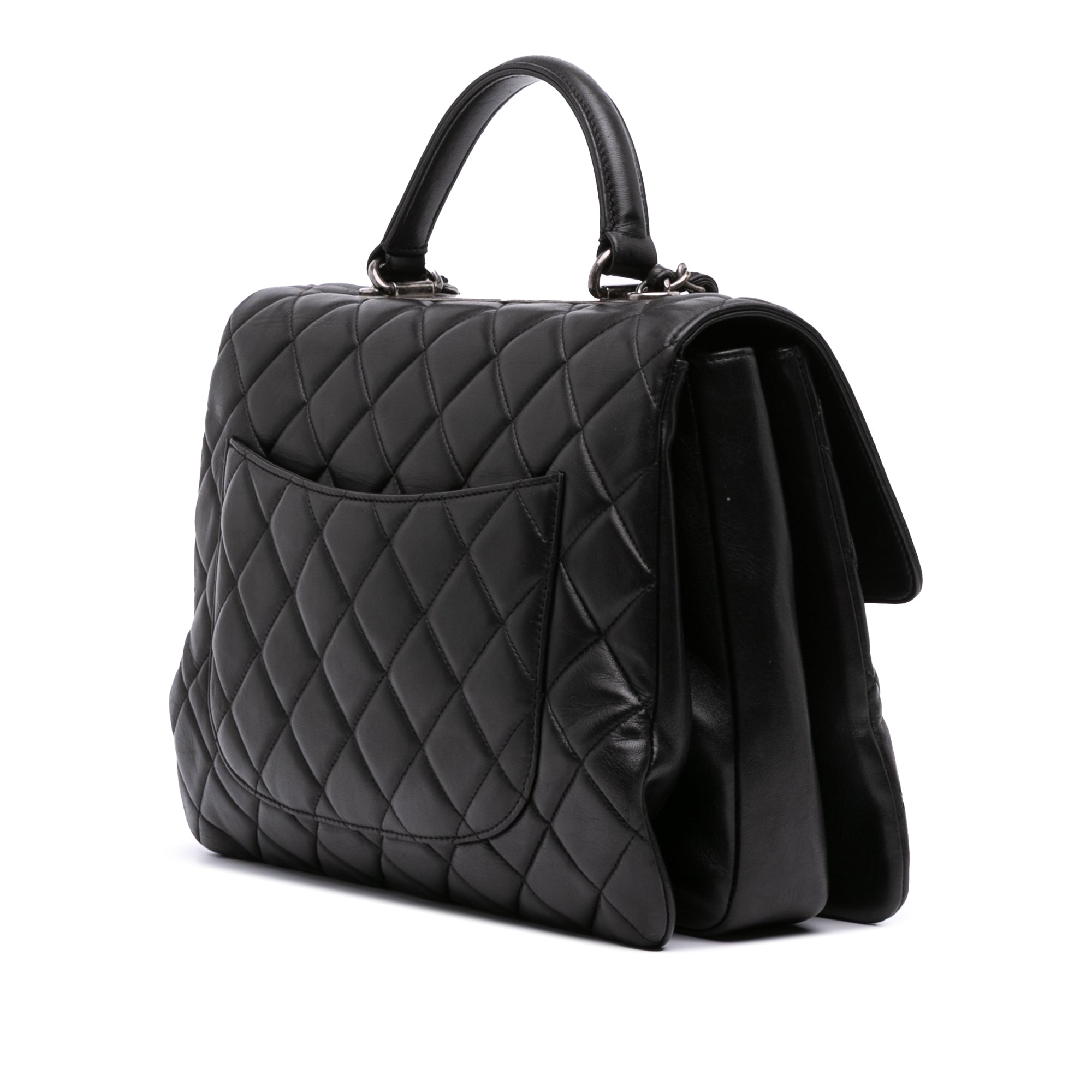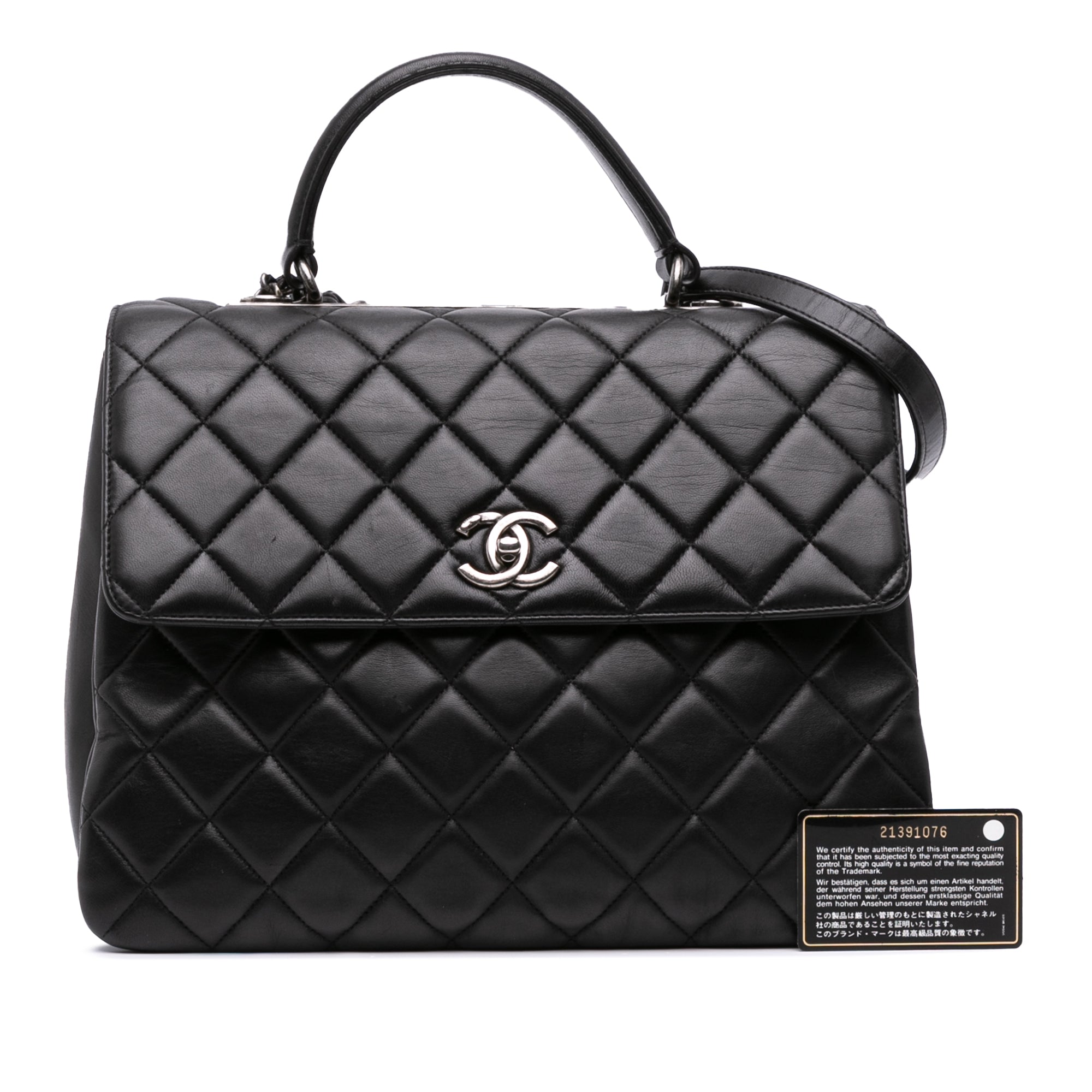 Product Details: Black Chanel Large Lambskin Trendy CC Top Handle Bag Satchel. This satchel features a quilted lambskin leather body, a flat leather top handle, a front flap with twist lock closure, and an interior zip pocket. 10.2" L x 13" W x 3.1" D, 3.9" drop. Serial number 21391076.