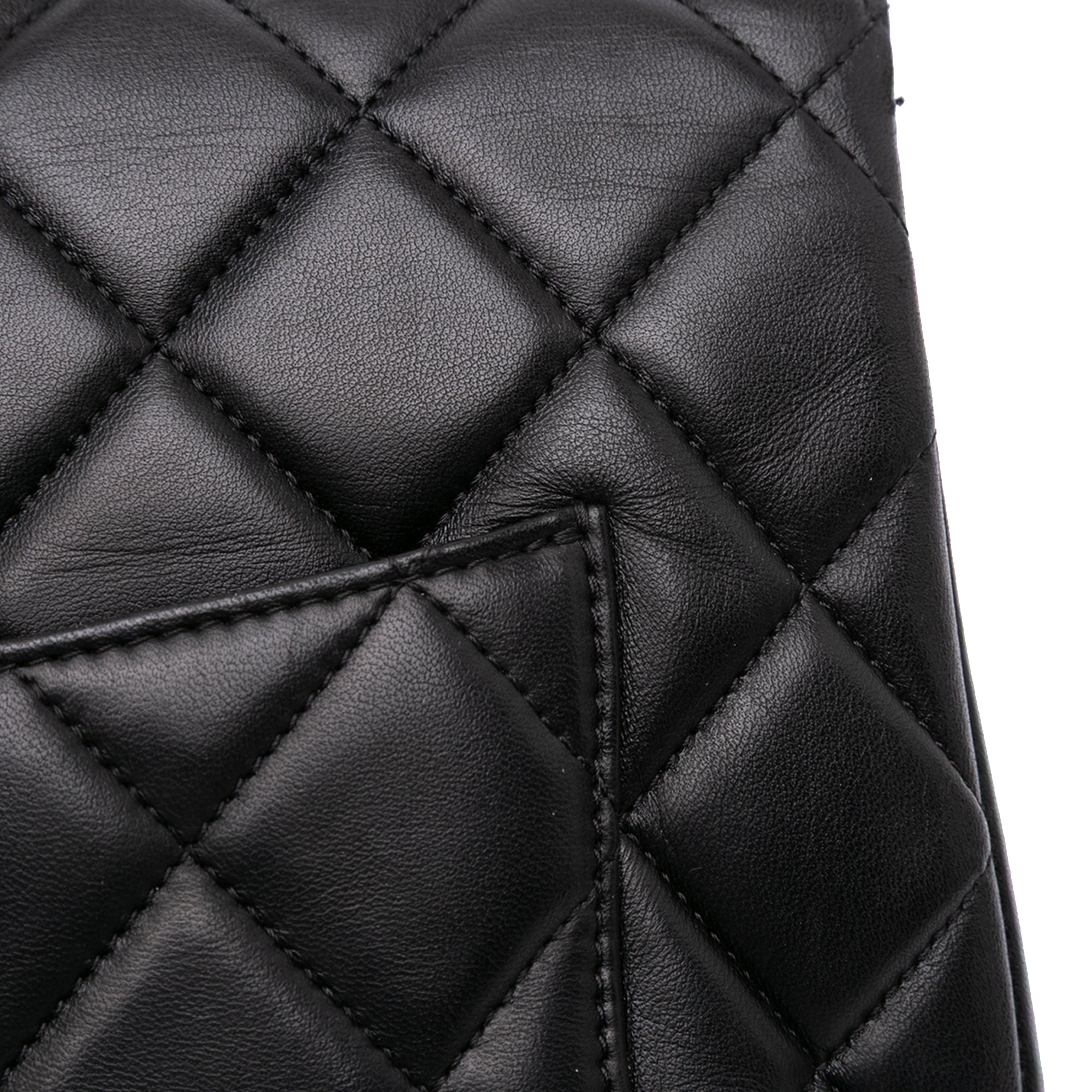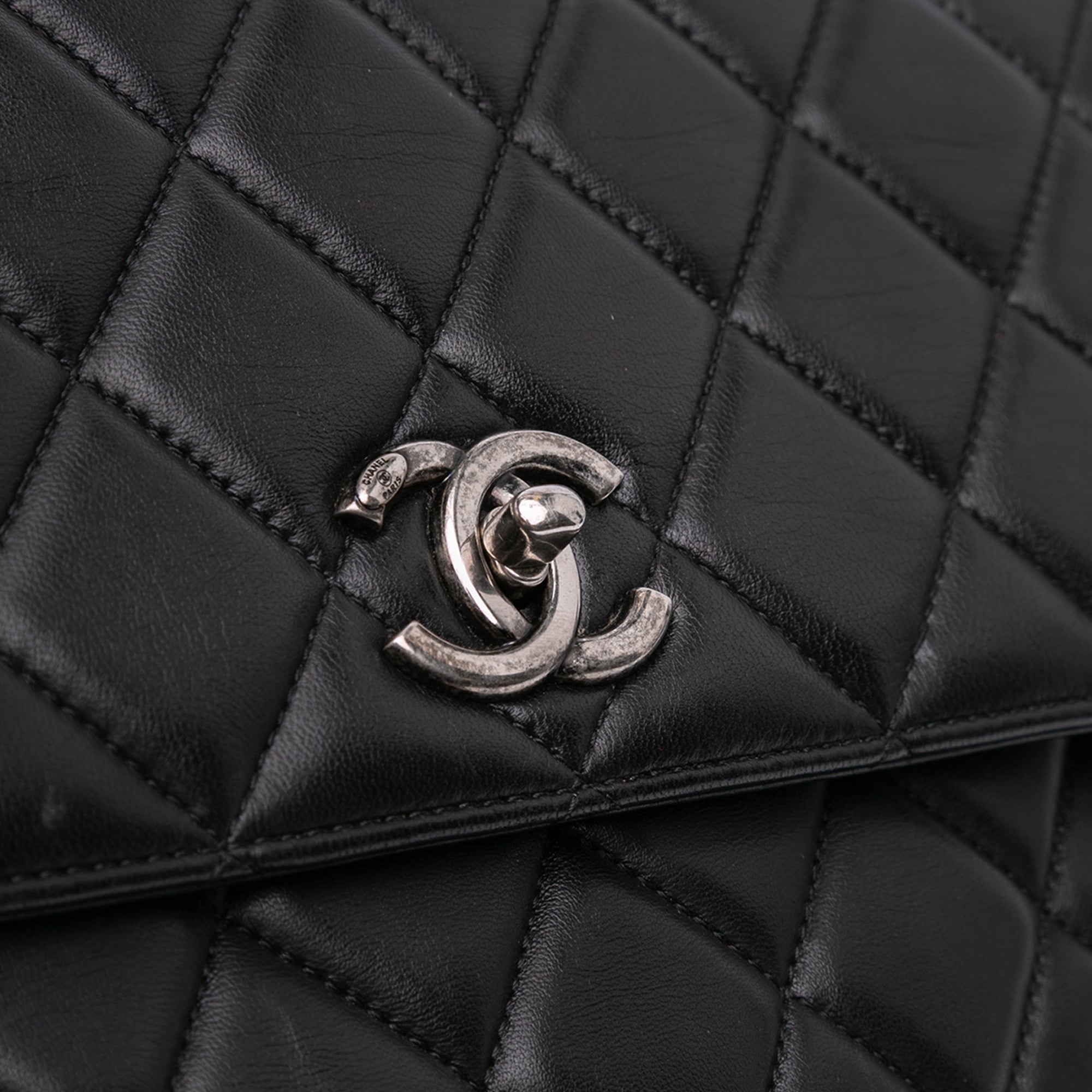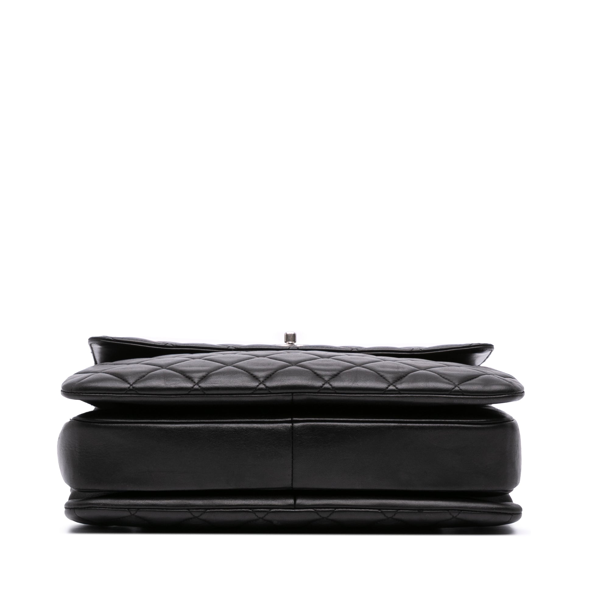Product Details: Black Chanel Large Lambskin Trendy CC Top Handle Bag Satchel. This satchel features a quilted lambskin leather body, a flat leather top handle, a front flap with twist lock closure, and an interior zip pocket. 10.2" L x 13" W x 3.1" D, 3.9" drop. Serial number 21391076.