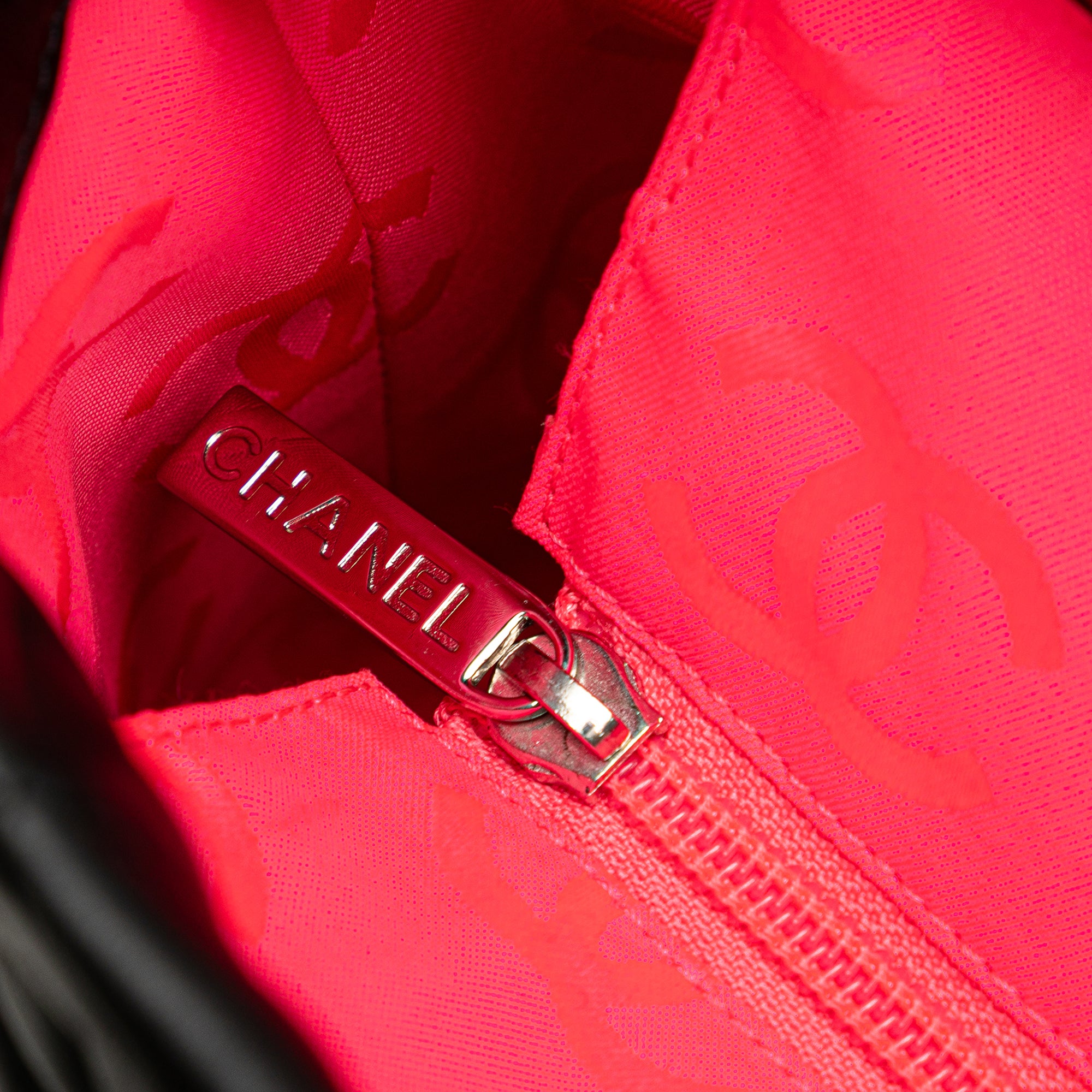 Product Details: Black Chanel Large Quilted Calfskin Cambon Ligne Tote. The Cambon Ligne tote features a quilted leather body, rolled leather handles with knot detail, a top zip closure, an exterior back slip compartment, and interior zip and slip pockets. 9.4" L x 11.6" W x 5.5" D. Serial number 9121098.