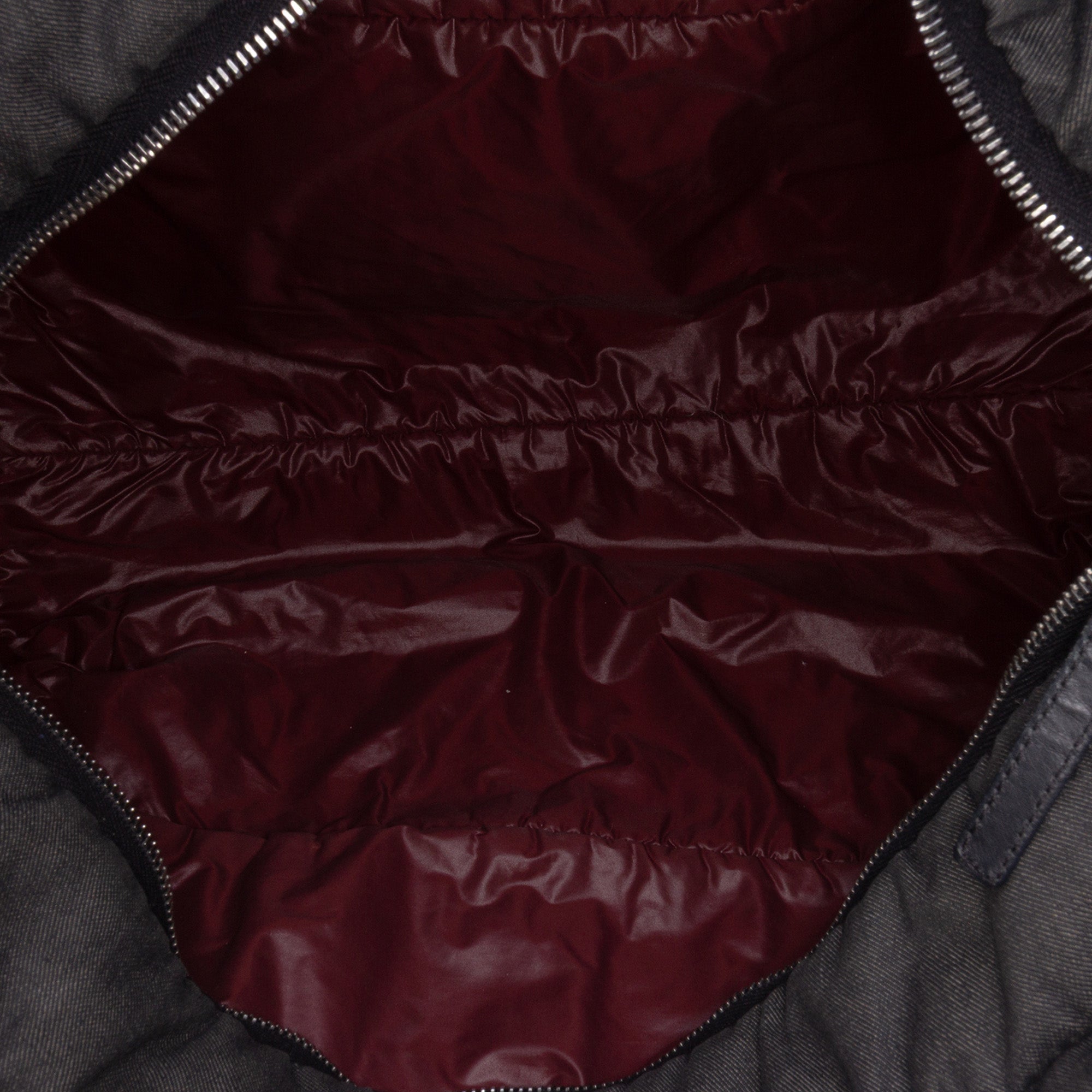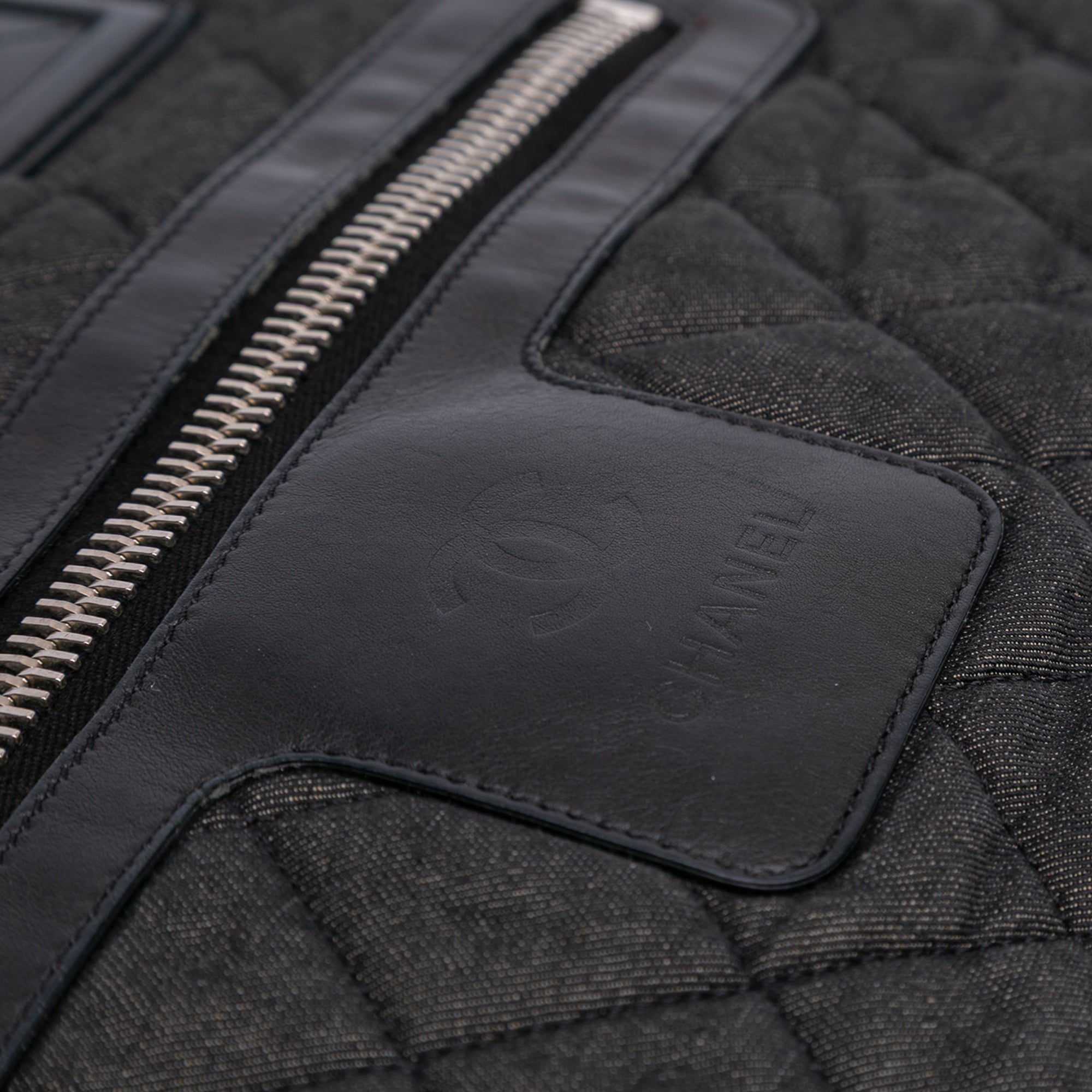 Product Details: Black Chanel Large Quilted Denim Coco Cocoon Tote. The Coco Cocoon tote features a quilted denim body, rolled denim handles, an exterior front zip pocket, a top zip closure, and an interior zip pocket. 12.2" L x 15" W x 7.9" D. Serial number 14530042.