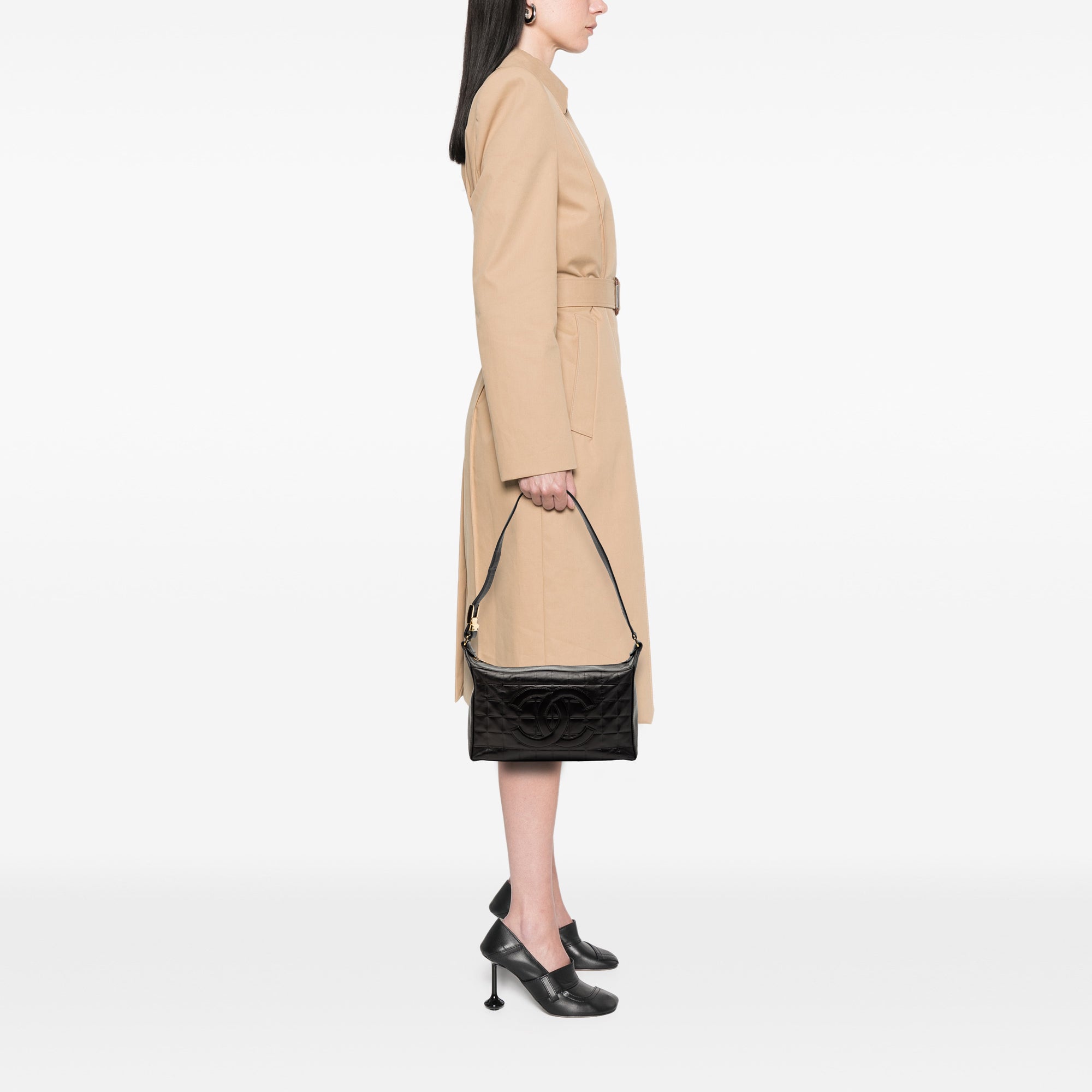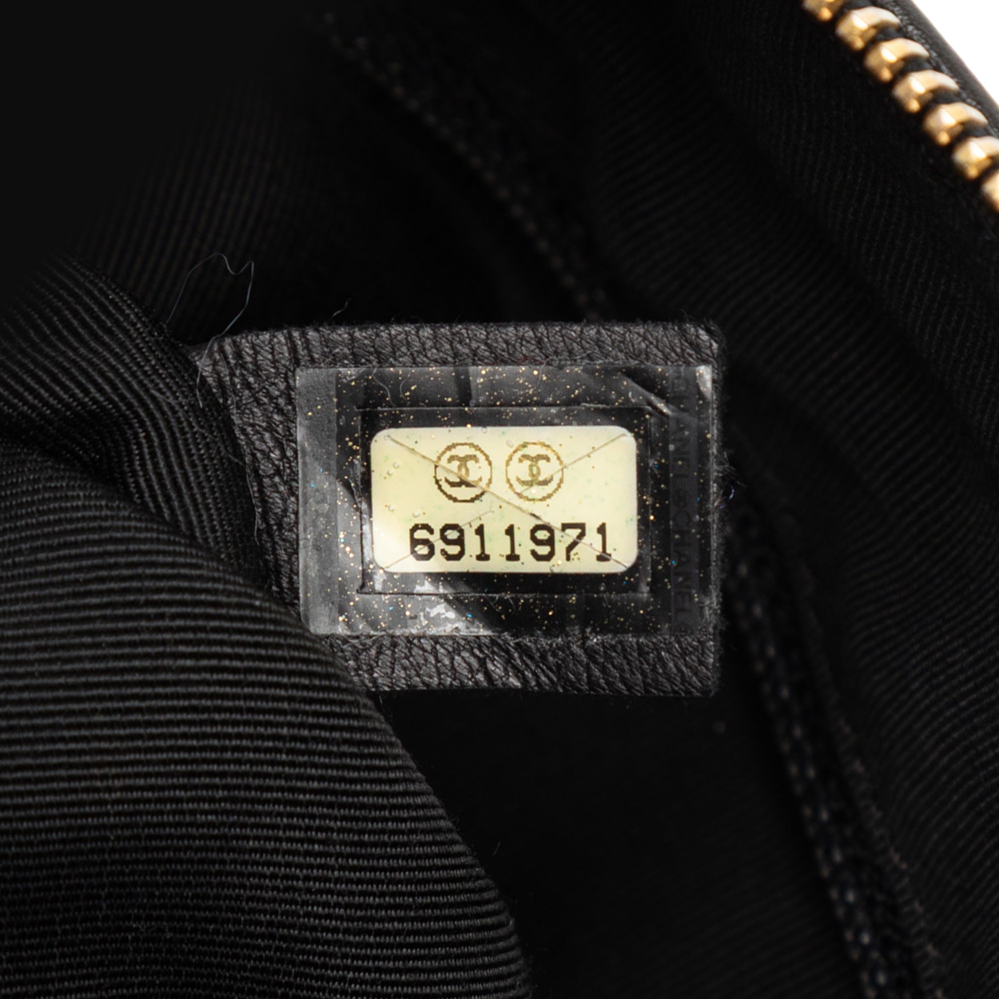 Product Details: Black Chanel Medium Lambskin Chocolate Bar Shoulder Bag. This shoulder bag features a quilted lambskin leather body, an adjustable flat leather strap, a top zip closure, and interior zip and slip pockets. 7.1" L x 10.6" W x 3.1" D. Serial number 6911971.