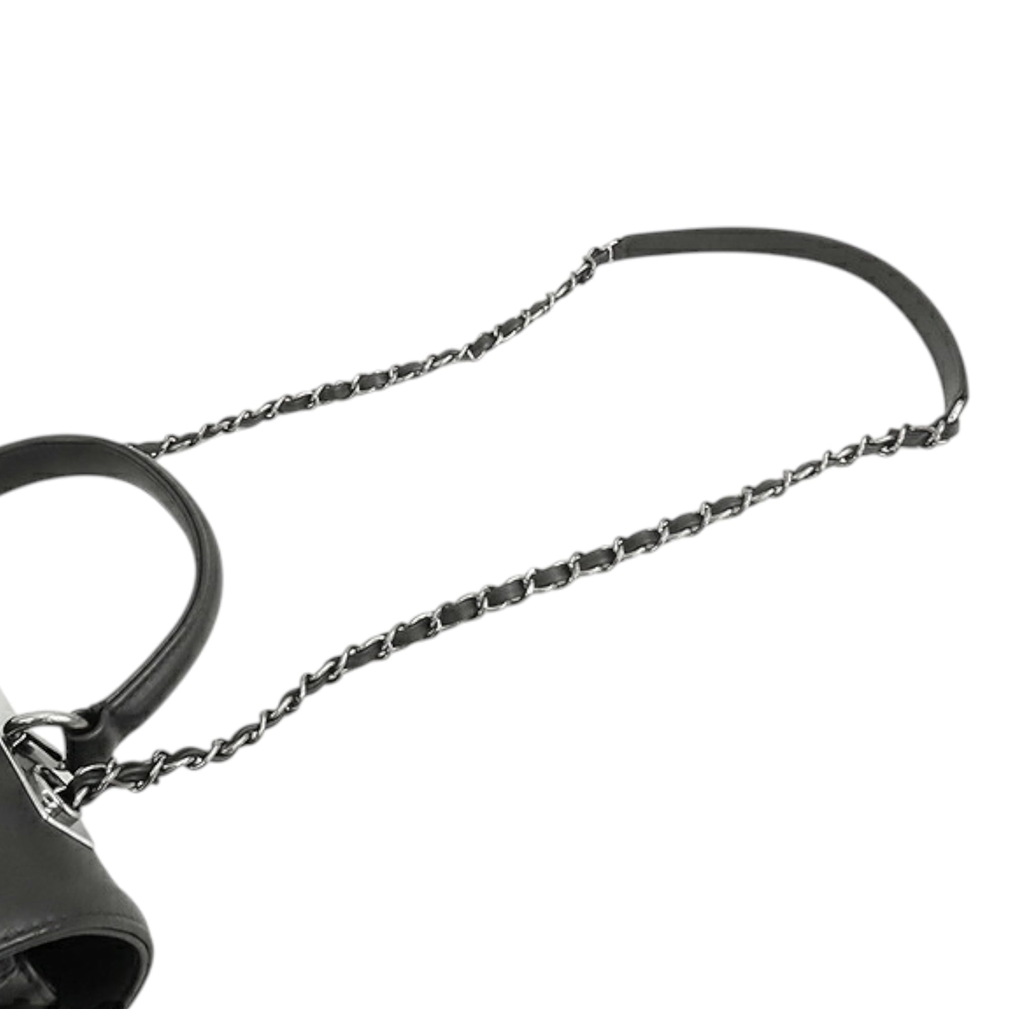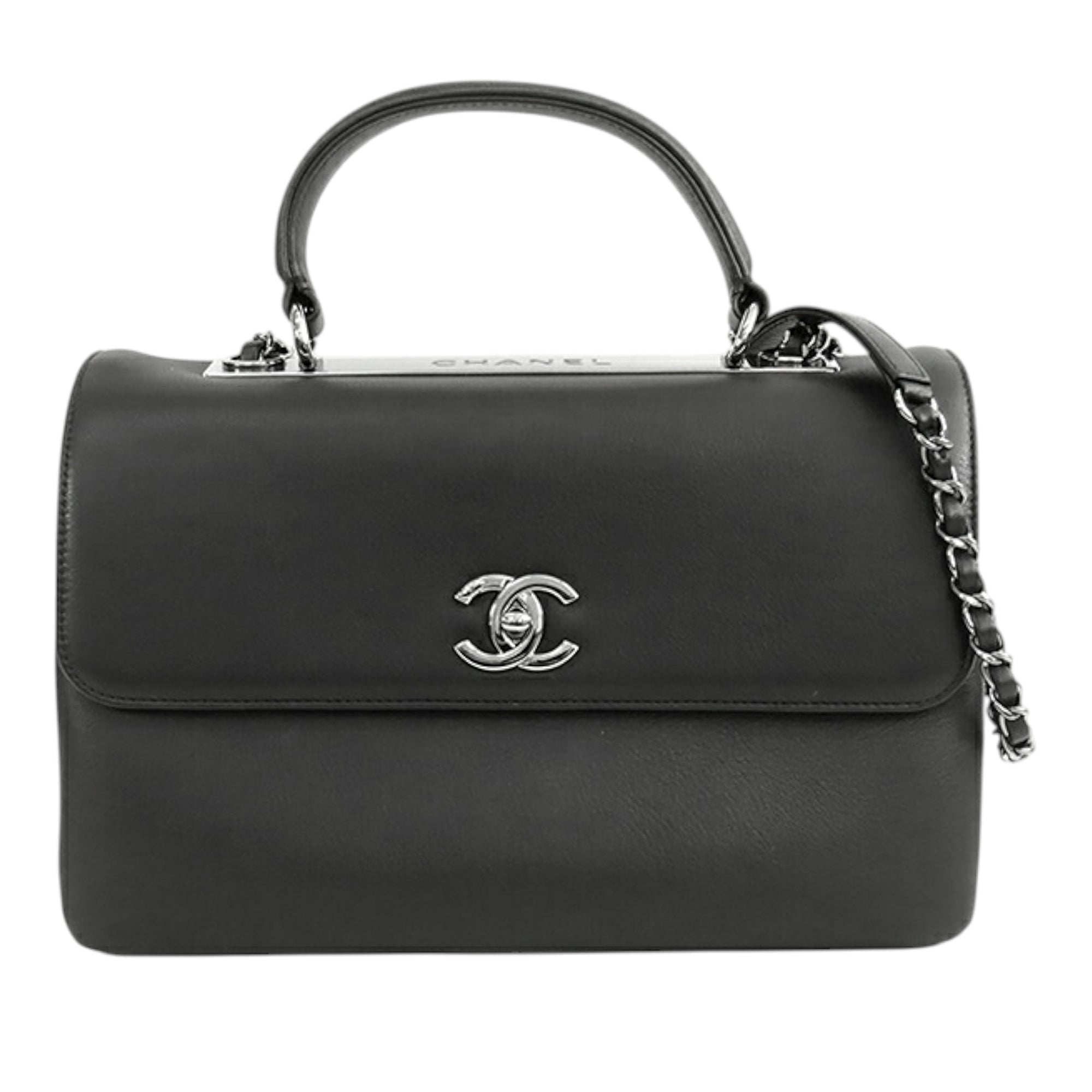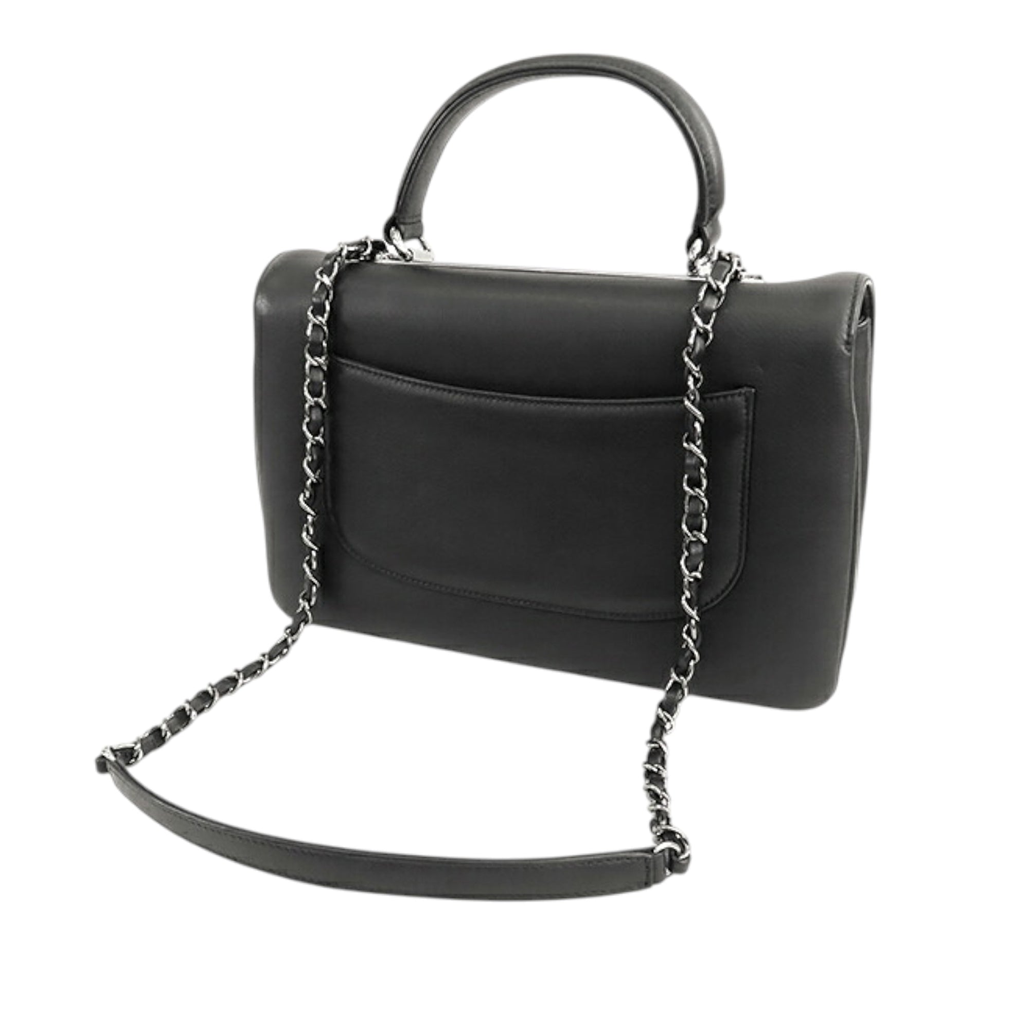 Product Details: Black Chanel Medium Lambskin Trendy CC Top Handle Bag Satchel. The Trendy CC satchel features a lambskin leather body, a flat leather top handle, a detachable leather-woven chain link strap with leather guard, a front flap with CC turn-lock closure, an exterior back slip pocket, and interior zip and slip pockets. 7.5" L x 11.8" W x 3.5" D, 10.2" drop.