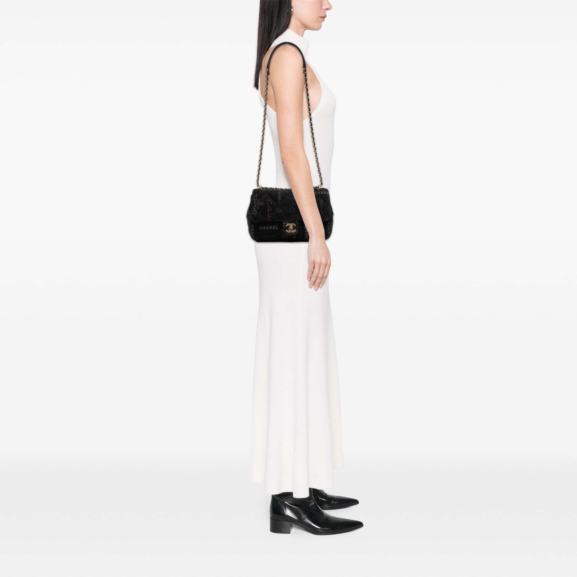 Black Chanel Medium Quilted Denim Mood Flap Crossbody Bag - Designer Revival Black Chanel Medium Quilted Denim Mood Flap Crossbody Bag - Designer Revival