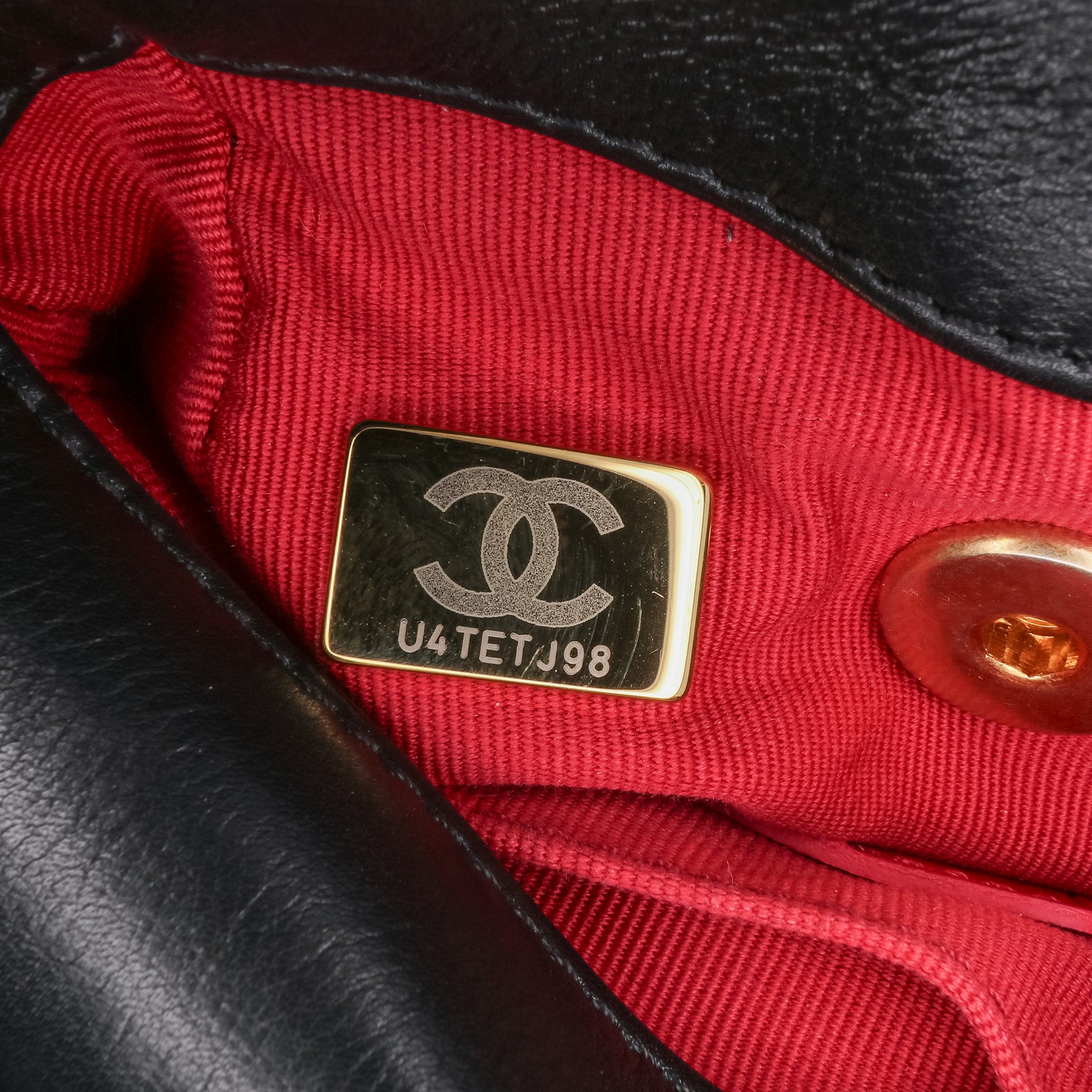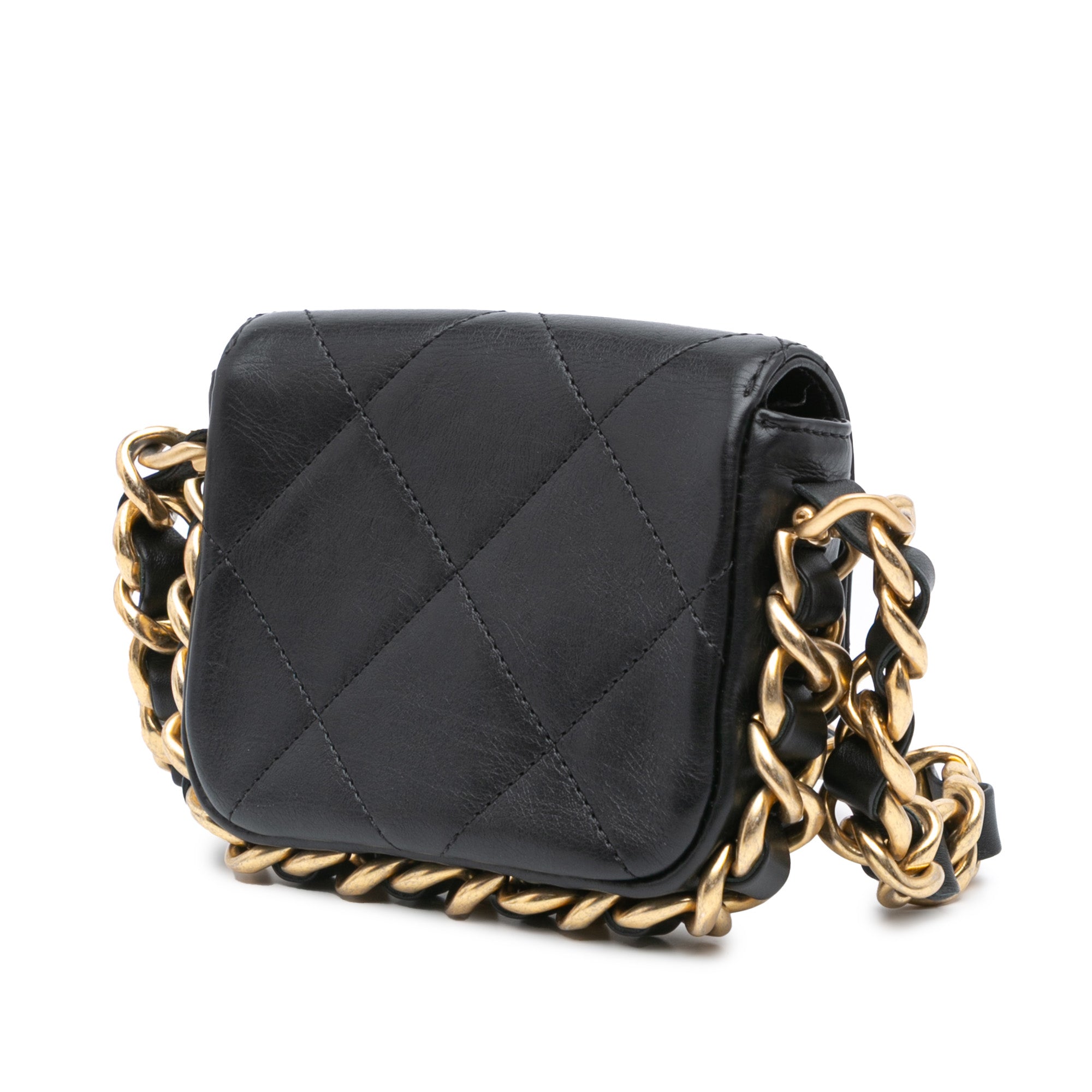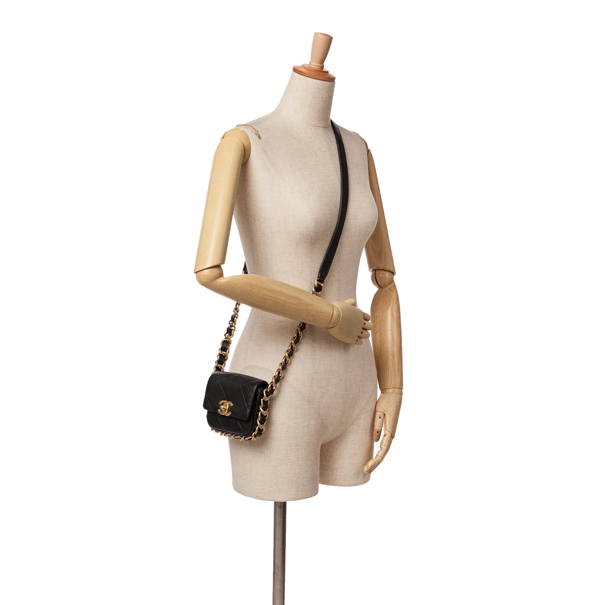 Product Details: Black Chanel Mini Quilted Calfskin Framing Chain Flap Crossbody Bag. This crossbody bag features a quilted leather body, a leather-woven chain link strap, and a front flap with CC and turn-lock closure. 3.9" L x 4.9" W x 0.8" D. Serial number U4TEJ98.
