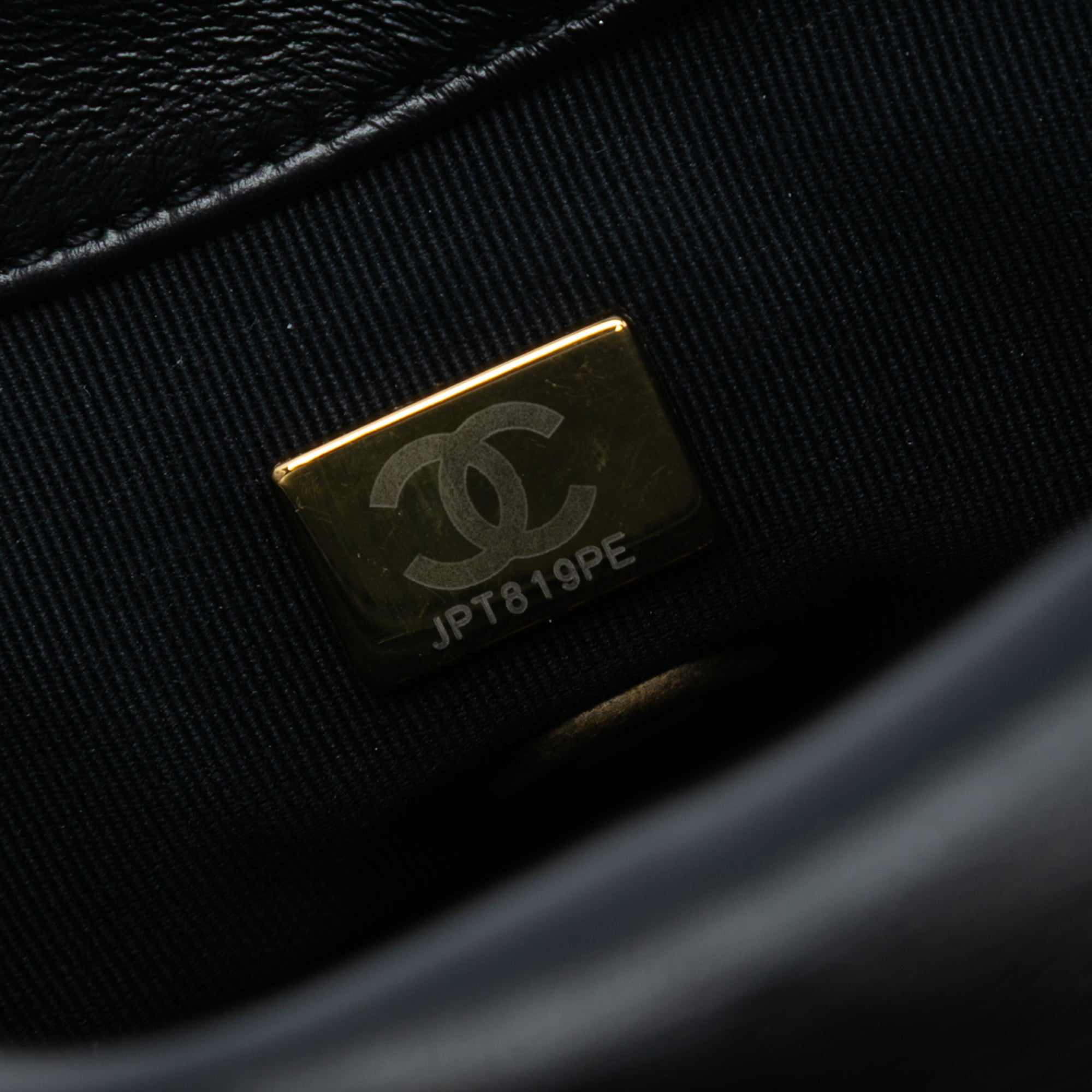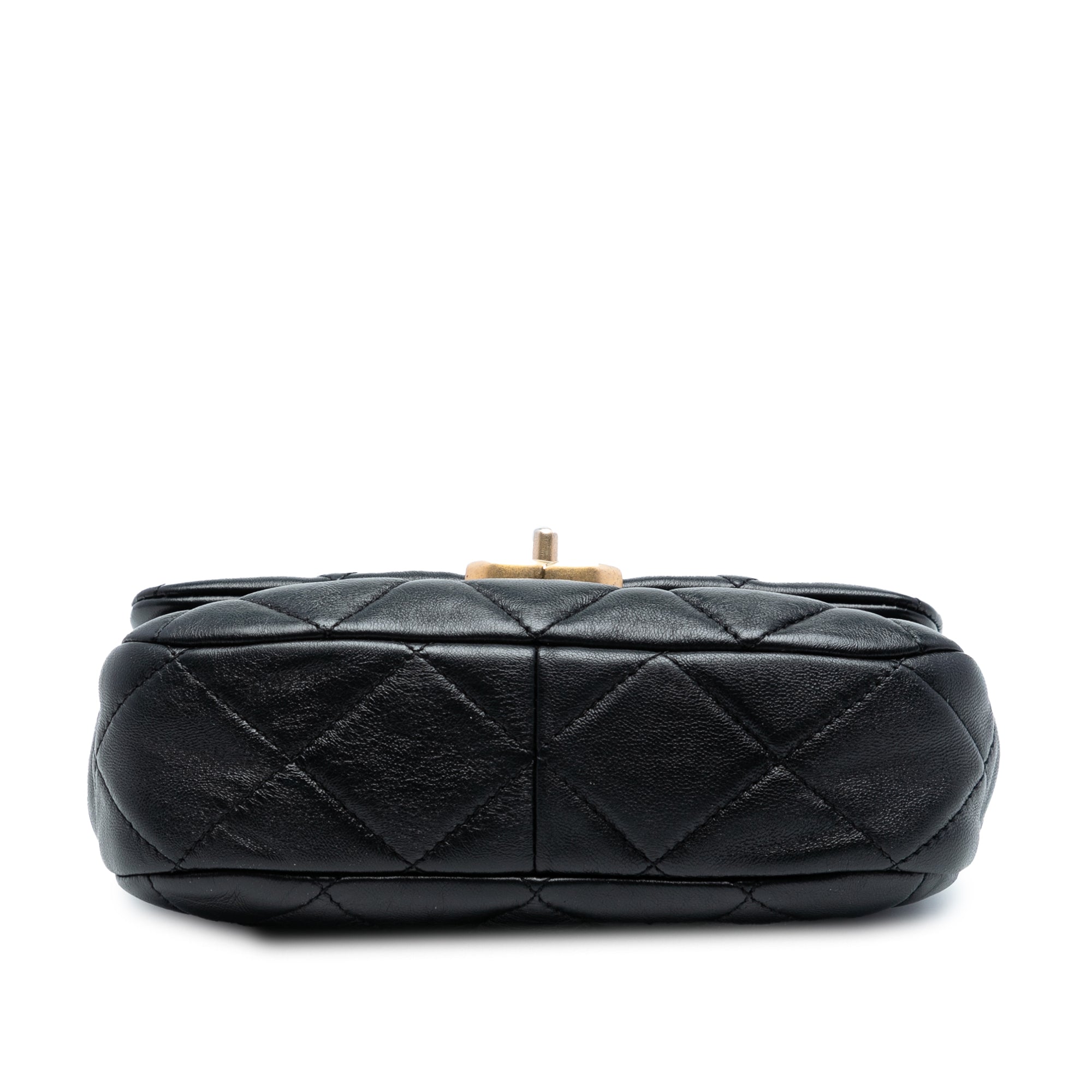 Product Details: Black Chanel Mini Quilted Lambskin Lacquered Chain Flap Crossbody Bag. This flap features a quilted lambskin leather body, a leather woven lacquered chain link strap, a front flap with twist lock closure, and an interior slip pocket. 5.9" L x 7.1" W x 2" D. Serial number JPT819PE.