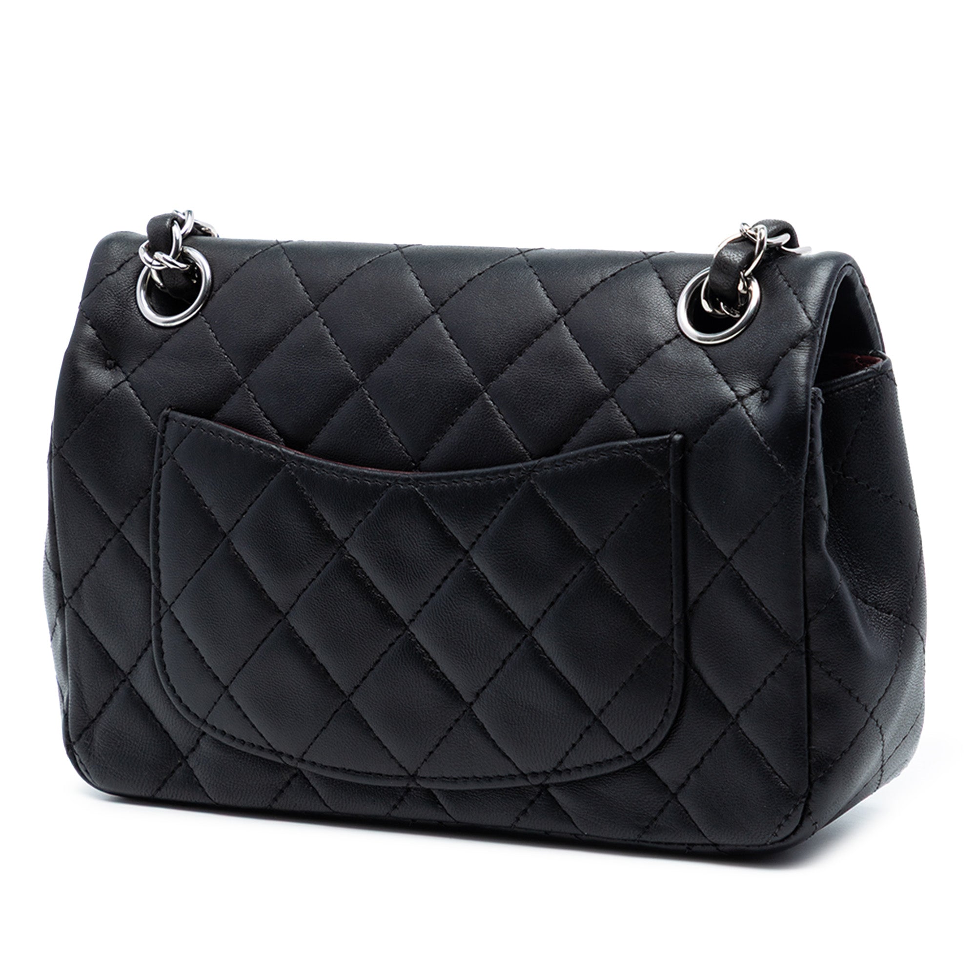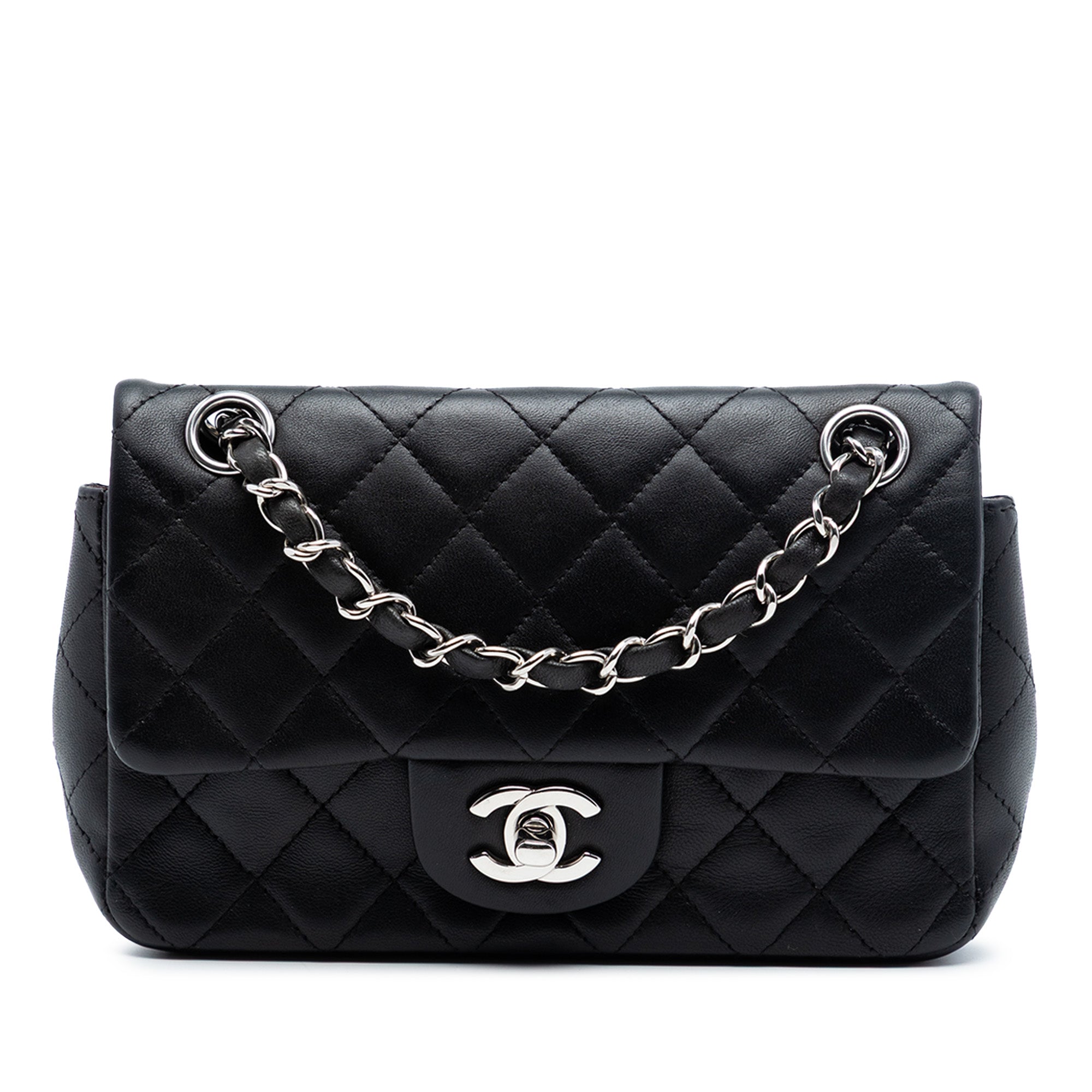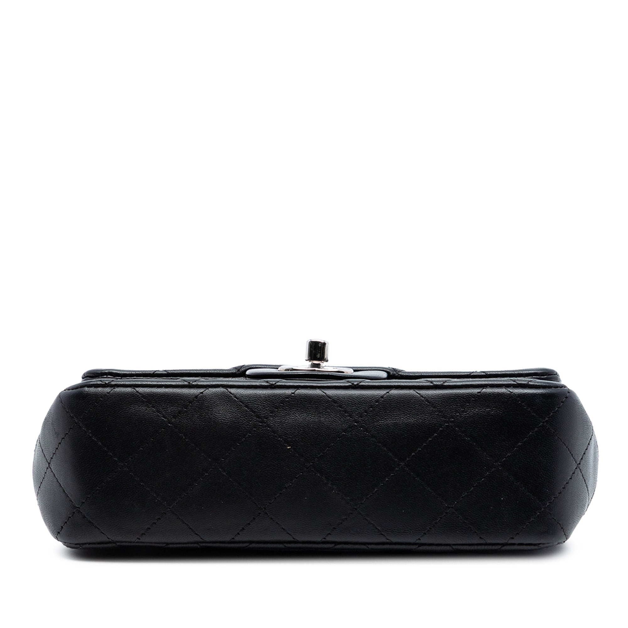 Product Details: Black Chanel Mini Rectangular Classic Lambskin Single Flap Crossbody Bag. This crossbody bag features a quilted lambskin leather body, a silver-tone leather woven chain link strap, a front flap with a twist lock closure, an exterior back slip pocket, and interior zip and slip pockets. Exterior corners are repainted. 5.3" L x 7.5" W x 2.4" D. Serial number 15620876.