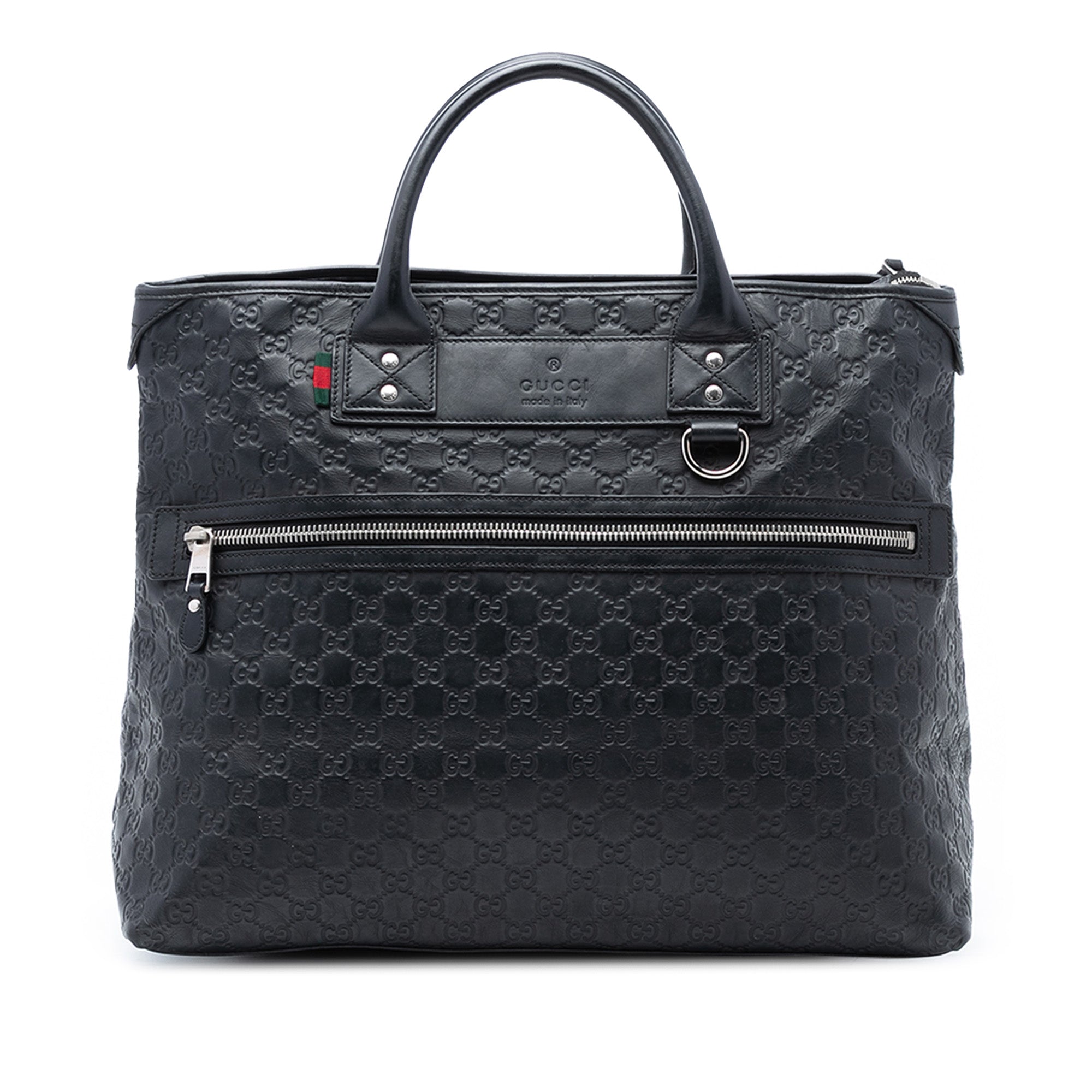 Product Details: Black Gucci Guccissima Web Travel Bag. This travel bag features an embossed leather body, rolled leather handles, a top zip closure , an exterior front zip pocket, and interior zip and slip pockets. 14.2" L x 17.7" W x 8.3" D, 4.3" drop. Serial number 246392 52098.