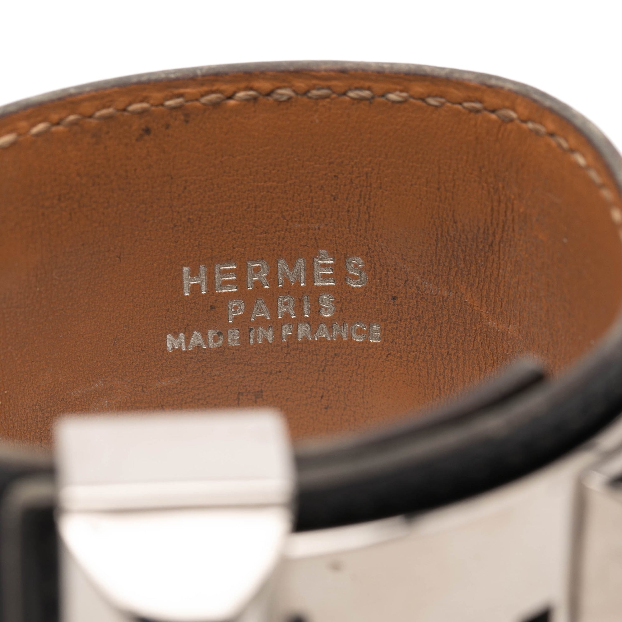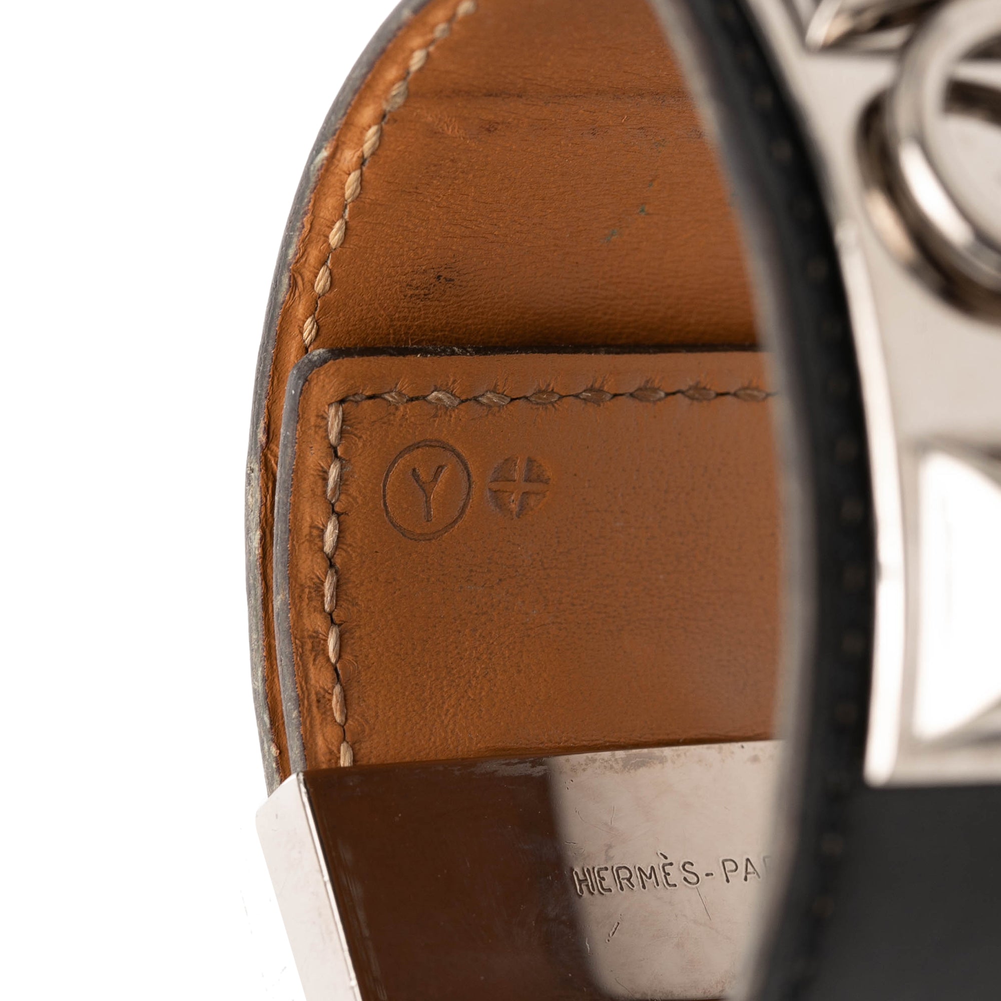 Product Details: Black Hermès Swift Leather and Palladium Plated Collier de Chien Bracelet. This bracelet features a leather body with palladium plated metal stud, and a slide lock closure. 7.1" L x 2.4" W x 0" D. Serial number 〇Y.