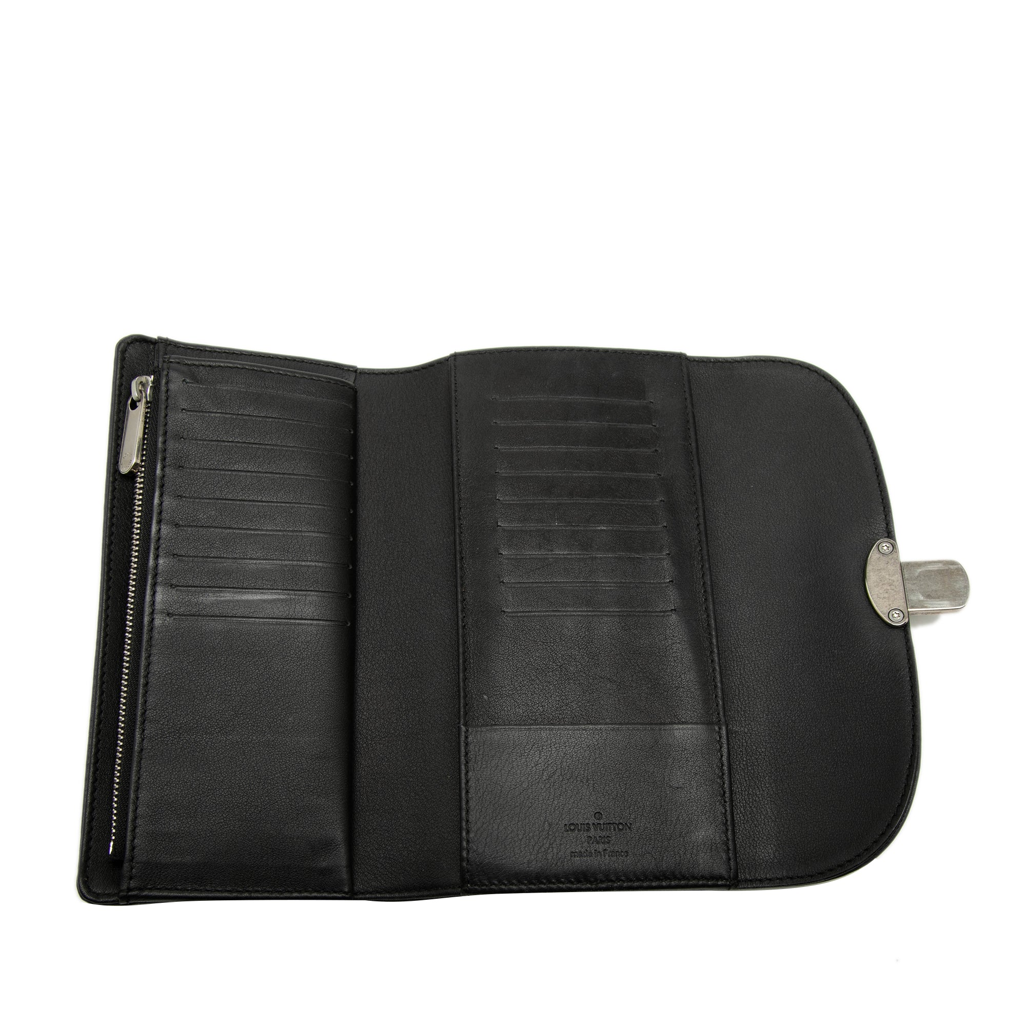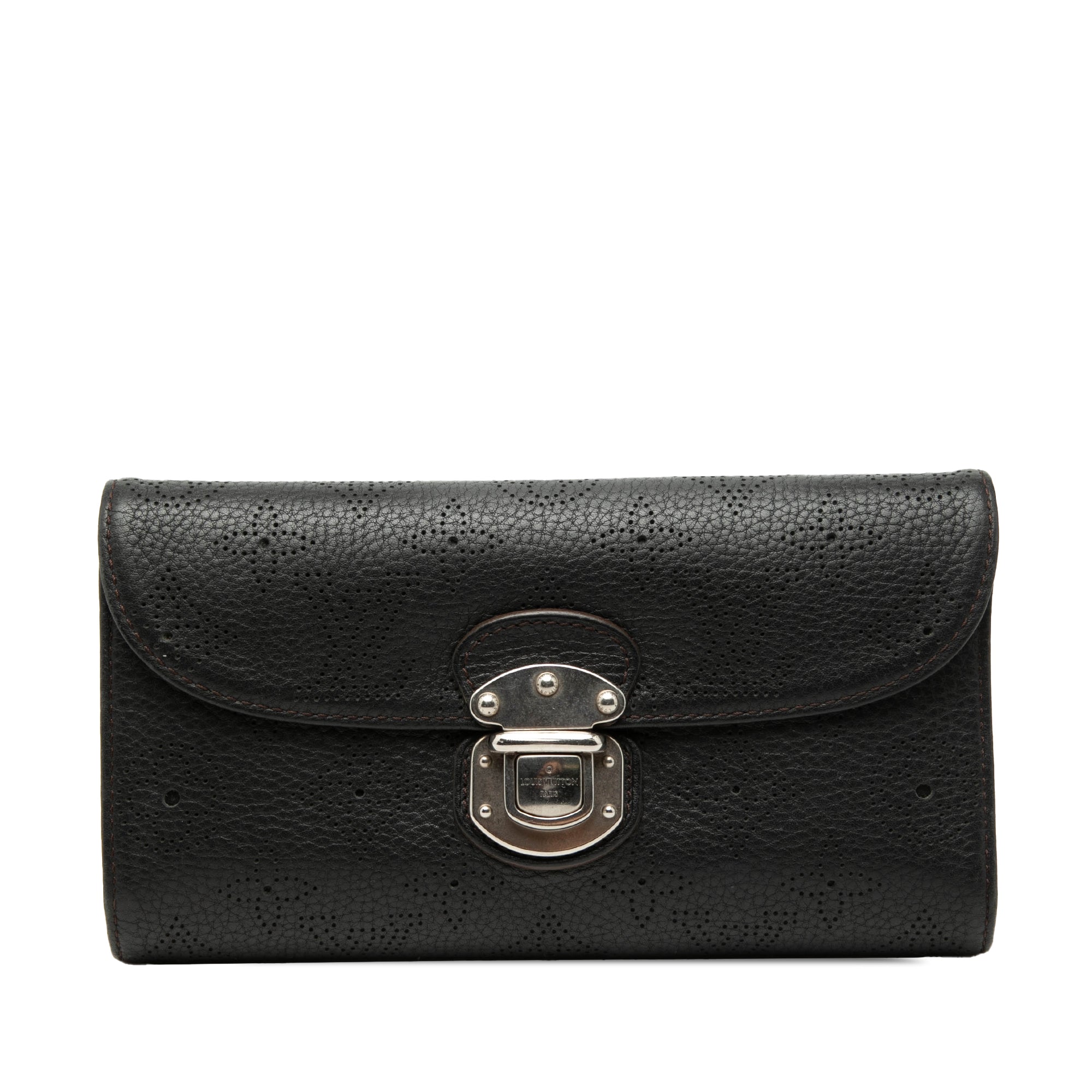 Product Details: Black Louis Vuitton Mahina Amelia Wallet. The Amelia features a leather body, a front flap with a silver-tone push lock closure, and interior zip and slip compartments. 4.1" L x 7.5" W x 1" D. Serial number TH3019.