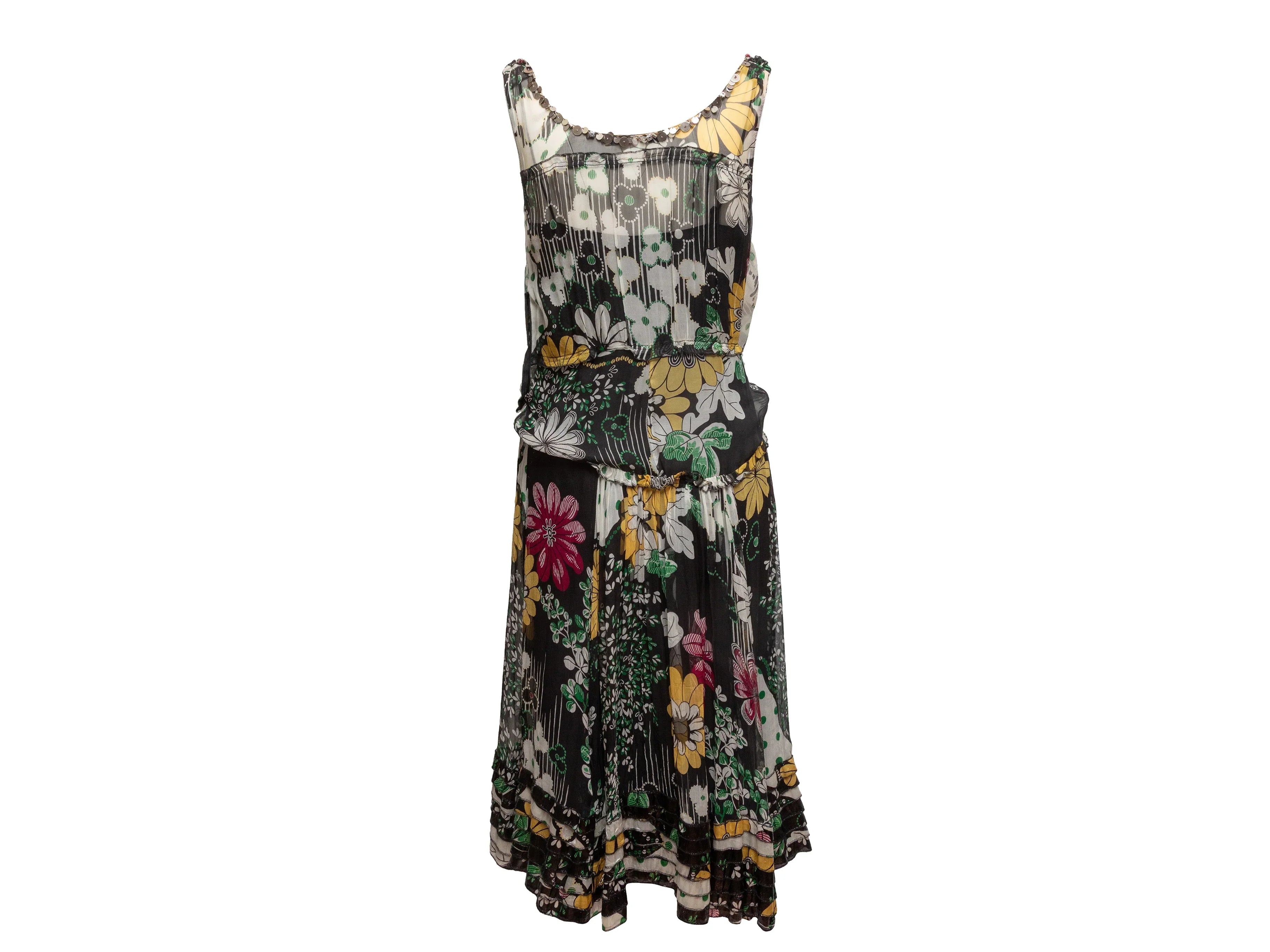 Product Details: Black and multicolor silk floral print sleeveless dress by Blumarine. V-neck featuring sequin embellishments. 34" bust, 29.5" waist, 48" length, 11.75" shoulder width.