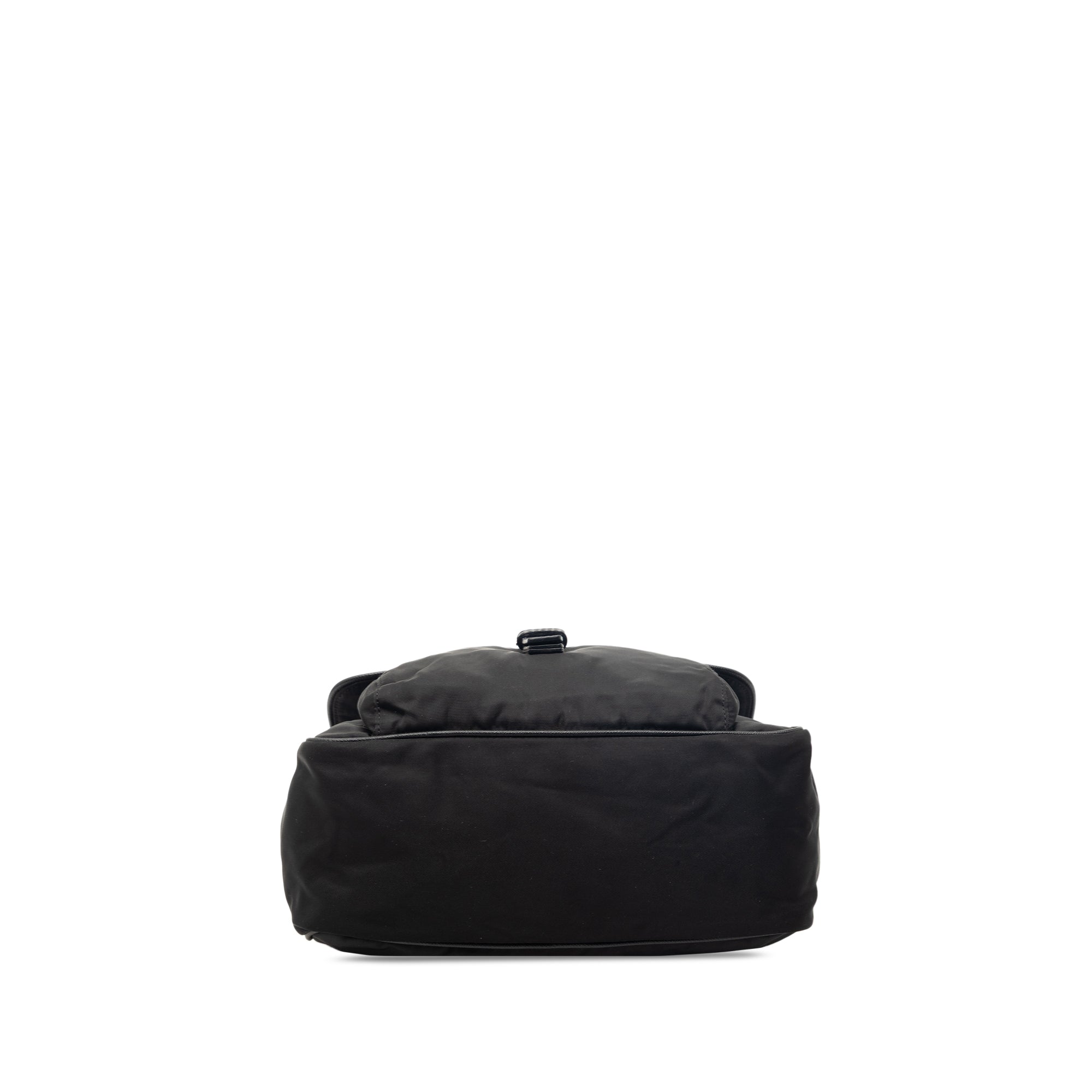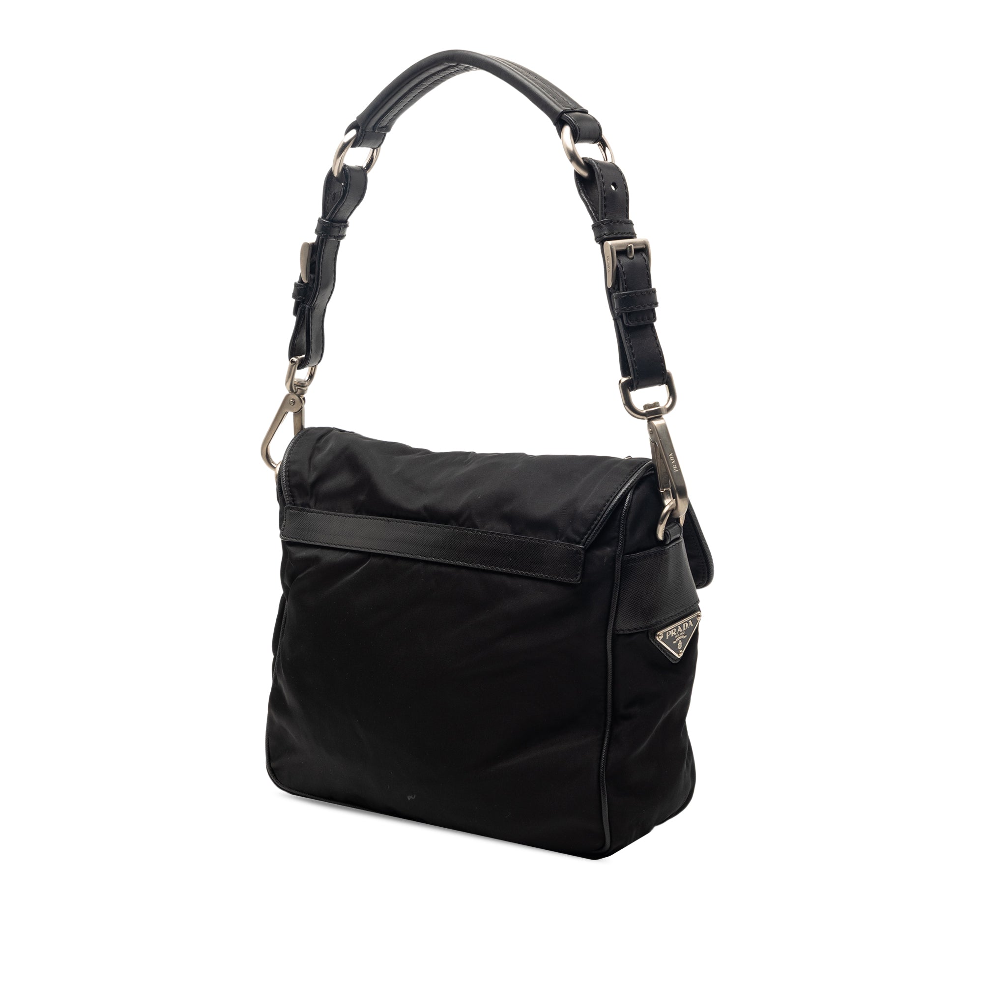 Product Details: Black Prada Saffiano Trimmed Tessuto Shoulder Bag. This shoulder bag features a nylon body with leather trim, a detachable flat leather strap, a front flap with belt buckle closure, an exterior zip pocket, and an interior zip pocket. 8.7" L x 9.1" W x 3.5" D, 7.1" drop.