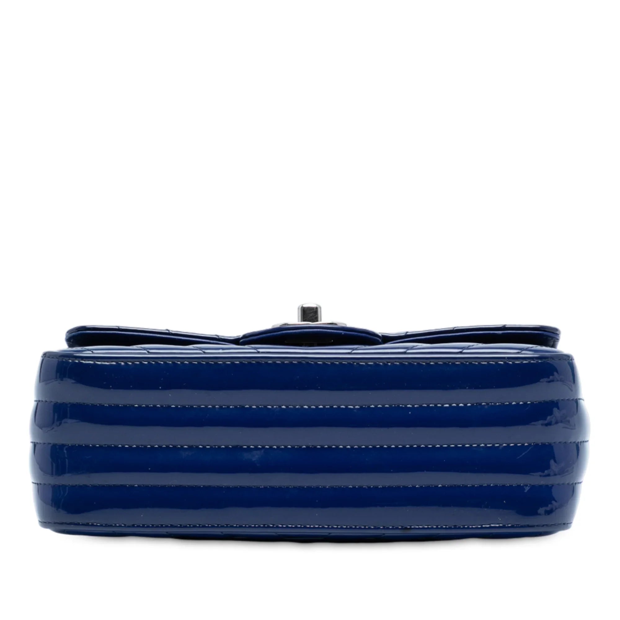 Product Details: Blue Chanel Mini Rectangular Classic Chevron Patent Single Flap Crossbody Bag. This crossbody bag features a quilted patent leather body, a leather woven chain strap, a front flap with interlocking Cs and a twist lock closure, an exterior back slip pocket, and interior zip and slip pockets. 5.1" L x 7.9" W x 2.6" D. Serial number 23692600.