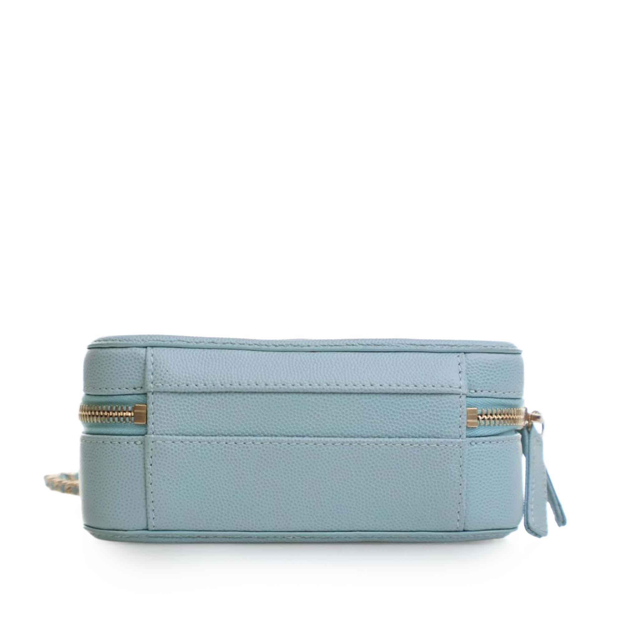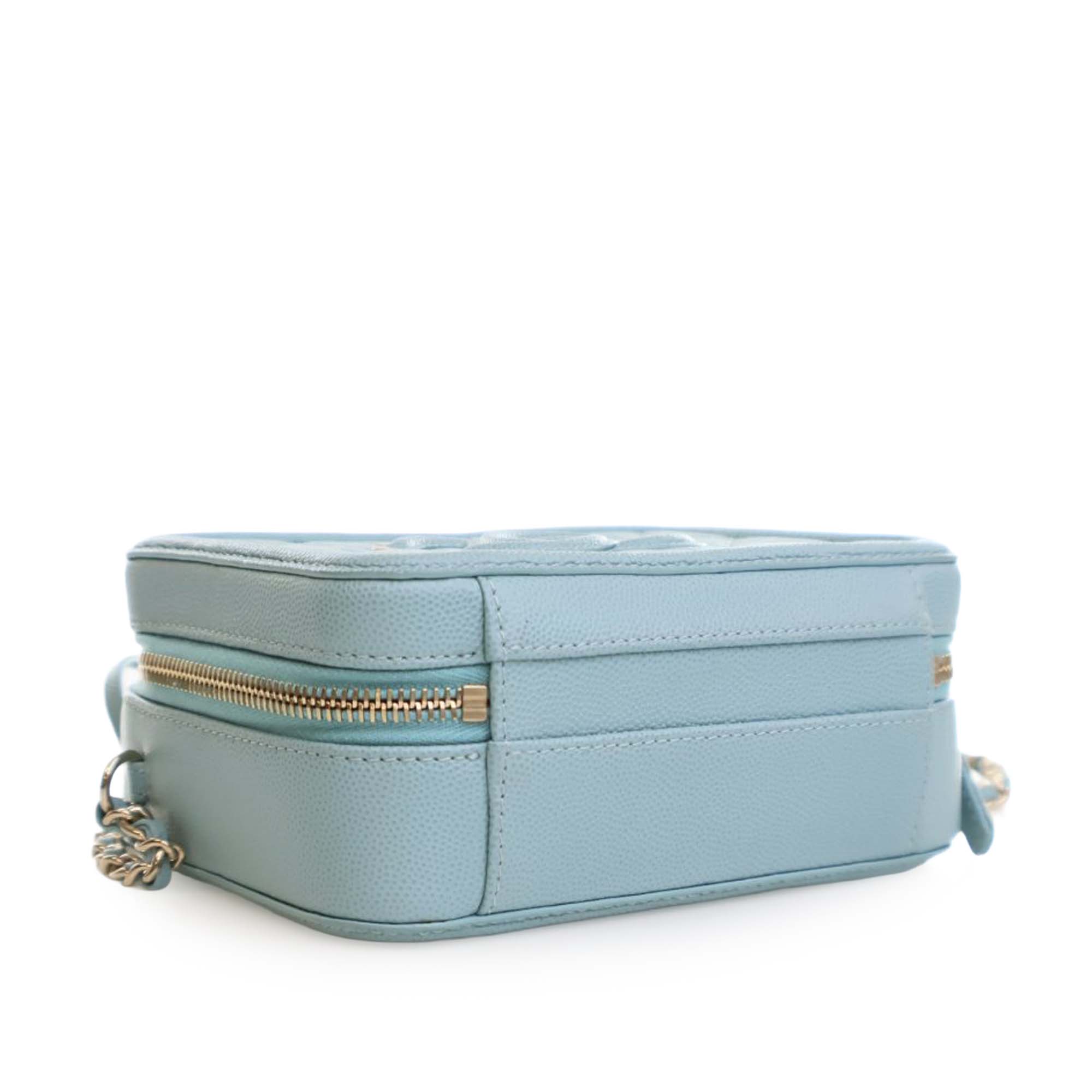 Product Details: Blue Chanel Small Caviar CC Filigree Vanity Case Satchel. The Filigree Vanity Case features a quilted caviar leather body, a flat leather top handle, a leather woven chain strap with leather guard, a zip-around closure, and interior zip and slip pockets. 4.5" L x 6.2" W x 2.5" D, 1.2" drop.