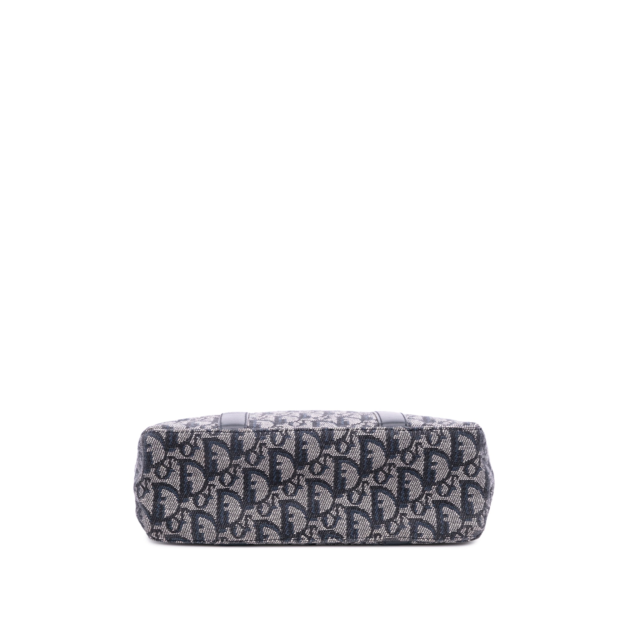 Product Details: Blue Dior Diorissimo Trotter Canvas Tote. This tote bag features a canvas body with leather trim, rolled leather handles, an open top with magnetic snap closure, and an interior zip pocket. 10.4" L x 9.4" W x 3.1" D, 4.1" drop. Serial number BO B 0071.