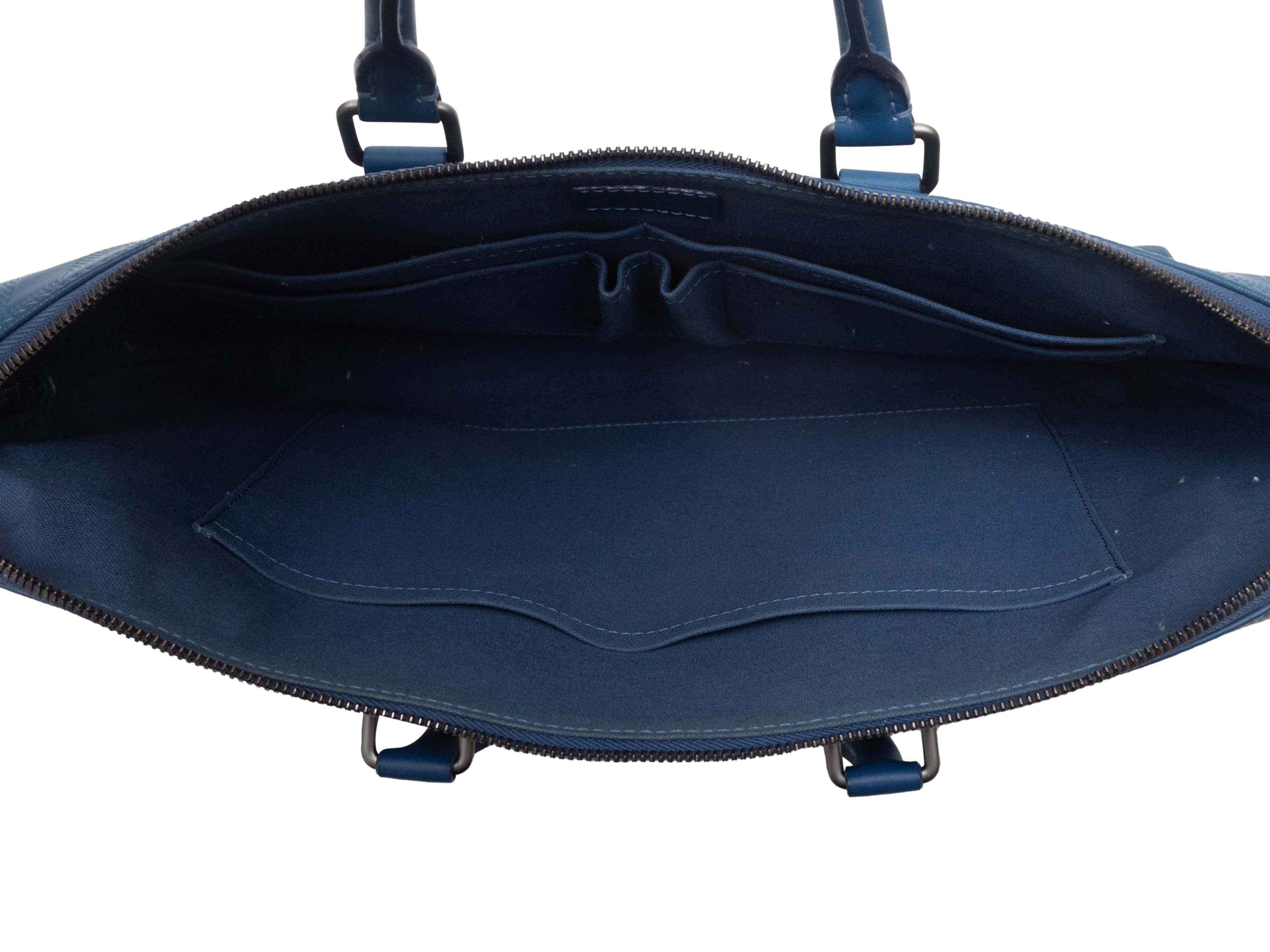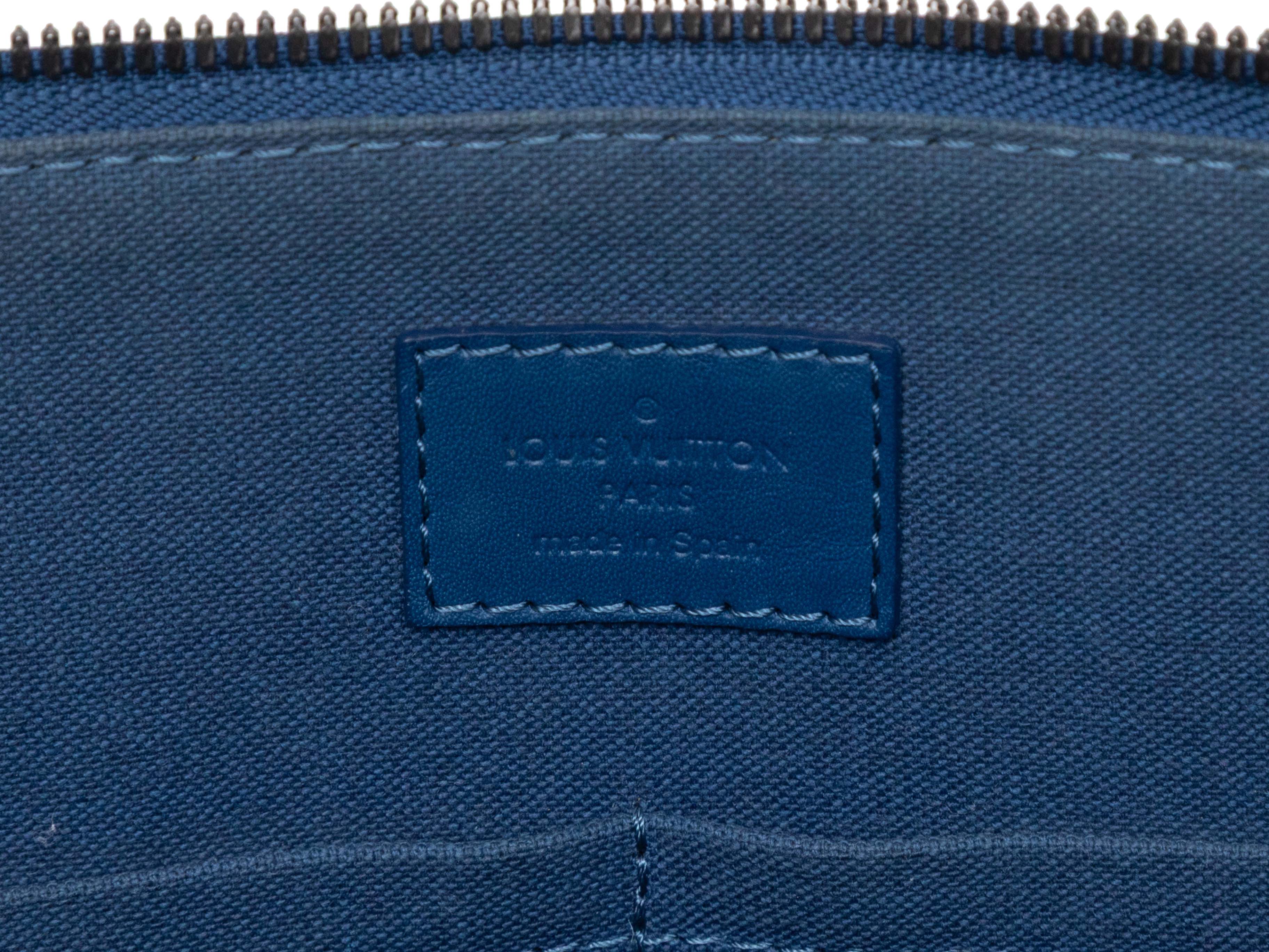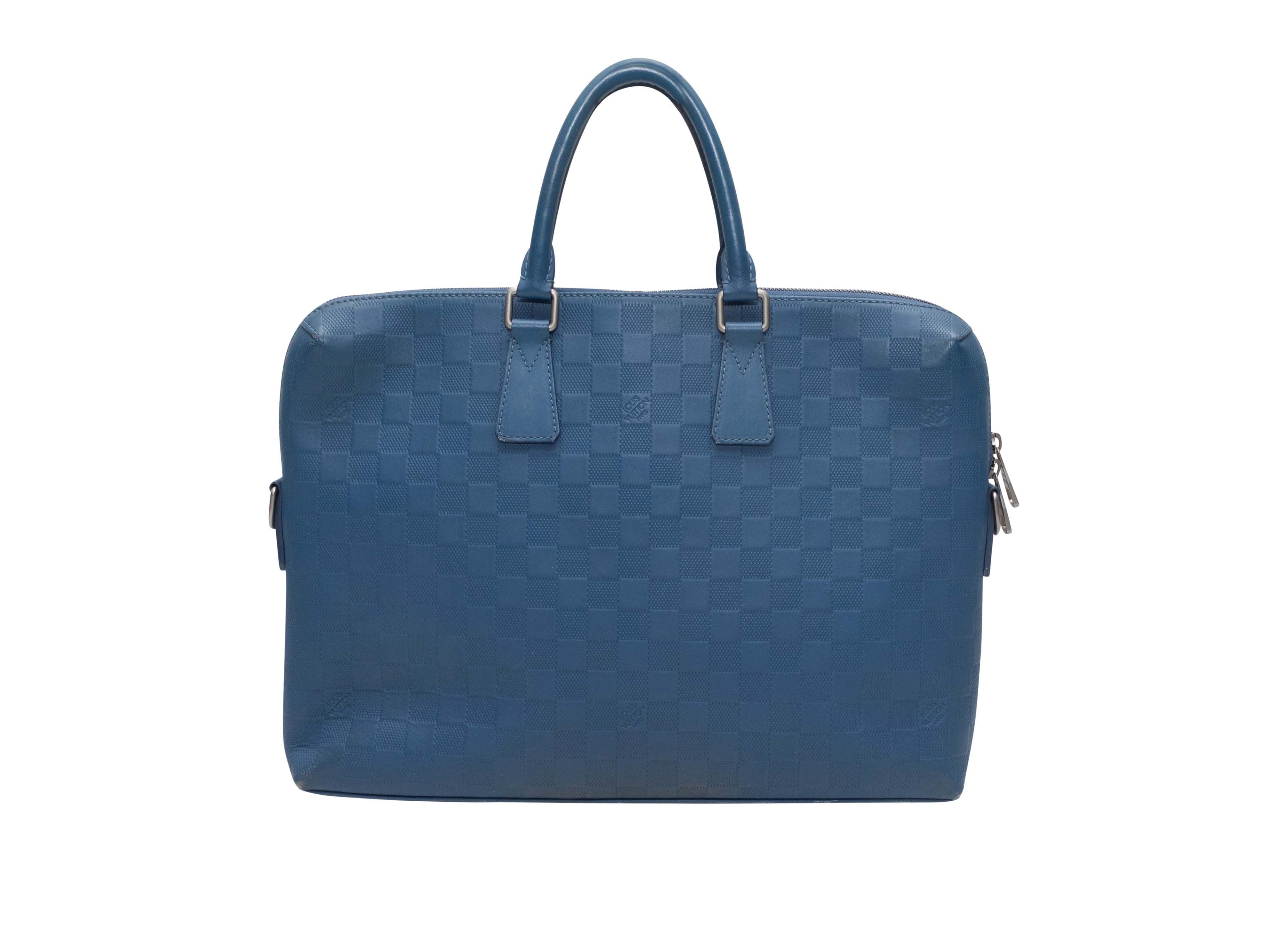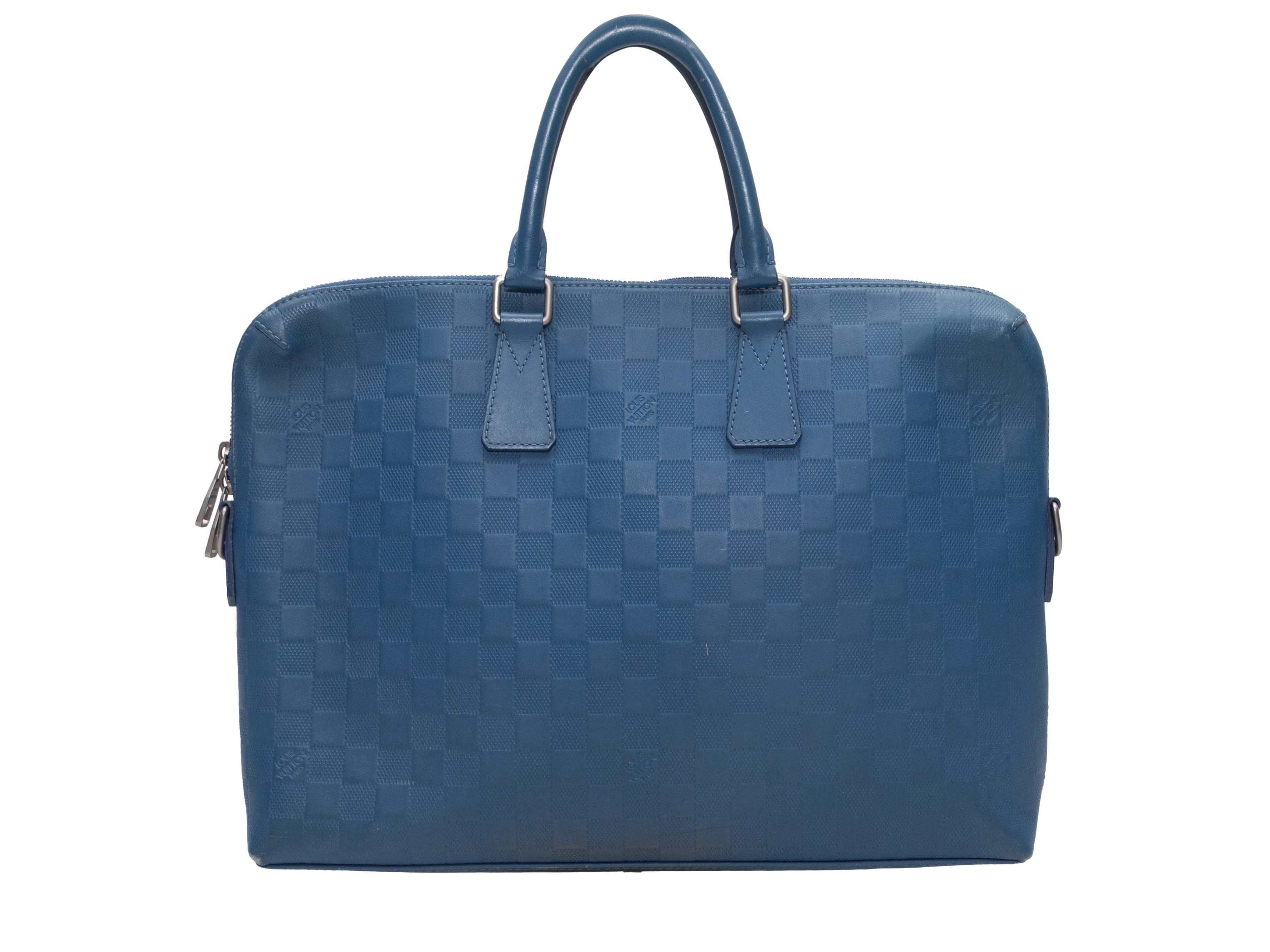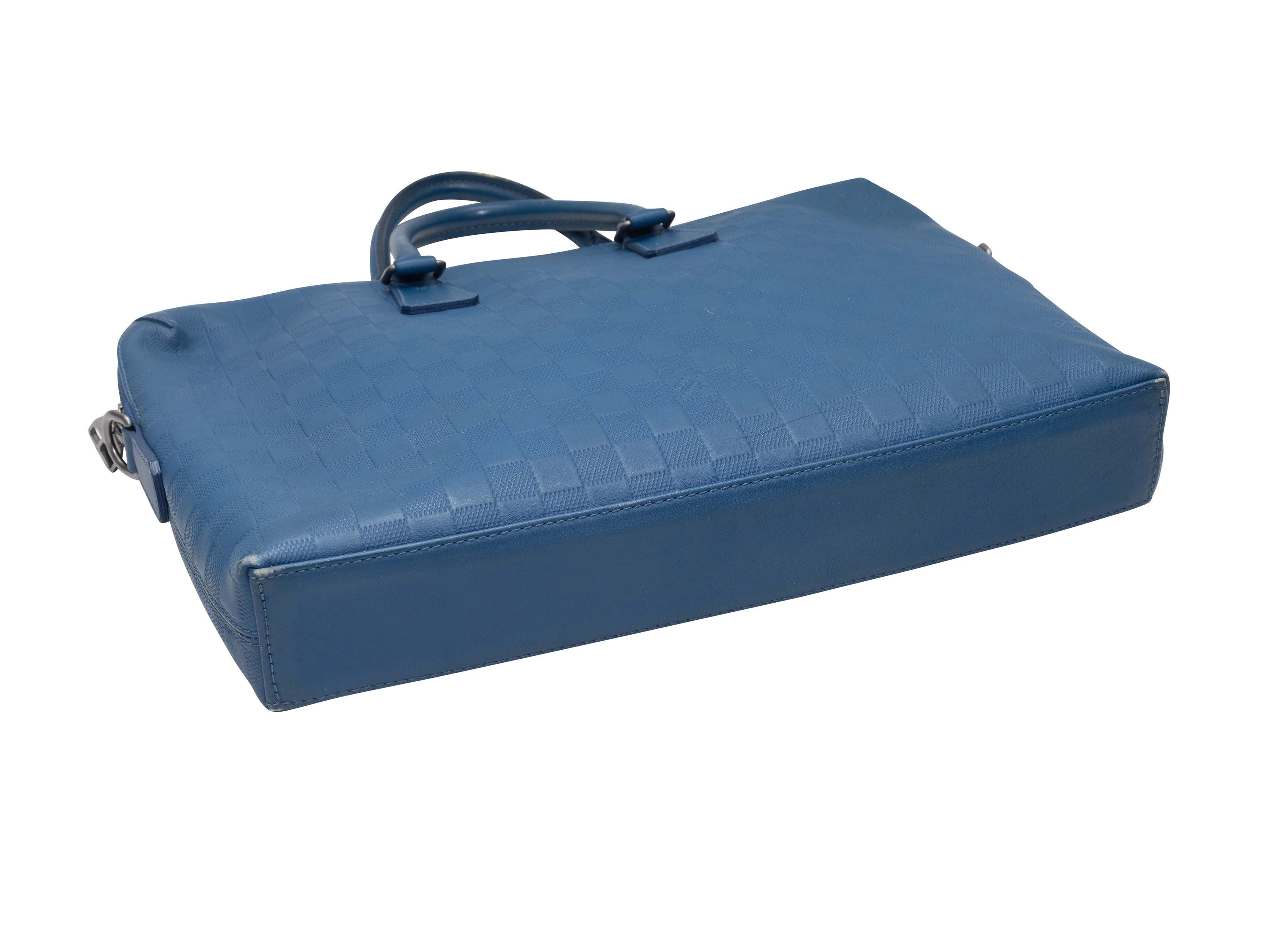 Product Details: Blue Louis Vuitton Damier Infini Top Handle Bag. This bag features a Damier Infini body, silver-tone hardware, dual rolled top handles, and a top zip closure. 40" L x 11" H x 1.5" D, 5" handle drop.