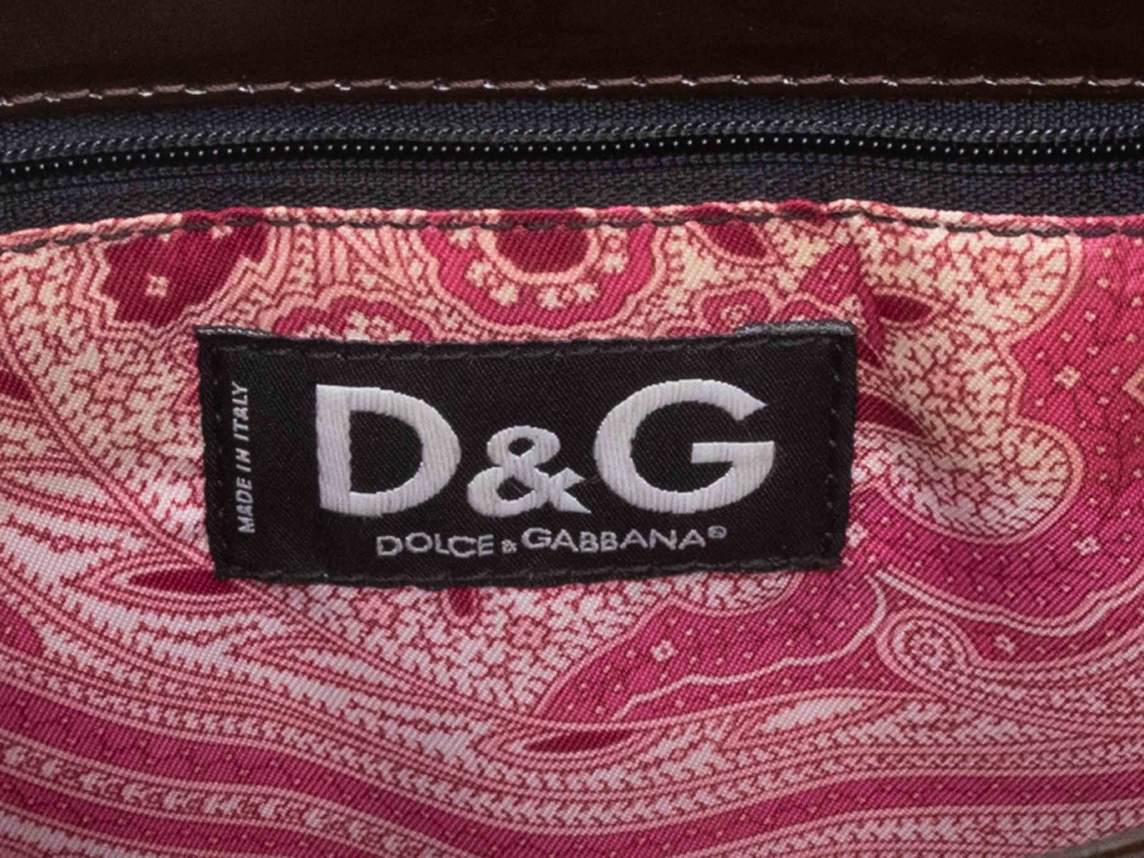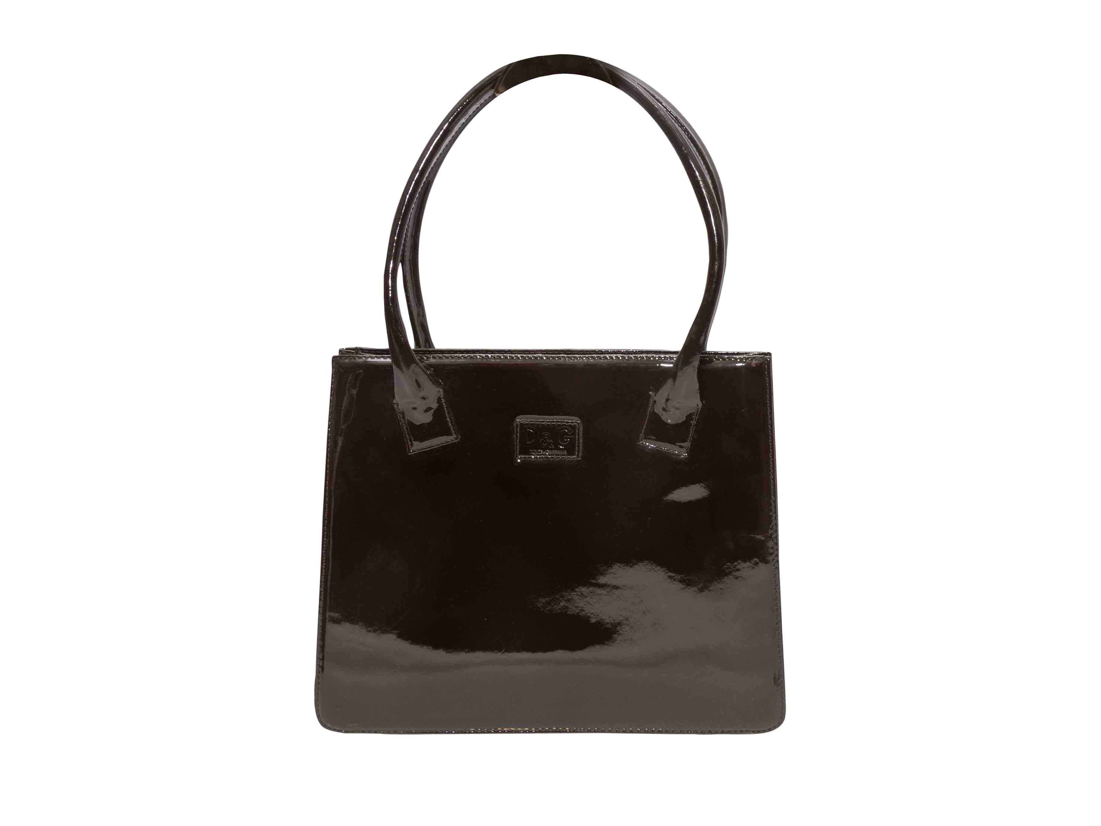 Product Details: Brown Dolce & Gabbana Patent Leather Handbag. This handbag features a patent leather body and dual rolled top handles. 12" L x 9.5" H x 4.25" D, 7" handle drop.