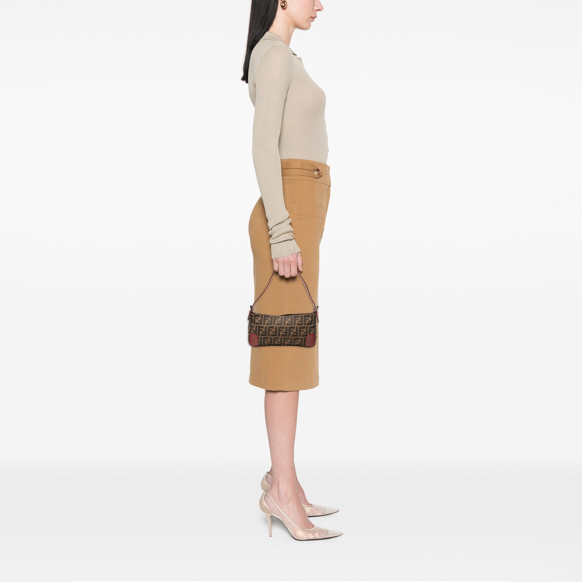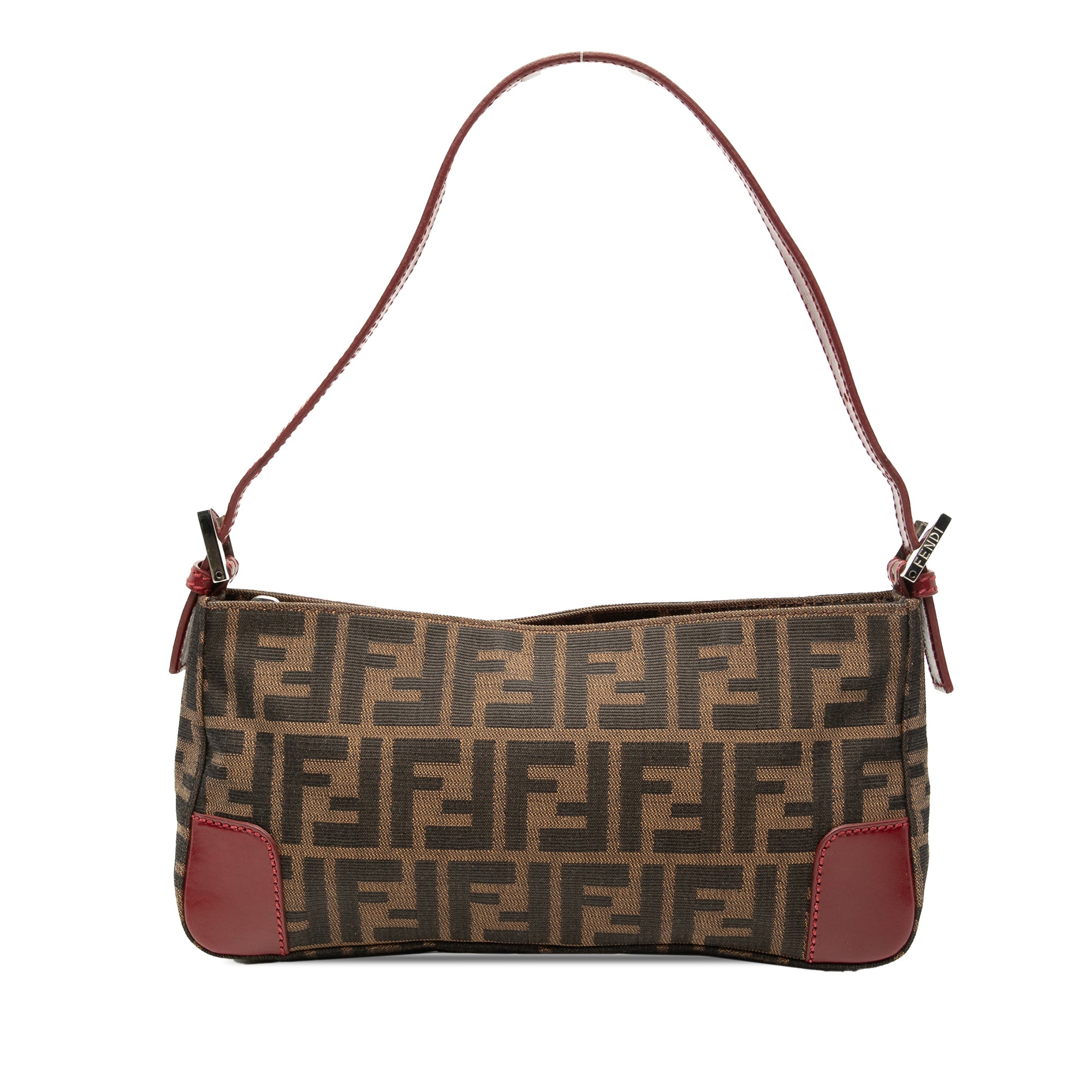 Product Details: Brown Fendi Zucca Canvas Shoulder Bag. This shoulder bag features a canvas body with leather trim, an adjustable flat leather strap, and a top zip closure. 5.1" L x 10.2" W x 1.4" D.