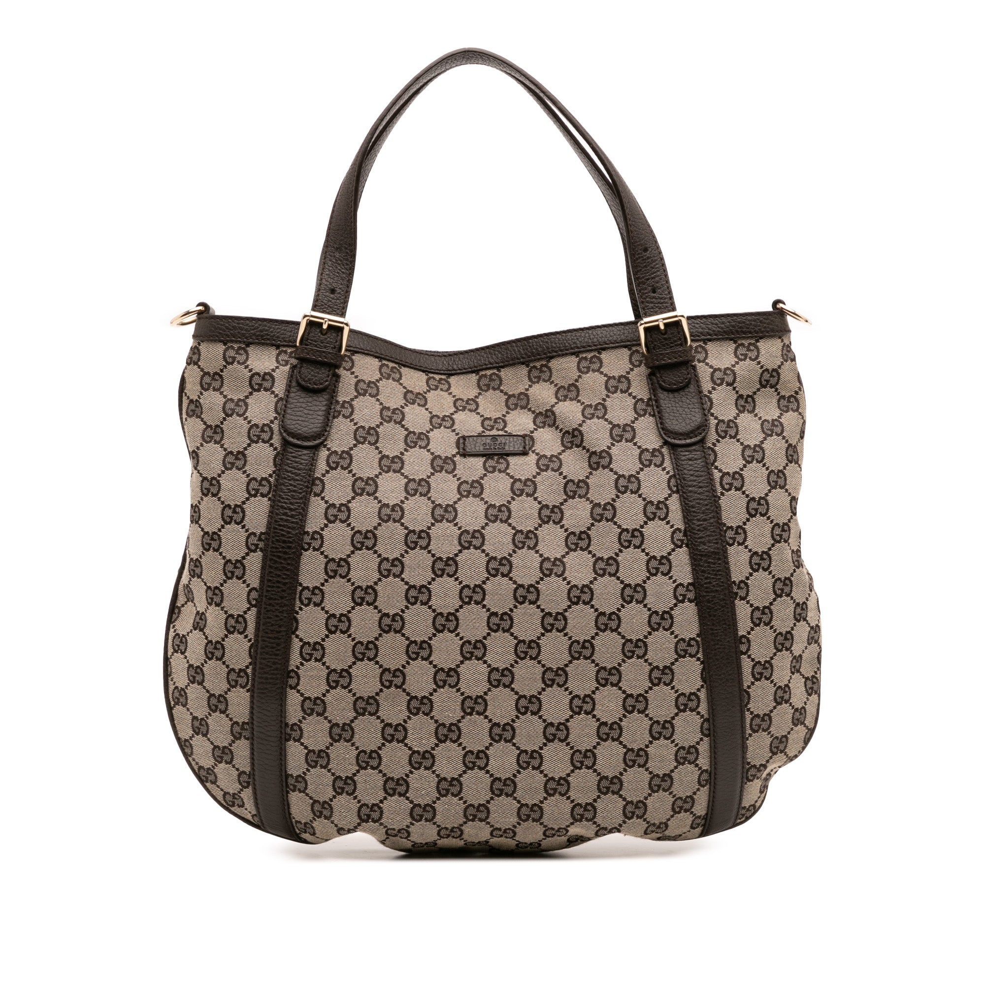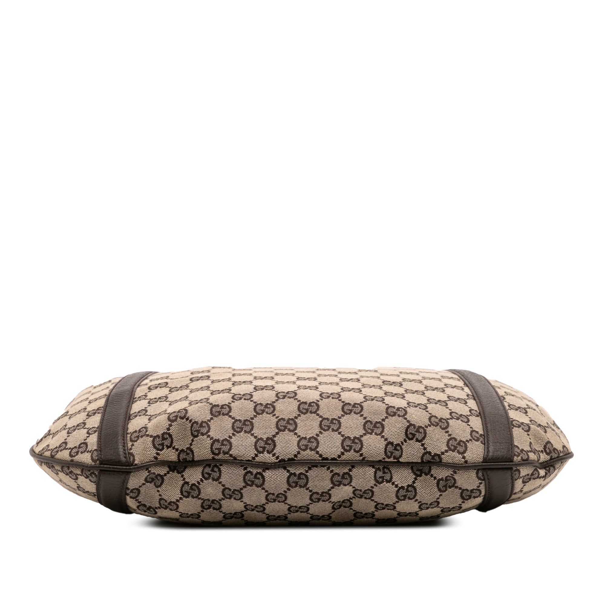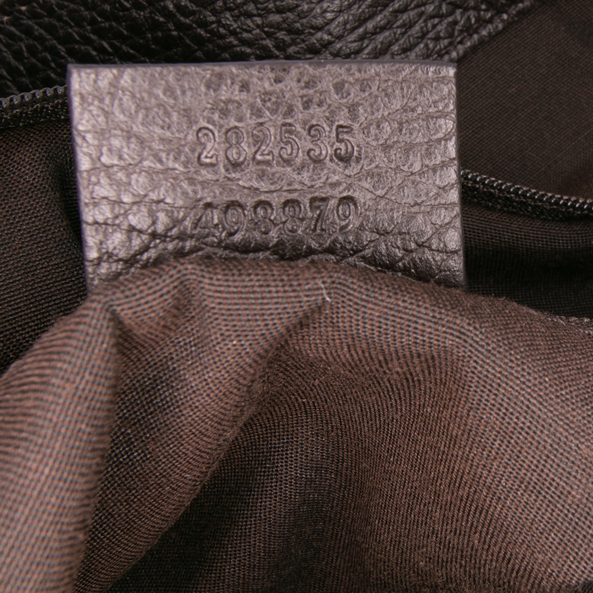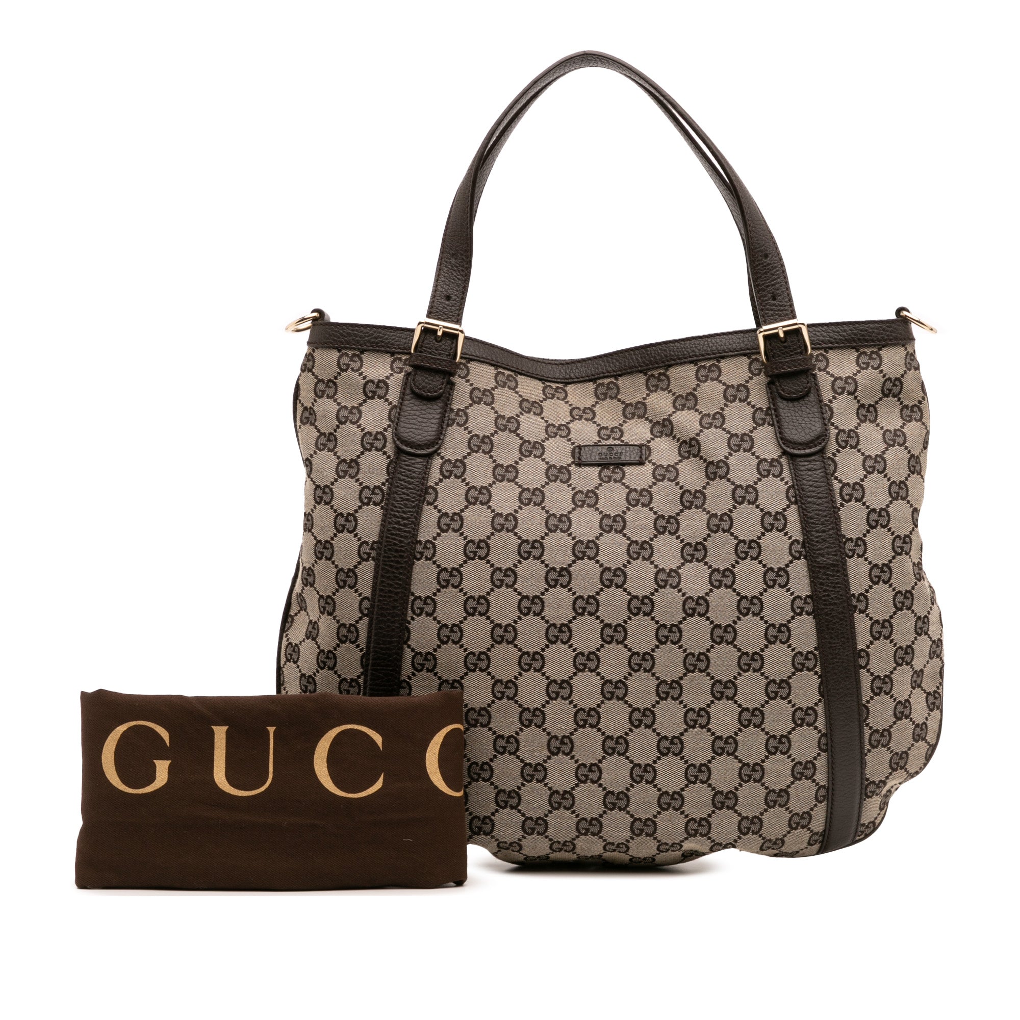Product Details: Brown Gucci GG Canvas Satchel. This satchel features a canvas body with leather trim, flat leather handles, a detachable flat leather strap, an open top with magnetic snap closure, and interior zip and slip pockets. 13.6" L x 15.7" W x 0.4" D, 5.7" drop. Serial number 282535 498879.