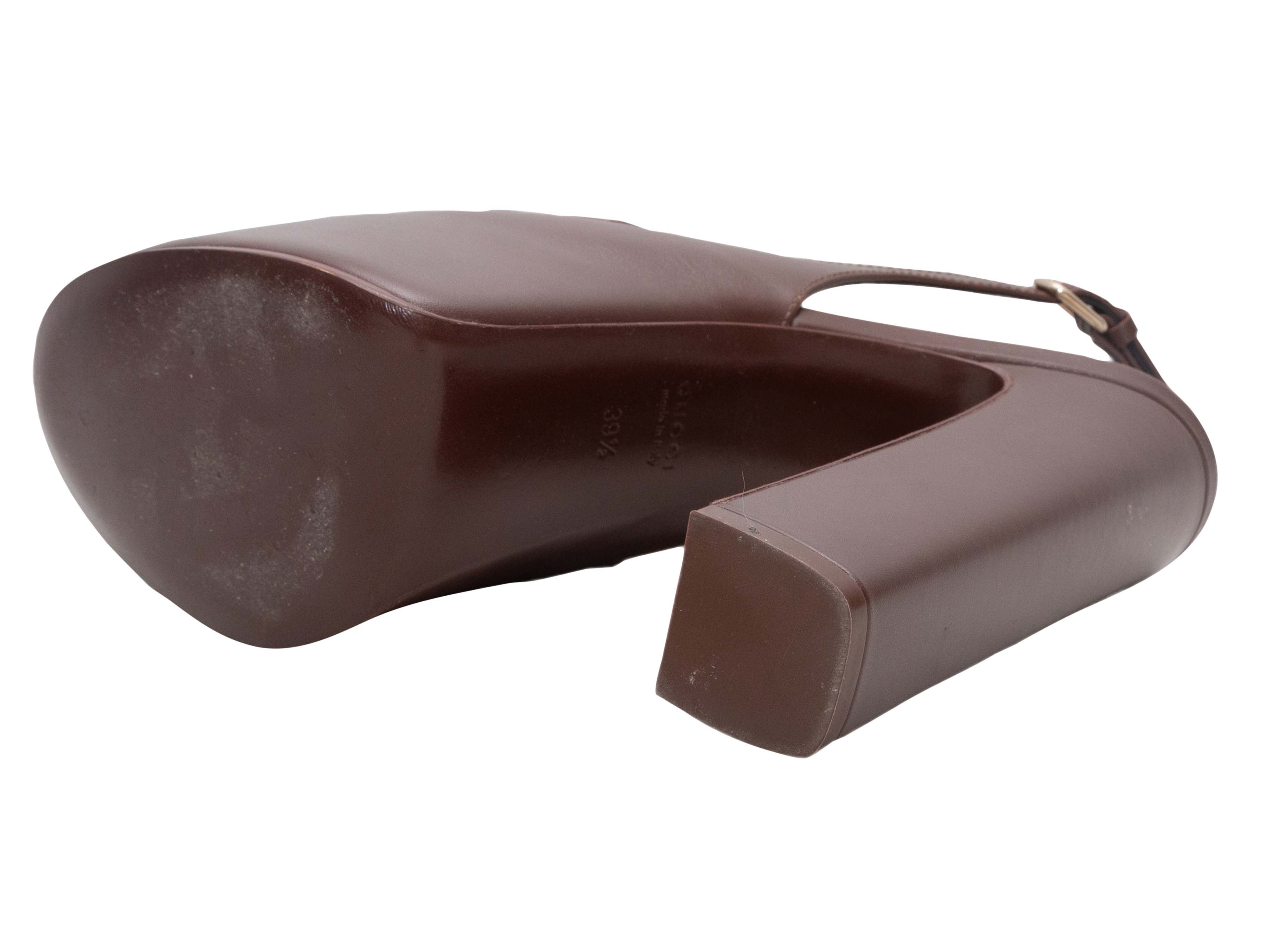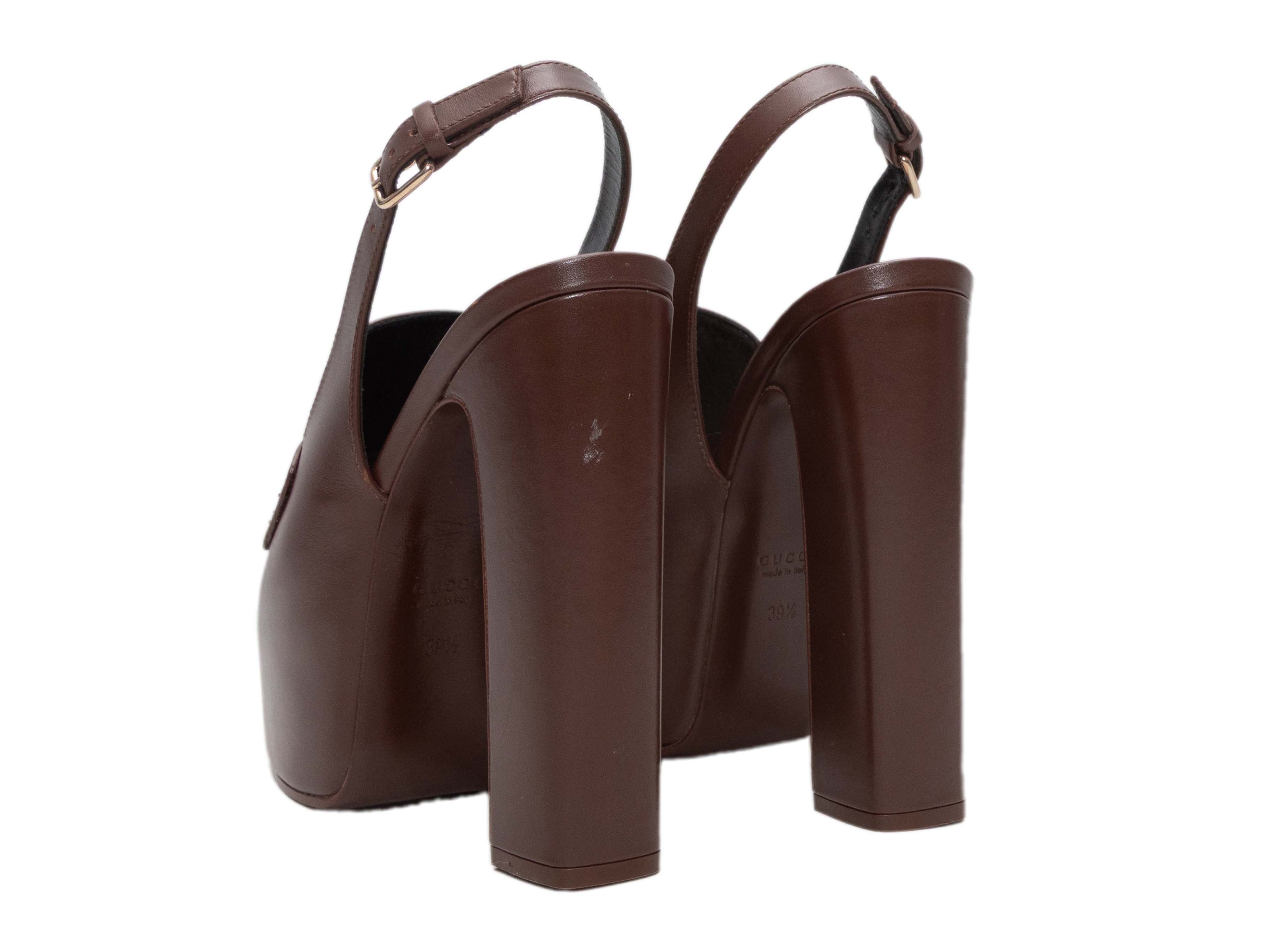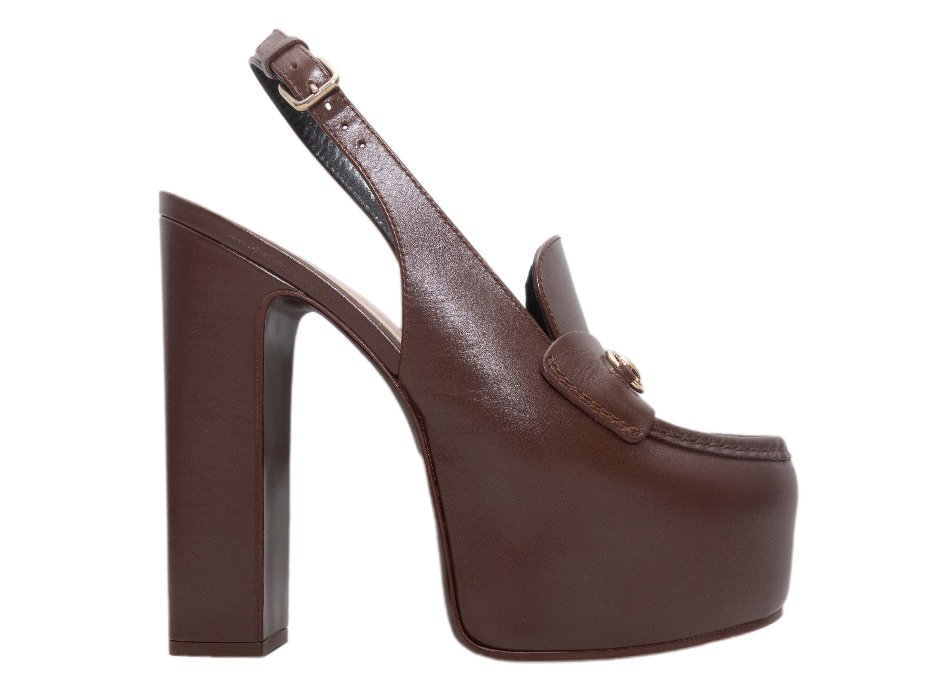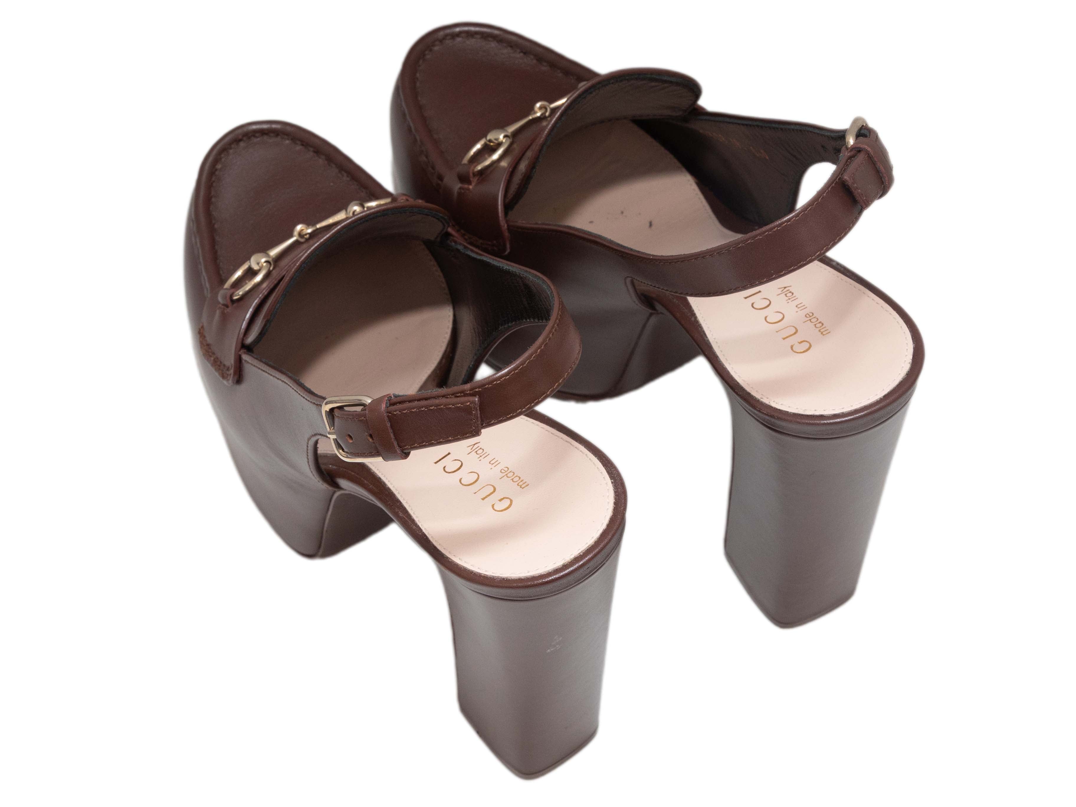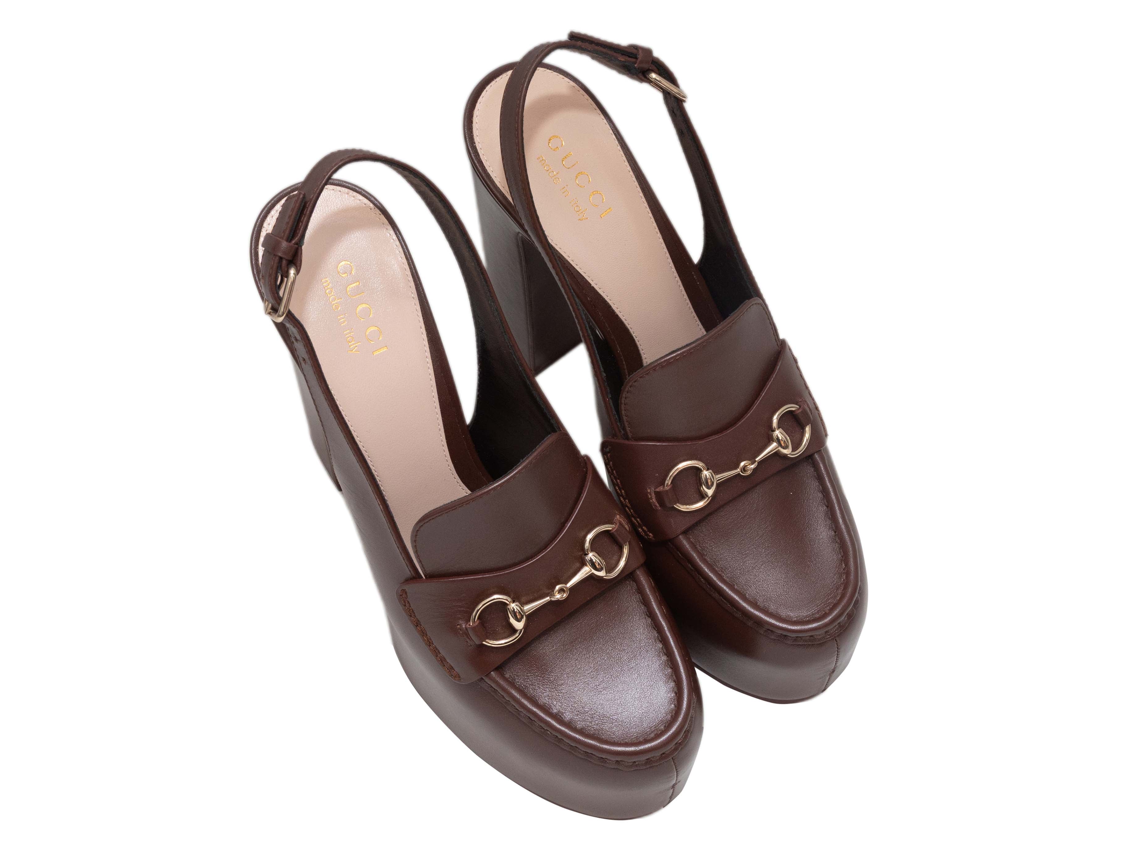 Product Details: Brown leather platform slingback heels by Gucci. Gold-tone Horsebit hardware at tops. Block heels. Gold-tone buckle closures at slingback straps. 2.5" platform height, 6" heel height.