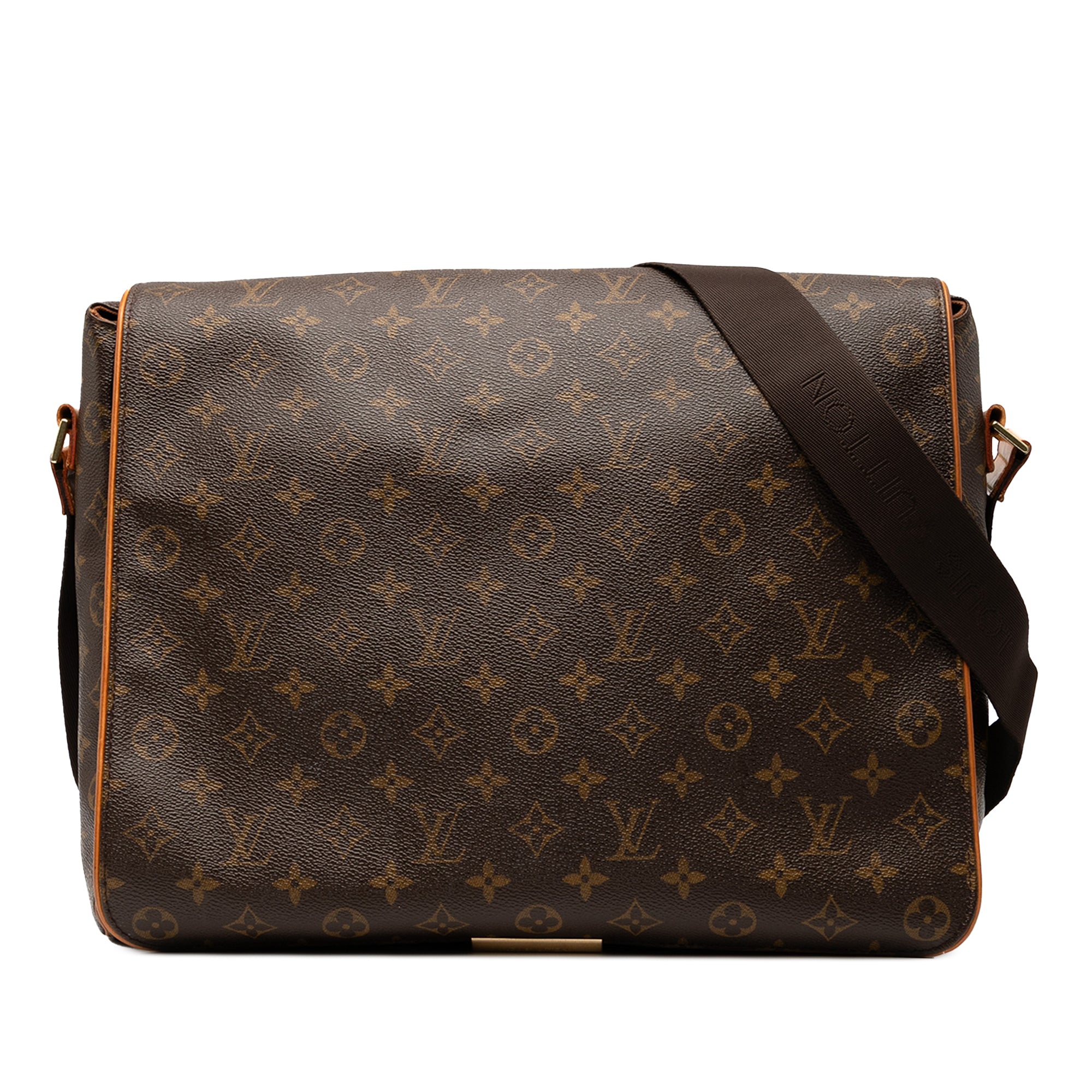 Product Details: Brown Louis Vuitton Monogram Abbesses Crossbody Bag. The Abbesses features a monogram canvas body with vachetta leather trim, an adjustable flat shoulder strap, a front flap, and interior zip and slip pockets. 11" L x 14.2" W x 3.9" D. Serial number CA0064.