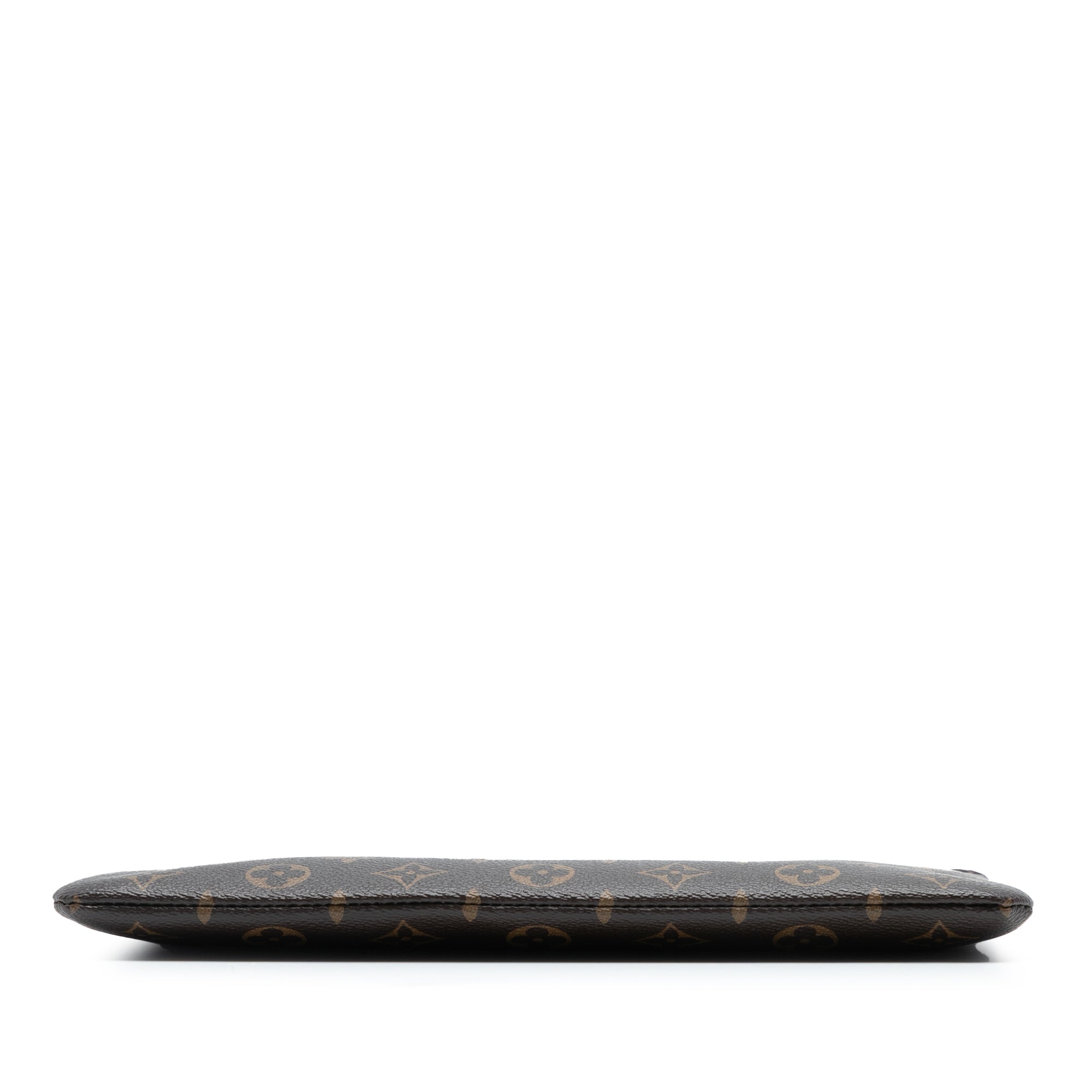 Product Details: Brown Louis Vuitton Monogram Daily Pouch Clutch Bag. The Daily Pouch features a monogram canvas body with leather trim, a top zip closure, and an interior slip pocket. 8.1" L x 11.4" W x 0.2" D. Serial number TN3129.