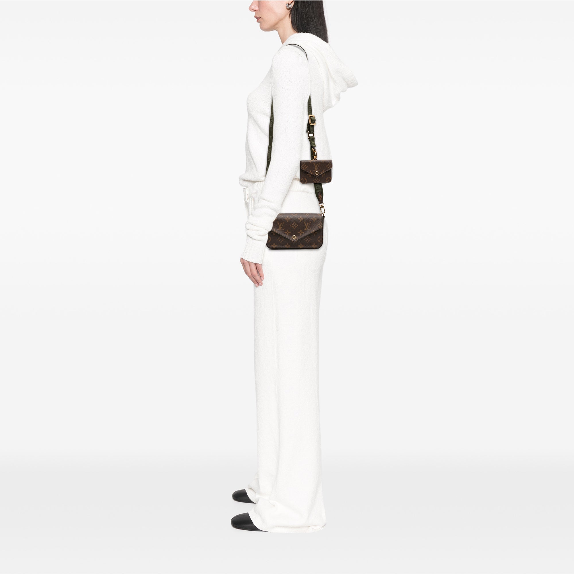 Product Details: Brown Louis Vuitton Monogram Felicie Strap And Go Crossbody Bag. The Felicie Strap and Go features a monogram canvas body, an adjustable and detachable flat strap, a front flap with snap closure, an interior slip pocket, and interior card slots. It comes with a detachable flap pouch with snap closure. 3.9" L x 6.7" W x 1.6" D. Serial number FH0241.