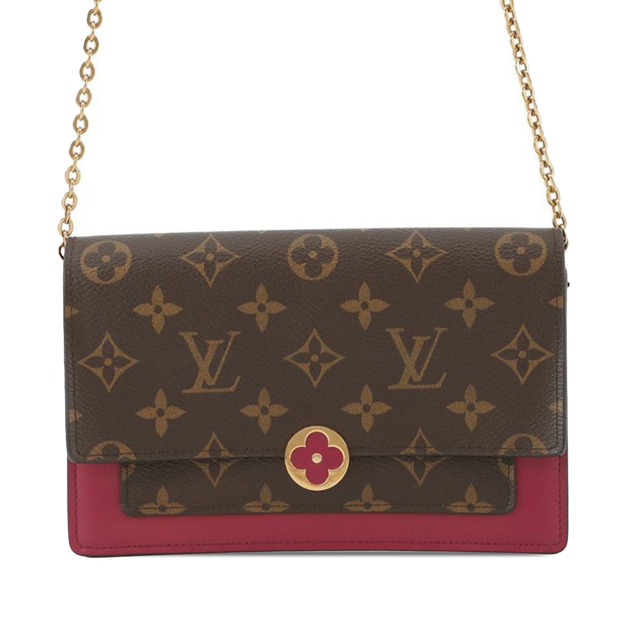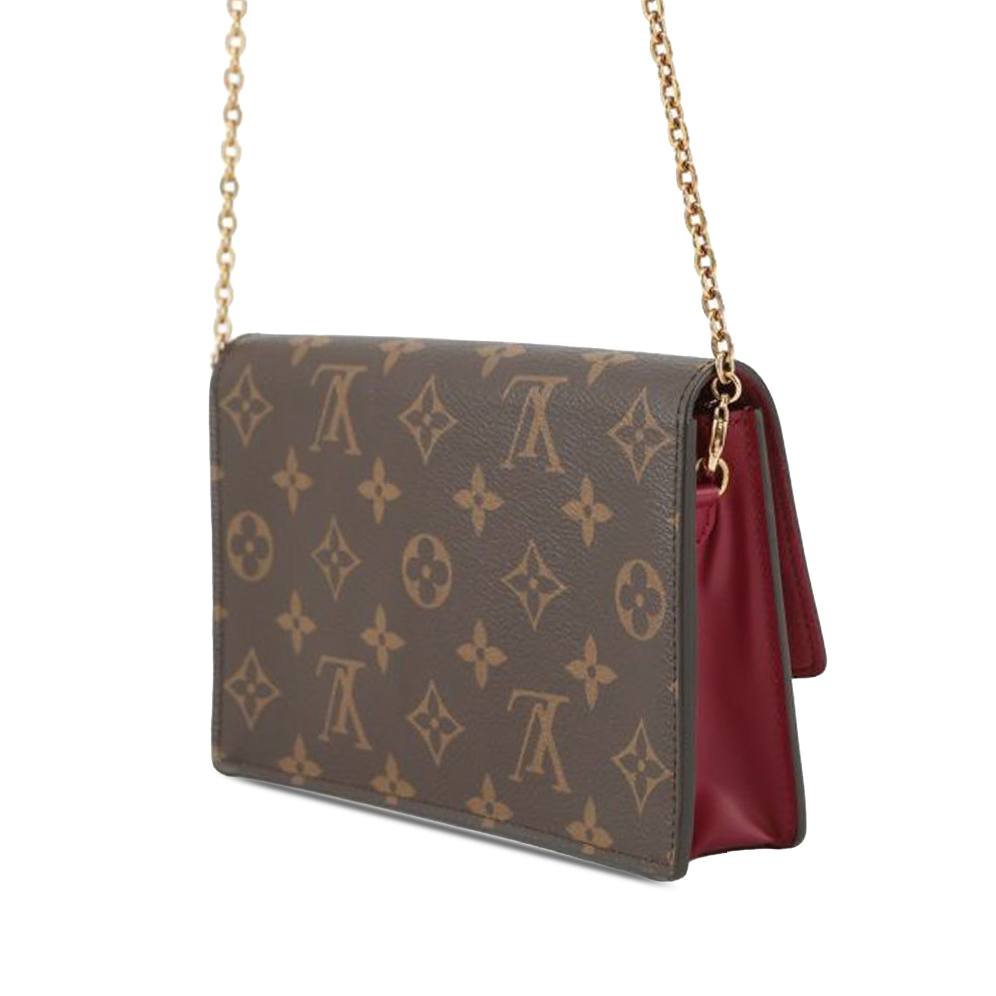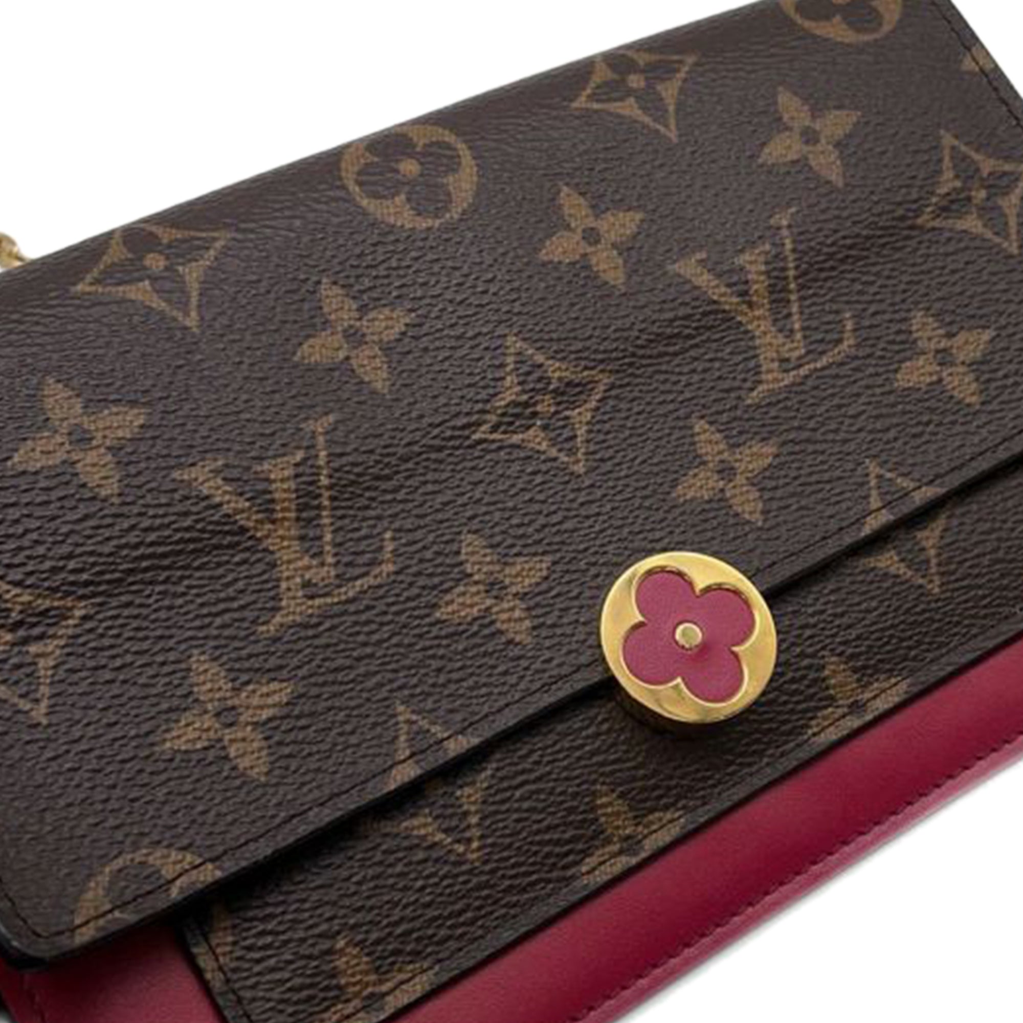 Product Details: Brown Louis Vuitton Monogram Flore Wallet On Chain Crossbody Bag. The Flore crossbody bag features a monogram canvas body with leather trim, a detachable chain link shoulder strap, a front flap with magnetic snap closure, and interior zip and slip pockets. 4.9" L x 7.7" W x 1.6" D, 9.4" drop.