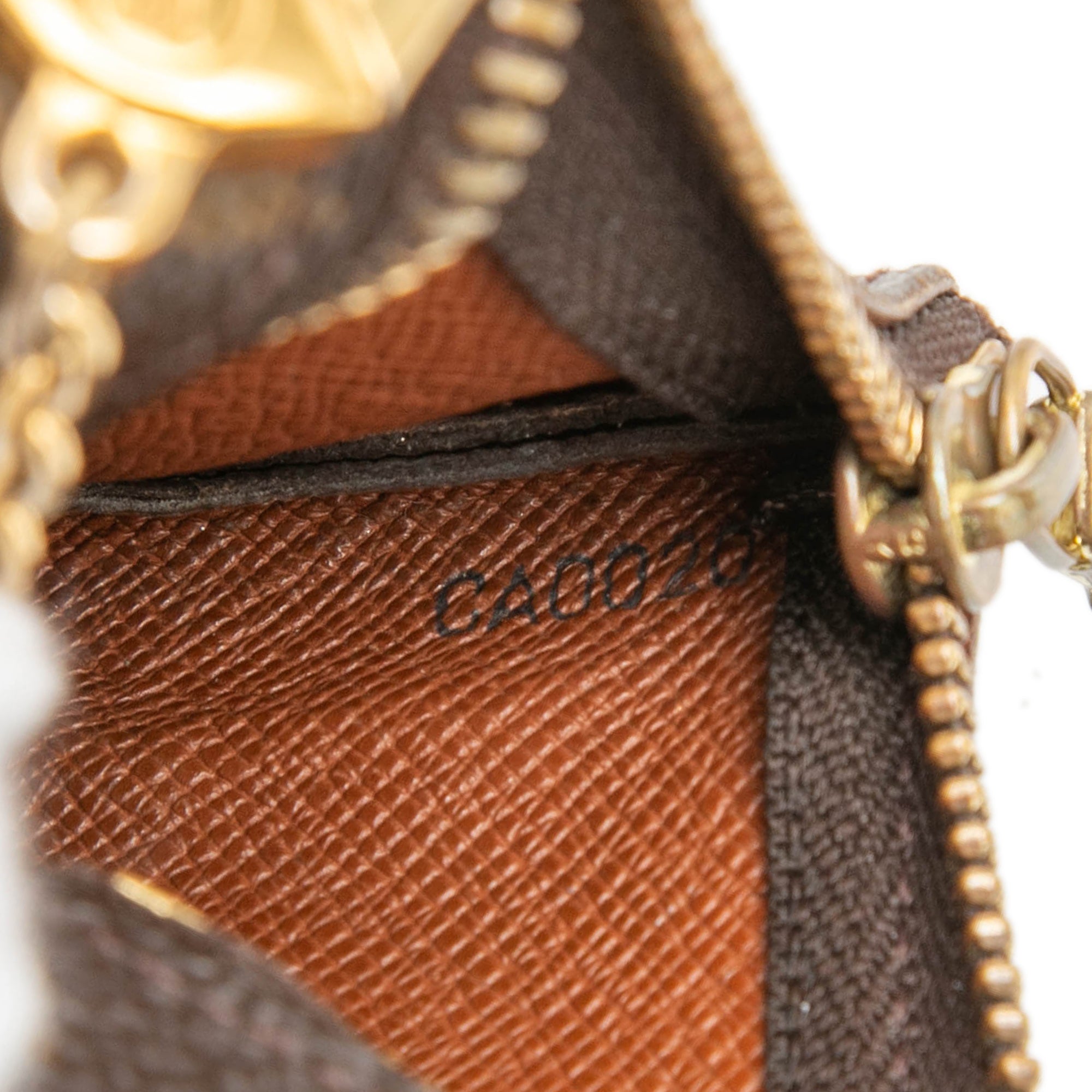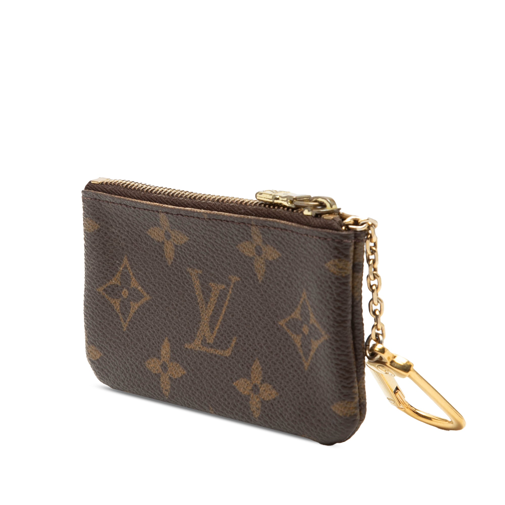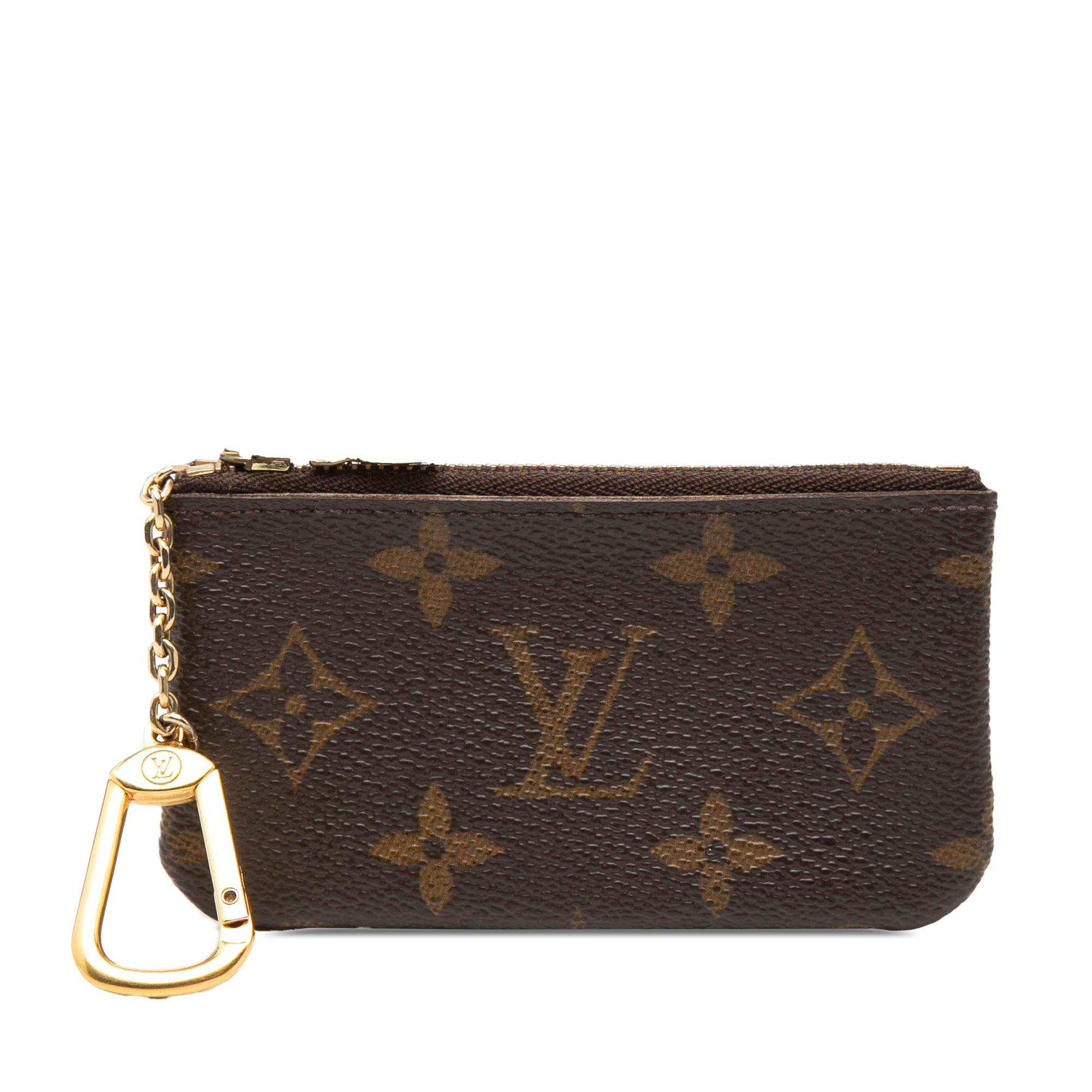 Product Details: Brown Louis Vuitton Monogram Key Pouch. This coin pouch features a monogram canvas body, a top zip closure, and a gold tone chain with hook attachment. 2.4" L x 4.5" W x 0.4" D. Serial number CA0020.