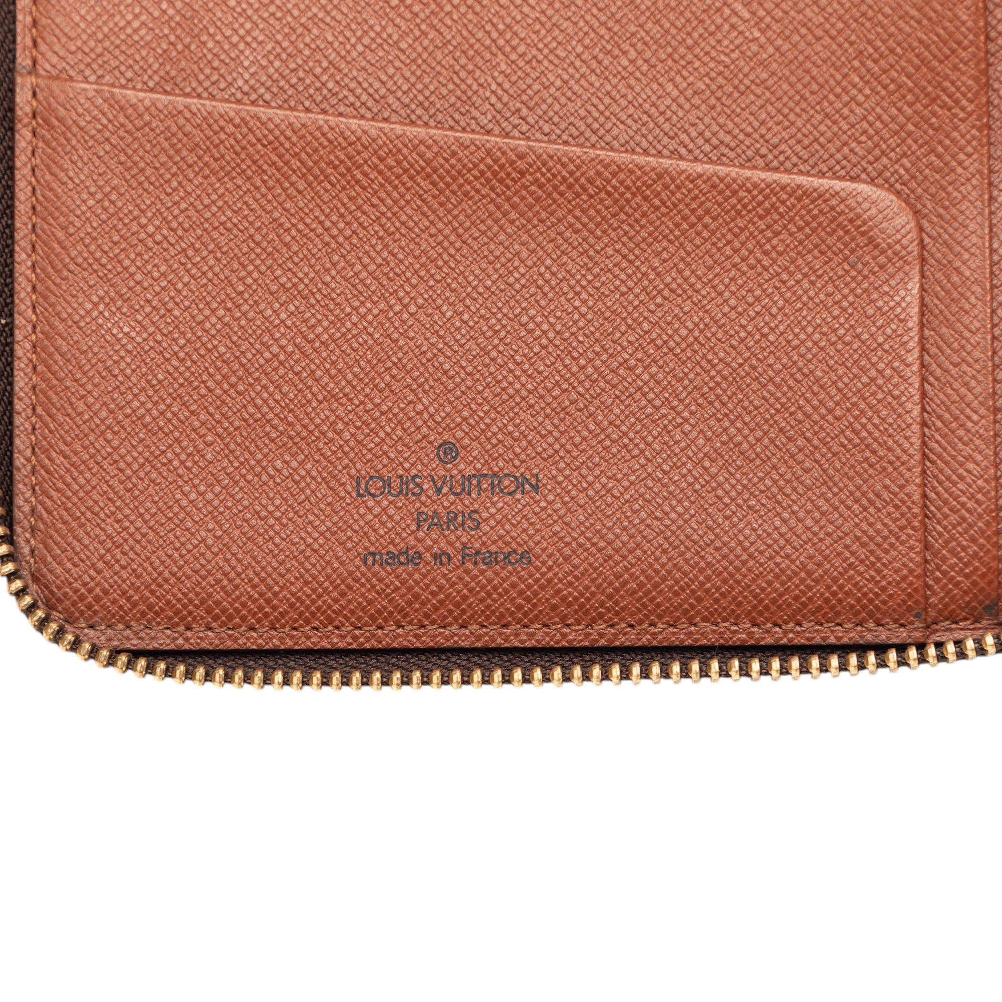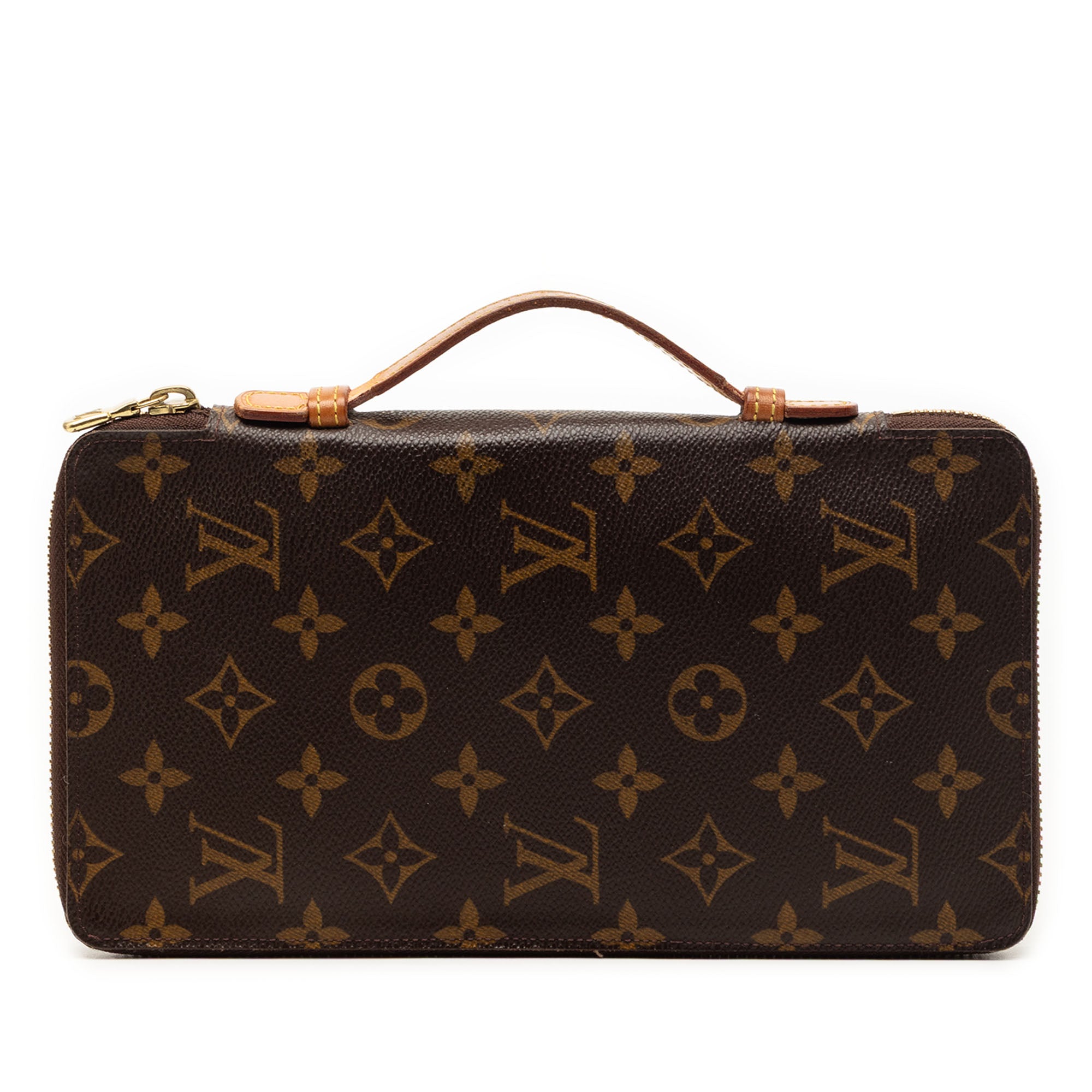 Product Details: Brown Louis Vuitton Monogram Organizer de Voyage. The Organizer de Voyage features a monogram canvas body, flat vachetta leather top handle, a zip around closure, and interior flap and slip pockets. 9.6" L x 5.3" W x 0.8" D, 1" drop. Serial number MI1020.